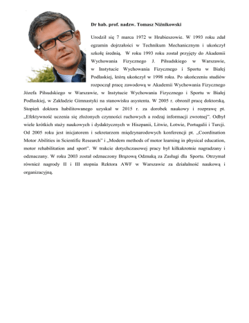 Dr hab. prof. nadzw. Tomasz Niźnikowski Urodził się 7 marca 1972 w Hrubieszowie. W 1993 roku zdał egzamin dojrzałości w Technikum Mechanicznym i ukończył szkołę średnią. W roku 1993 roku został przyjęty do Akademii Wychowania Fizycznego J. Piłsudskiego w Warszawie, w Instytucie Wychowania Fizycznego i Sportu w Białej Podlaskiej, którą ukończył w 1998 roku. Po ukończeniu studiów rozpoczął pracę zawodową w Akademii Wychowania Fizycznego Józefa Piłsudskiego w Warszawie, w Instytucie Wychowania Fizycznego i Sportu w Białej Podlaskiej, w Zakładzie Gimnastyki na stanowisku asystenta. W 2005 r. obronił pracę doktorską. Stopień doktora habilitowanego uzyskał w 2015 r. za dorobek naukowy i rozprawę pt. „Efektywność uczenia się złożonych czynności ruchowych a rodzaj informacji zwrotnej”. Odbył wiele krótkich staży naukowych i dydaktycznych w Hiszpanii, Litwie, Łotwie, Portugalii i Turcji. Od 2005 roku jest inicjatorem i sekretarzem międzynarodowych konferencji pt. „Coordination Motor Abilities in Scientific Research” i „Modern methods of motor learning in physical education, motor rehabilitation and sport”. W trakcie dotychczasowej pracy był kilkakrotnie nagradzany i odznaczany. W roku 2003 został odznaczony Brązową Odznaką za Zasługi dla Sportu. Otrzymał również nagrody II i III stopnia Rektora AWF w Warszawie za działalność naukową i organizacyjną.