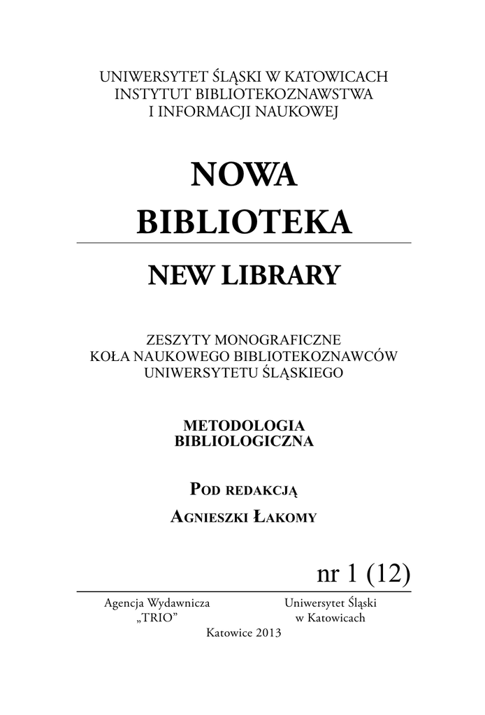 UNIWERSYTET ŚLĄSKI W KATOWICACH INSTYTUT BIBLIOTEKOZNAWSTWA I INFORMACJI NAUKOWEJ NOWA BIBLIOTEKA NEW LIBRARY ZESZYTY MONOGRAFICZNE KOŁA NAUKOWEGO BIBLIOTEKOZNAWCÓW UNIWERSYTETU ŚLĄSKIEGO METODOLOGIA BIBLIOLOGICZNA Pod redakcją Agnieszki Łakomy nr 1 (12) Agencja Wydawnicza Uniwersytet Śląski „TRIO” w Katowicach Katowice 2013 RADA NAUKOWA prof. dr hab. Elżbieta Gondek prof. UŚ dr hab. Mariola Jarczykowa dr hab. Diana Pietruch-Reizes REDAKCJA Agnieszka Bajor Izabela Swoboda Agnieszka Łakomy Małgorzata Caban REDAKCJA JĘZYKOWA Barbara Pytlos KOREKTA TEKSTÓW ANGIELSKICH Jacek Tomaszczyk OPRACOWANIE GRAFICZNE Anna Szczęśniak ADRES REDAKCJI Instytut Bibliotekoznawstwa i Informacji Naukowej Uniwersytet Śląski w Katowicach Pl. Sejmu Śląskiego 1 40-032 Katowice e-mail: [email protected] Copyright by Uniwersytet Śląski w Katowicach Publikacja sfinansowana ze środków Uniwersytetu Śląskiego w Katowicach ISSN 1505-4195 Publikacja recenzowana Zawartość odnotowana w indeksie cytowań CYTBIN Nowa Biblioteka nr 1 (12), 2013 Spis treści Artykuły i komunikaty Zdzisław Gębołyś: BIX – Bibliotheksindex – niemiecki program oceny jakości pracy bibliotek publicznych ................................................................................................... 7 Ilona Czub: Sylwetki bibliofilów Górnego Śląska. Stan badań ................................ 25 Agnieszka Bajor: Metoda typograficzna w pracach bibliograficznych Ludwika Bernackiego i Kazimierza Piekarskiego .................................................................... 37 Stanisław Korfanty: Analiza zawartości prasy jako metoda badań prasoznawczych. Omówienie literatury przedmiotu .............................................................................. 51 Karol Makles: Narzędzia bibliograficzne w badaniach historii prasy, ze szczególnym uwzględnieniem czasopism centralnych związków samorządowych w Drugiej Rzeczypospolitej Polskiej ........................................................................................... 59 Materiały Maria Kycler: Piśmiennictwo krajoznawcze i podróżnicze dotyczące Śląska za lata 1800-1922. Spis bibliograficzny. Część 1 .................................................................. 75 Sprawozdania Oriana Reizes-Dzieduszycka: Wizyta przedstawicieli Instytutu Języka Polskiego Polskiej Akademii Nauk w Stanach Zjednoczonych .............................................. 117 Monika Cwajna: Studyjny wyjazd bibliotekarzy do Wilna, Petersburga, Tallina i Rygi (30 czerwca do 8 lipca 2012 r.) ..................................................................... 119 Małgorzata Caban: Sprawozdanie z pobytu w Centrum Informacji Fachowej Bundeswehry (1 września do 31 października 2012 r.) ........................................... 124 Marlena Gęborska: VII Forum Młodych Bibliotekarzy Biblioteka jako marka (Łódź, 11-12 września 2012 r.) ................................................................................ 128 Justyna Waluś: XVIII Walne Zgromadzenie Federacji Bibliotek Kościelnych FIDES (Opole, 18-20 września 2012 r.) .................................................................. 130 Anna Marcol: II Konferencja Regionalna „Człowiek potrzebuje korzeni i skrzydeł”. Środki przekazu jako czynnik kształtujący kulturę regionu (Katowice, 25 września 2012 r.) ..................................................................................................................... 133 Barbara Maria Morawiec: Międzynarodowa Konferencja Projekt Liberty – Rola Biblioteki Akademickiej w Kształtowaniu Społeczeństwa Obywatelskiego (Katowice, 18-19 października 2012 r.) ....................................................................................... 136 Barbara Maria Morawiec, Adrianna Szefer: Krajowy Kongres Kultury Książki (Katowice, 24-26 października 2012 r.) ..................................................................... 142 Joanna Kaźmierczak: IX Ogólnopolska Konferencja Studenckich Kół Naukowych Biblioteka – Centrum Kultury (Kraków, 23 listopada 2012 r.) .................................. 146 Ewa Poloczek: VI Ogólnopolska Konferencja Studenckich Kół Naukowych Bibliotekoznawców Informacja do zadań specjalnych (Katowice, 5 grudnia 2012 r.) ....... 150 Recenzje i omówienia Paula Gamus: Audiobooki w bibliotece / Aldona Żukowska. – Warszawa : Wydawnictwo Stowarzyszenia Bibliotekarzy Polskich, 2012. – 90 s. : il. ; 21 cm. – (Biblioteczka „Poradnika Bibliotekarza” ; nr 14). – Bibliogr. s. 78-84. – Indeks. – ISBN 978-8361464-89-1.................................................................................................................. 153 Ewelina Makowska: Między dzieciństwem a dorosłością : młodzież w bibliotece / pod red. Anny Marii Krajewskiej. – Warszawa : Stowarzyszenie Bibliotekarzy Polskich, 2012. – 192 s. ; 22 cm. – (Biblioteki, Dzieci, Młodzież ; 3). – ISBN 978-8361464-66-2. ................................................................................................................ 155 Wydarzenia Kalendarium wydarzeń (oprac. Barbara Maria Morawiec) ................................... 158 Table of Contents New Library 2013, no. 1 (12) Articles and Communications Zdzisław Gębołyś: BIX – Library Index – the German Tool for Evaluating Activity Indexes of Public Libraries.......................................................................................... 7 Ilona Czub: Profiles of Bibliophiles in Upper Silesia. The Present State of Research .................................................................................................................................... 25 Agnieszka Bajor: Typographic Method in the Bibliographic Works of Ludwik Bernacki and Kazimierz Piekarski ............................................................................ 37 Stanisław Korfanty: Content Analysis of the Press as a Method of Press Studies