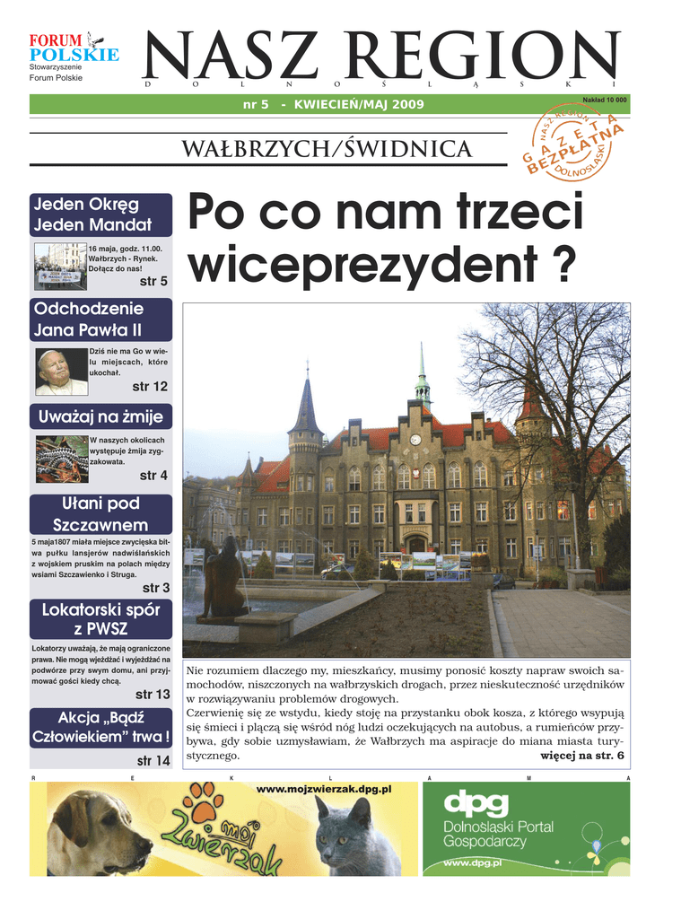 NASZ REGION Stowarzyszenie Forum Polskie D nr 5 O L - KWIECIEŃ/MAJ 2009 N O Ś L Ą S K I Nakład 10 000 WAŁBRZYCH/ŚWIDNICA Jeden Okręg Jeden Mandat 16 maja, godz. 11.00. Wałbrzych - Rynek. Dołącz do nas! str 5 Po co nam trzeci wiceprezydent ? Odchodzenie Jana Pawła II Dziś nie ma Go w wielu miejscach, które ukochał. str 12 Uważaj na żmije W naszych okolicach występuje żmija zygzakowata. str 4 Ułani pod Szczawnem 5 maja1807 miała miejsce zwycięska bitwa pułku lansjerów nadwiślańskich z wojskiem pruskim na polach między wsiami Szczawienko i Struga. str 3 Lokatorski spór z PWSZ Lokatorzy uważają, że mają ograniczone prawa. Nie mogą wjeżdżać i wyjeżdżać na podwórze przy swym domu, ani przyjmować gości kiedy chcą. str 13 Akcja „Bądź Człowiekiem” trwa ! str 14 R E Nie rozumiem dlaczego my, mieszkańcy, musimy ponosić koszty napraw swoich samochodów, niszczonych na wałbrzyskich drogach, przez nieskuteczność urzędników w rozwiązywaniu problemów drogowych. Czerwienię się ze wstydu, kiedy stoję na przystanku obok kosza, z którego wsypują się śmieci i plączą się wśród nóg ludzi oczekujących na autobus, a rumieńców przybywa, gdy sobie uzmysławiam, że Wałbrzych ma aspiracje do miana miasta turystycznego. więcej na str. 6 K L A M A 02 REGION KWIECIEŃ/MAJ Świdnica Wałbrzych Wałbrzych Festiwal filmowy – ruszyła rezerwacja Dziury w jezdni, śmieci na chodnikach Starostwo Powiatowe w Wałbrzychu straciło 18 milionów Można rezerwować miejsca na spotkania i projekcje w ramach II Festiwalu Reżyserii Filmowej. A ten rusza w Świdnicy już 5 maja i potrwa do 9 maja. Wstęp na projekcje i spotkania jest bezpłatny. - Z uwagi na to, że tegoroczne projekcje odbywają się wyłącznie w komfortowych, ale ograniczonych liczbą 315 krzeseł pomieszczeniach Teatru Miejskiego, organizatorzy wprowadzają dla wygody widzów rezer- wacje – mówi Witold Tomkiewicz, dyrektor Świdnickiego Ośrodka Kultury. Rezerwacja dotyczy spotkań w bibliotece oraz pokazów w Teatrze Miejskim. Nie obejmuje pokazów plenerowych. Ogromne dziury w jezdniach na wielu wałbrzyskich ulicach. Góry śmieci na przystankach autobusowych. Z obrzydzeniem i rosnącym zniecierpliwieniem obserwują to mieszkańcy i turyści. Z czterech wniosków złożonych przez Starostwo w ramach Regionalnego Programu Operacyjnego działanie 3.1 przepadły wszystkie. Negatywna ocena wniosków spowodowana była błędami. Oznaczać to będzie koniec planów dotyczących remontów dróg. Starosta powołał odpowiedni zespół, który ma zająć się sprawą i wskazać winnych. Opozycja doma- Zgłoszenia przyjmowane są drogą mailową: [email protected] bądź telefonicznie: 074 852-13-37. Świebodzice Zapraszamy na szlaki rowerowe Źródło: U.M. Świdnica W kwietniu staraniem Wydziału Promocji, Informacji i Współpracy Zagranicznej zakończyła się wielomiesięczna akcja wytyczania i profesjonalnego znaczenia szlaków rowerowych w Świebodzicach i okolicach. Ogółem wyznaczono ponad 65 km szlaków rowerowych, które biegną nie tylko przez teren Świebodzic, ale i gmin ościennych, łącząc się ze szlakami rowerowymi Wałbrzycha. W pierwszej połowie maja w mieście oraz Parku Książańskim staną w sumie cztery tablice informacyjne oraz wydrukowane zostaną mapy turystyki rowerowej. Boguszów Gorce Spłonął Las W pożarze w pobliżu Dzikowca w gminie Boguszów Gorce, spłonęło półtora hektara lasu . Samochody strażackie ze względu na położenie dobniej podpalenie. Akcja wspierana była również dwoma samolotami. Za środek transportu na szczyt góry strażakom służył też wyciąg . ga się kategorycznie dymisji zarządu. Może będzie lepiej i ładniej, gdy obudzą się urzędnicy odpowiedzialni za stan dróg i utrzymanie w czystości miejsc publicznych. To na pewno nie jest dobra wizytówka miasta. Red. źródło: U.M.Świebodzice WAŁBRZYCH Świebodzice Stypendia prezydenta dla artystów terenu nie były wstanie dotrzeć bezpośrednio do miejsca zdażenia. W akcji uczestniczyło 30 strażaków z Wałbrzycha. Przyczyną pożaru było najprawdopo- W kwietniu do poważnych pożarów lasów strażacy wyjeżdżali 8 razy, przeważnie były to podpalenia. Red Nasz Region Dolnośląski Siedziba: ul. Niepodległości 114 Wałbrzych Biuro Ogłoszeń: tel. 604 05 86 85 e-mail [email protected] Redaktor naczelny: Dariusz Gustab Redaguje zespół: Marek Mróz, Anna Skunka (współpraca), Stanisław Sauć Skład: TPNET Tomasz Pawęzka Druk: Drukarnia PolskaPresse Bielany Wrocławskie - Wrocław Kontakt z redakcją: [email protected] Redakcja nie odpowiada za treść reklam Prezydent Wałbrzycha Piotr Kruczkowski przyznał stypendia osobom zajmującym się twórczością artystyczną, upowszechnianiem i ochroną dóbr kultury. Stypendium w wysokości 4 500 zł na drugie półrocze 2009 otrzymali Takis Makandasis oraz Robert Delegiewicz. Takis Makandasis jest twórcą prac malarskich, brał udział w wielu wystawach plastycznych w kraju i za granicą. Ponadto od wielu lat prowadzi w Wałbrzychu społeczną pracownię plastyczną dla dzieci i młodzieży. Przyznane stypendium artysta zamierza przeznaczyć na przygotowanie prac ma- larskich na wystawę z okazji jubileuszu 40 - lecia pracy artystycznej i 20 - lecia działalności społecznej pracowni plastycznej. Robert Delegiewicz to muzyk, aktor i reżyser. Jest współzałożycielem Ogólnopolskiego Teatru William-Es w Wałbrzychu. Występuje w przedstawieniach teatralnych na terenie całego kraju oraz w filmach i audycjach radiowych. Zajmuje się również pracą dydaktyczną. Otrzymane stypendium artysta zamierza przeznaczyć na organizację serii spotkań teatralnych z dziećmi, młodzieżą szkolną, nauczycielami i dyrektorami szkół na temat istoty istnienia teatru i jego zależności od potencjalnej publiczności. WAŁBRZYCH Dodatkowe 3,6 mln zł na bieżące remonty i naprawy O taką kwotę zwiększyły się 