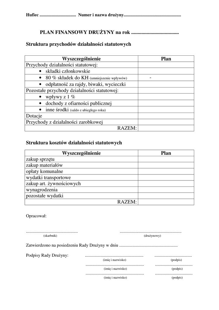 Hufiec ................................. Numer i nazwa drużyny.................................................... PLAN FINANSOWY DRUŻYNY na rok ..................................... Struktura przychodów działalności statutowych Wyszczególnienie Przychody działalności statutowej: • składki członkowskie • 80 % składek do KH (umniejszenie wpływów) • odpłatność za rajdy, biwaki, wycieczki Pozostałe przychody działalności statutowej: • wpływy z 1 % • dochody z ofiarności publicznej • inne środki (saldo z ubiegłego roku) Dotacje Przychody z działalności zarobkowej RAZEM: Plan - Struktura kosztów działalności statutowych Wyszczególnienie Plan zakup sprzętu zakup materiałów opłaty komunalne wydatki transportowe zakup art. żywnościowych wynagrodzenia pozostałe wydatki RAZEM: Opracował: ............................................... ........................................................ (skarbnik) (drużynowy) Zatwierdzono na posiedzeniu Rady Drużyny w dniu ..................................................... Podpisy Rady Drużyny: ..................................................... (imię i nazwisko) ..................................................... (imię i nazwisko) ..................................................... (imię i nazwisko) .................................. (podpis) .................................. (podpis) .................................. (podpis)