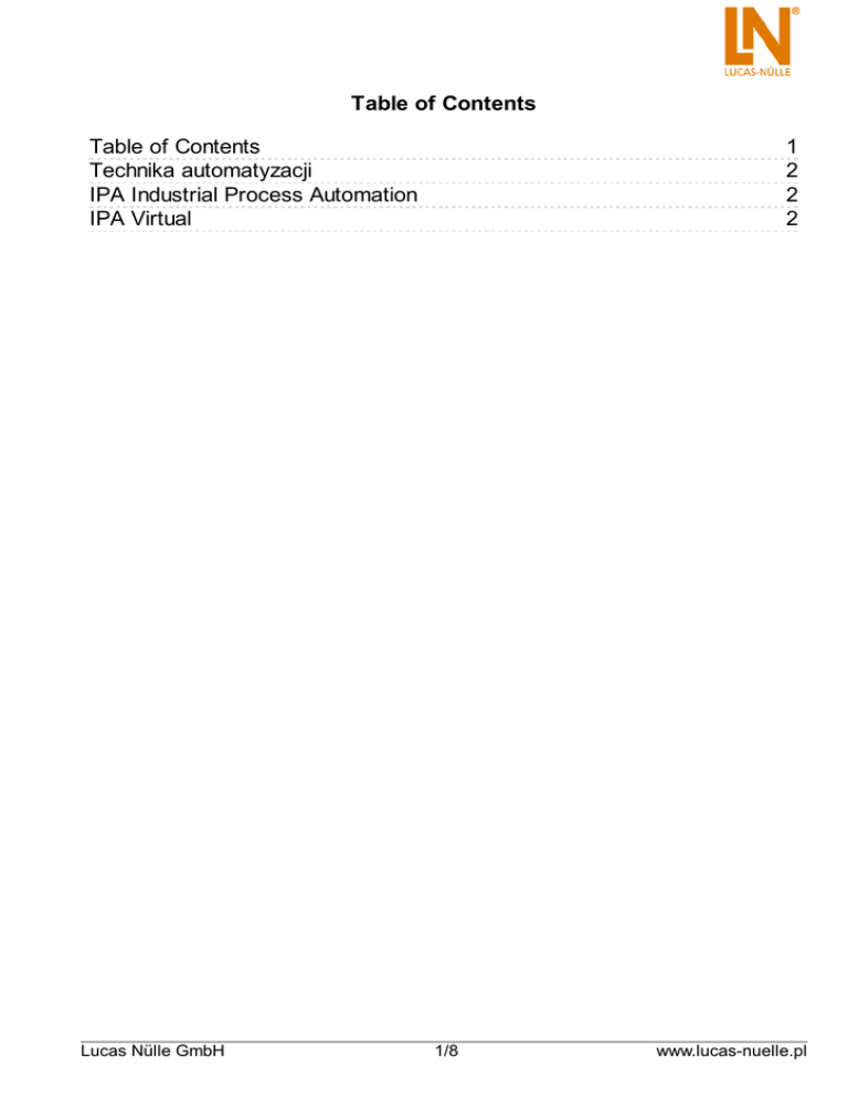 Table of Contents Table of Contents Technika automatyzacji IPA Industrial Process Automation IPA Virtual Lucas Nülle GmbH 1 2 2 2 1/8 www.lucas-nuelle.pl Technika automatyzacji Acquire practical and project-oriented laboratory skills and expertise: Automation trainers, mechatronics trainers, PLC trainers IPA Industrial Process Automation IPA Industrial Process Automation From closed-loop control of individual systems to flexible automation of entire processes, the various courses convey the fundamental, the principles and the properties of components used in automated processing and production plant with the aid of animations and numerous experiments involving authentic equipment. Multiple experiments cover investigation of controlled systems, determination of step responses and optimisation of control loops. Training also covers the use of useful aids such as Bode and Nyquist plots in authentic experiments. Lucas Nülle GmbH 2/8 www.lucas-nuelle.pl IPA Virtual IPA Virtual IPA Virtual is a PC-based, graphic simulation system, which provides the virtual learning environment for the Industrial Process Automation IPA1 training system. The software includes two variations of the model. The first variant is a so-called stand-alone version, in which the model operates with integrated closed-loop controllers and functions without any external control or software. The plotter incorporated into the program can record step responses and from these it is possible to derive parameters for the controllers. These parameters can then be tested using the in-built controllers without the need to use any additional software. In the second version, the virtual model is programmed using Step 7, exactly as an authentic station would be. The virtual model can then be controlled using software called PLCSIM. The system covers all relevant areas from commissioning the compact workstation all the way to control loop optimisation. The program developed to operate the simulation system can be uploaded to work directly with the real compact station. The following process control technology models are integrated into the simulation system: Automatic pressure control Automatic flow-rate control Automatic filling level control Automatic temperature control Automatic cascade control of filling level Wyposazenie podstawowe, w sklad którego wchodzi: Wyposażenie podstawowe, w skład którego wchodzi: Pos. nazwa produktu Lucas Nülle GmbH Bestell-Nr. 3/8 Anz. www.lucas-nuelle.pl 1 IPA wirtualna stacja kompaktowa (licencja szkolna) SO6001-7G 1 IPA Virtual is a PC-based, graphic simulation system, which provides the virtual learning environment for the Industrial Process Automation IPA1 training system. This system is programmed like the real model using STEP 7 and is controlled via the “PLCSIM” software. Furthermore, the model can be operated with the integrated controllers without any additional software. The system covers all relevant areas from commissioning the compact workstation all the way to control loop optimisation. The program developed to operate the simulation system can be uploaded for work directly with the real compact station. The following process control technology models are integrated into the simulation system: Automatic pressure control Automatic flow-rate control Automatic filling level control Automatic temperature control Automatic cascade control of filling level Special features: Parameterisation, programming and commissioning of chemical processing plants Central operation and monitoring of plants and processes Familiarisation with operation and system configuration of a production plant Model realistic malfunctions in process simulations Graphic animation of filling levels and flow rates All of the indicators, like pressure and flow-rate are displayed as values Integrated connection to PLCSIM permits programming with STEP7 Integrated continuous (PID) and discontinuous (twoposition) controller Characteristics plotter records all measured values over time Graphic evaluation of measured values for calculating optimum controller parameters Integrated operator panel including all of the pushbuttons, switches and signalling lights required to operate the system For troubleshooting purposes various malfunctions, for example, defective sensors and actuators can be simulated Lucas Nülle GmbH 4/8 www.lucas-nuelle.pl Simulations are in real time System prerequisites: Personal computer with Windows Vista/7 Professional operating systems, STEP7 Professional (contained in the STEP7 trainer package) CD-ROM harddisk for software installation 250 MB minimum free harddisk memory 2 GB Ram minimum CPU, 2 GHz clock frequency Lucas Nülle GmbH 5/8 www.lucas-nuelle.pl Akcesoria: Pos. nazwa produktu Bestell-Nr. 2 Oprogramowanie szkoleniowe 1x STEP 7 TrainerPackage, 12 x STEP 7, S7-GRAPH, S7-SCL, PLC-Sim (niemiecki, angielski, francuski, hiszpański, włoski) SO6002-1R Anz. 1 Licencja klasowa jako tania alternatywa dla licencji dla pojedynczych użytkowników. Uwaga: tylko dla szkół i ośrodków szkoleniowych w sektorze niekomercyjnym. Oprogramowanie składa się z następujących elementów: 12 x STEP 7 Basis 12 x S7 SCL (Structured Control Language), język wysokiego poziomu typu PASCAL, zoptymalizowany do programowania programowalnych sterowników logicznych 12 x S7-GRAPH, efektywne narzędzie do opisu procesów sekwencyjnych (przebiegi łańcuchowe). Metodyczne podejście i przejrzyste przedstawienie. 12 x S7-HIGRAPH, opis asynchronicznych procesów za pomocą wykresów stanu. Ta prezentacja graficzna nadaje się nie tylko dla programisty PLC, ale także szczególnie zrozumiała dla konstruktora maszyn, specjalisty uruchamiającego maszyny czy inżyniera serwisowego. 12 x S7-PLCSIM; oprogramowanie do testowania utworzonych aplikacji na komputerze PC, niezależnie od dostępności docelowego sprzętu. 60 x oprogramowanie do prac domowych z STEP 7 Basic, S& GRAPH, S7-HIGRAPH i S7-PLCSIM, z ograniczoną lice