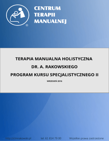 TERAPIA MANUALNA HOLISTYCZNA DR. A. RAKOWSKIEGO PROGRAM KURSU SPECJALISTYCZNEGO II WRZESIEŃ 2016 Moduł II kursu specjalistycznego 4 dni - 48 godzin dydaktycznych Terapii Manualnej Holistycznej dr. A. Rakowskiego, w tym: terapia manualna, autoterapia, terapia edukacyjna. Spis treści: 1. Istotne dla czynności statycznych elementy zdjęć rtg przeglądowych. 2. Zadania diagnostyki radiologicznej w medycynie manualnej holistycznej. 3. Miednica – czynności statyczne, czynności dynamiczne w ocenie radiologicznej. 4. Kręgosłup lędźwiowy – czynności statyczne, czynności dynamiczne w ocenie radiologicznej. 5. Kręgosłup piersiowy – czynności statyczne, czynności dynamiczne w ocenie radiologicznej. 6. Kręgosłup szyjny w odcinku C2 - C7 – czynności statyczne, czynności dynamiczne w ocenie radio logicznej. 7. Połączenie głowowo-szyjne (Cs) – czynności statyczne, czynności dynamiczne w ocenie radiologicznej. 8. Kręgosłup szyjny - techniki badawcze oraz techniki zabiegowe. 9. Techniki zabiegowe dla górnego odcinka piersiowego kręgosłupa. 10. Zespoły czynnościowego przejścia szyjno-piersiowego (C5-Th4 cd.). 11. Terapia Edukacyjna. 12. Autoterapia. Istotne dla czynności statycznych elementy przeglądowych zdjęć rtg Zadania diagnostyki radiologicznej w Terapii Manualnej Holistycznej dr. A. Rakowskiego Miednica – czynności statyczne, czynności dynamiczne w ocenie radiologicznej 1. Anatomia i biomechanika miednicy: elementy kostne miednicy – topografia i ocena radiologiczna budowa stawów krzyżowo-biodrowych cechy ruchomości fizjologicznej skb trudności interpretacyjne rtg w odniesieniu do stawów krzyżowo-biodrowych ustawienie kości krzyżowej budowa stawów biodrowych. 2. Typy miednicy wg Gutmanna za Lewitem i ich charakterystyka pod względem czynności statycznych miednica pośrednia miednica wysoko zasymilowana miednica przeciążeniowa (koksartrotyczna). 3. Interpretacja strukturalna miednicy: ocena strukturalna stawów krzyżowo-biodrowych ocena strukturalna stawów biodrowych © Centrum Terapii Manualnej. www.ctmrakowski.pl 2 ocena strukturalna pozostałych elementów kostnych miednicy 4. Anomalie strukturalne wrodzone i nabyte miednicy zwyrodnienie stawu biodrowego (koksartroza) dysplazja stawu biodrowego stan po endoprotezoplastyce stawu biodrowego ZZSK a ruchomość stawów krzyżowo-biodrowych Inne 5. Ocena czynności statycznych miednicy: cechy nierównowagi statycznej miednicy widoczne na rtg cechy przeciążenia statycznego sskb cechy przeciążenia statycznego stawów biodrowych koksalgia i koksartroza a równowaga statyczna miednicy cechy przeciążenia statycznego grupy kulszowo-goleniowej widoczne na rtg cechy przeciążenia statycznego grupy mięśni przywodzicieli widoczne na rtg 6. Miejsca o zmniejszonej odporności na przeciążenia – spodziewane objawy. 7. Przeciwwskazania do zabiegów biernych z impulsem. 8. Zgodności i niezgodności wyników badania ręcznego z wynikami badania rtg. Kręgosłup lędźwiowy – czynności statyczne, czynności dynamiczne w ocenie radiologicznej 1. Anatomia i biomechanika odcinka lędźwiowego kręgosłupa: 2. Interpretacja strukturalna odcinka lędźwiowego kręgosłupa. 3. Ocena czynności statycznych kręgosłupa lędźwiowego projekcji bocznej i przednio-tylnej (a-p). kształt i kongruencje naturalnych krzywizn odcinka L kręgosłupa 4. Ocena czynności dynamicznych kręgosłupa lędźwiowego - badanie skłonu w przód i w tył - projekcja boczna: radiologiczne cechy biomechaniki skłonu w przód radiologiczne cechy biomechaniki skłonu w tył cechy nadruchomości i ograniczonej ruchomości w poszczególnych segmentach ruchowych kręgosłupa lędźwiowego skłony do boków a rotacje w odcinku L kręgosłupa - prawa Lovett`a. 5. Anomalie strukturalne wrodzone i nabyte w odcinku lędźwiowym kręgosłupa: kręgozmyk rzekomy i kręgozmyk rzeczywisty - diagnostyka różnicująca obydwa rodzaje ześlizgów osteofitoza, syndesmofity lubmalizacja, hemilumbalizacja, sakralizacja i hemisakralizacja – ze stawami rzekomymi lub całkowite niespojenie łuków 6. Miejsca o zmniejszonej odporności na przeciążenia – spodziewane objawy. 7. Przeciwwskazania do mobilizacji biernych z impulsem. 8. Zgodności i niezgodności wyników badania ręcznego z wynikami badania rtg. © Centrum Terapii Manualnej. www.ctmrakowski.pl 3 Kręgosłup piersiowy – czynności statyczne, czynności dynamiczne w ocenie radiologicznej 1. Anatomia i biomechanika odcinka piersiowego kręgosłupa wraz z żebrami. 2. Interpretacja strukturalna odcinka piersiowego kręgosłupa. 3. Ocena czynności statycznych kręgosłupa piersiowego w projekcji bocznej i przednio-tylnej (a-p): kształt i kongruencje naturalnych krzywizn odcinka Th kręgosłupa. 4. Ocena czynności dynamicznych kręgosłupa piersiowego: skłony do boków a rotacje w odcinku Th kręgosłupa - prawa Lovett`a. 5. Anomalie strukturalne wrodzone i nabyte w odcinku piersiowych kręgosłupa: skoliozy czynnościowe: fizjologiczne paradoksalne choroba Scheuermanna żebra 12-te szczątkowe i 13-te dodatkowe 6. Miejsca o zmniejszonej odporności na przeciążenia – spodziewane objawy. 7. Przeciwwskazania do mobilizacji biernych z impulsem. 8. Zgodności i niezgodności wyników badania ręcznego z wynikami badania rtg. Kręgosłup szyjny w odcinku C2 - C7 – czynności statyczne, czynności dynamiczne w ocenie radiologicznej 1. Anatomia i biomechanika odcinka szyjnego kręgosłupa. cechy anatomiczne: wyrostki haczykowate stawy unkowertebralne dysk stawy międzywyrostkowe otwory tętnic kręgowych 2. Interpretacja strukturalna odcinka szyjnego kręgosłupa. 3. Ocena czynności statycznych kręgosłupa szyjnego w projekcji bocznej i przednio-tylnej (a-p): kształt i kongruencje naturalnych krzywizn odcinka C kręgosłupa podwójne szpary stawów międzywyrostkowych w odcinku C kręgosłupa. 4. Ocena czynności dynamicznych kręgosłupa szyjnego - badanie skłonu w pr