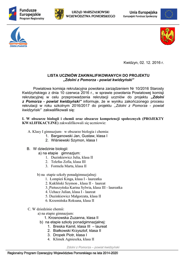 Lista uczniów zakwalifikowanych do projektu Zdolni z Pomorza
