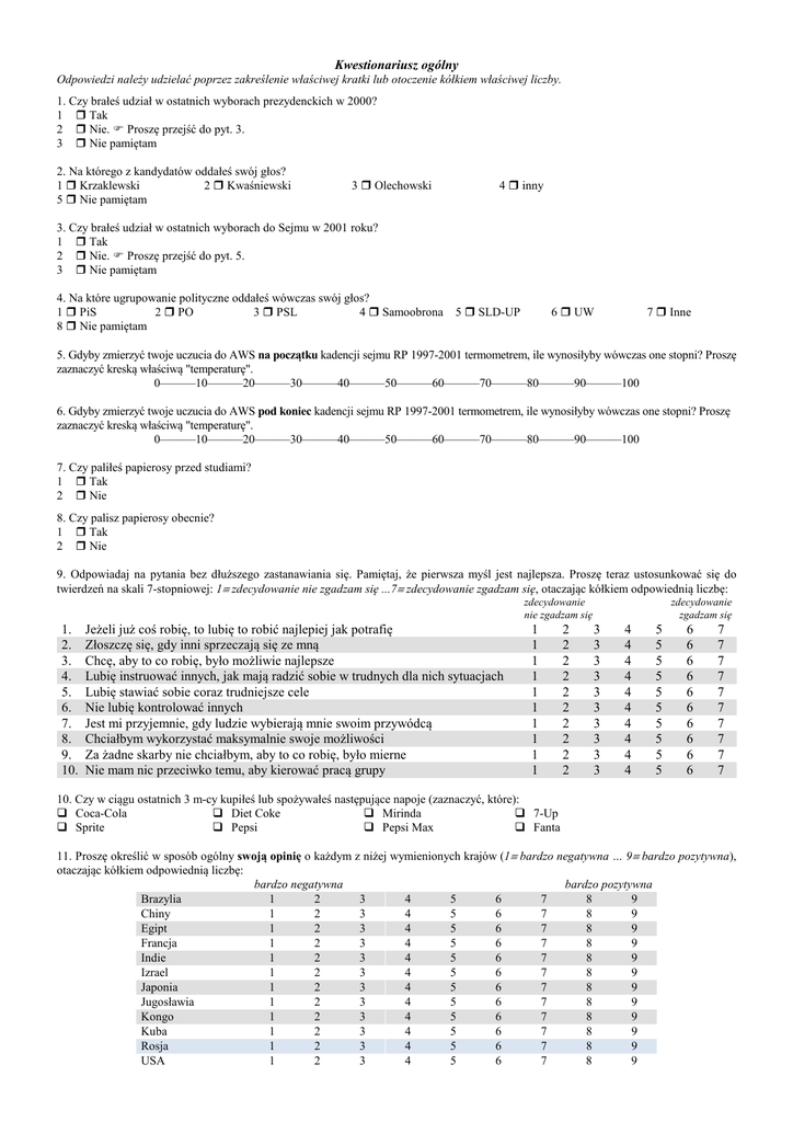 Kwestionariusz ogólny Odpowiedzi należy udzielać poprzez zakreślenie właściwej kratki lub otoczenie kółkiem właściwej liczby. 1. Czy brałeś udział w ostatnich wyborach prezydenckich w 2000? 1 Tak 2 Nie. Proszę przejść do pyt. 3. 3 Nie pamiętam 2. Na którego z kandydatów oddałeś swój głos? 1 Krzaklewski 2 Kwaśniewski 5 Nie pamiętam 3 Olechowski 4 inny 3. Czy brałeś udział w ostatnich wyborach do Sejmu w 2001 roku? 1 Tak 2 Nie. Proszę przejść do pyt. 5. 3 Nie pamiętam 4. Na które ugrupowanie polityczne oddałeś wówczas swój głos? 1 PiS 2 PO 3 PSL 4 Samoobrona 8 Nie pamiętam 5 SLD-UP 6 UW 7 Inne 5. Gdyby zmierzyć twoje uczucia do AWS na początku kadencji sejmu RP 1997-2001 termometrem, ile wynosiłyby wówczas one stopni? Proszę zaznaczyć kreską właściwą "temperaturę". 0––––––10––––––20––––––30––––––40––––––50––––––60––––––70––––––80––––––90––––––100 6. Gdyby zmierzyć twoje uczucia do AWS pod koniec kadencji sejmu RP 1997-2001 termometrem, ile wynosiłyby wówczas one stopni? Proszę zaznaczyć kreską właściwą "temperaturę". 0––––––10––––––20––––––30––––––40––––––50––––––60––––––70––––––80––––––90––––––100 7. Czy paliłeś papierosy przed studiami? 1 Tak 2 Nie 8. Czy palisz papierosy obecnie? 1 Tak 2 Nie 9. Odpowiadaj na pytania bez dłuższego zastanawiania się. Pamiętaj, że pierwsza myśl jest najlepsza. Proszę teraz ustosunkować się do twierdzeń na skali 7-stopniowej: 1≡ zdecydowanie nie zgadzam się ...7≡ zdecydowanie zgadzam się, otaczając kółkiem odpowiednią liczbę: zdecydowanie nie zgadzam się 1. 2. 3. 4. 5. 6. 7. 8. 9. 10. Jeżeli już coś robię, to lubię to robić najlepiej jak potrafię Złoszczę się, gdy inni sprzeczają się ze mną Chcę, aby to co robię, było możliwie najlepsze Lubię instruować innych, jak mają radzić sobie w trudnych dla nich sytuacjach Lubię stawiać sobie coraz trudniejsze cele Nie lubię kontrolować innych Jest mi przyjemnie, gdy ludzie wybierają mnie swoim przywódcą Chciałbym wykorzystać maksymalnie swoje możliwości Za żadne skarby nie chciałbym, aby to co robię, było mierne Nie mam nic przeciwko temu, aby kierować pracą grupy 1 1 1 1 1 1 1 1 1 1 2 2 2 2 2 2 2 2 2 2 zdecydowanie zgadzam się 3 3 3 3 3 3 3 3 3 3 4 4 4 4 4 4 4 4 4 4 5 5 5 5 5 5 5 5 5 5 6 6 6 6 6 6 6 6 6 6 7 7 7 7 7 7 7 7 7 7 10. Czy w ciągu ostatnich 3 m-cy kupiłeś lub spożywałeś następujące napoje (zaznaczyć, które): Coca-Cola Diet Coke Mirinda 7-Up Sprite Pepsi Pepsi Max Fanta 11. Proszę określić w sposób ogólny swoją opinię o każdym z niżej wymienionych krajów (1≡ bardzo negatywna … 9≡ bardzo pozytywna), otaczając kółkiem odpowiednią liczbę: bardzo negatywna bardzo pozytywna Brazylia 1 2 3 4 5 6 7 8 9 Chiny 1 2 3 4 5 6 7 8 9 Egipt 1 2 3 4 5 6 7 8 9 Francja 1 2 3 4 5 6 7 8 9 Indie 1 2 3 4 5 6 7 8 9 Izrael 1 2 3 4 5 6 7 8 9 Japonia 1 2 3 4 5 6 7 8 9 Jugosławia 1 2 3 4 5 6 7 8 9 Kongo 1 2 3 4 5 6 7 8 9 Kuba 1 2 3 4 5 6 7 8 9 Rosja 1 2 3 4 5 6 7 8 9 USA 1 2 3 4 5 6 7 8 9 12. Proszę określić w sposób ogólny opinię przeciętnego obywatela Polski o każdym z niżej wymienionych krajów (1≡ bardzo negatywna … 9≡ bardzo pozytywna), otaczając kółkiem odpowiednią liczbę: bardzo negatywna bardzo pozytywna Brazylia 1 2 3 4 5 6 7 8 9 Chiny 1 2 3 4 5 6 7 8 9 Egipt 1 2 3 4 5 6 7 8 9 Francja 1 2 3 4 5 6 7 8 9 Indie 1 2 3 4 5 6 7 8 9 Izrael 1 2 3 4 5 6 7 8 9 Japonia 1 2 3 4 5 6 7 8 9 Jugosławia 1 2 3 4 5 6 7 8 9 Kongo 1 2 3 4 5 6 7 8 9 Kuba 1 2 3 4 5 6 7 8 9 Rosja 1 2 3 4 5 6 7 8 9 USA 1 2 3 4 5 6 7 8 9 12. Proszę o uporządkowanie marek samochodów od najbardziej preferowanych do najmniej preferowanych, przypisując im odpowiednio numerki od 1 do 10: Audi BMW Fiat Ford Mercedes Peugeot Renault Toyota Volksvagen Volvo 9. Odpowiadaj na pytania bez dłuższego zastanawiania się. Pamiętaj, że pierwsza myśl jest najlepsza. Proszę teraz ustosunkować się do twierdzeń na skali 7-stopniowej: 1≡ zdecydowanie nie zgadzam się ...7≡ zdecydowanie zgadzam się, otaczając kółkiem odpowiednią liczbę: zdecydowanie nie zgadzam się 1. 2. 3. 4. 5. 6. 7. 8. 9. 10. Wszystkie zagraniczne samochody wyglądają tak samo W zasadzie powinno się kupować polskie samochody Zagraniczne samochody są za duże Samochody z Polski są równie dobrze wykonane Ogólnie rzecz biorąc zagraniczne samochody są za drogie W zagranicznych samochodach stosuje się „obcą technologię” Zagranicznym samochodom brakuje osobowości Zagraniczne samochody nie są lepsze jakościowo Zagraniczne samochody nie mają „duszy” Zagraniczne samochody nie są lepsze od polskich 1 1 1 1 1 1 1 1 1 1 2 2 2 2 2 2 2 2 2 2 zdecydowanie zgadzam się 3 3 3 3 3 3 3 3 3 3 4 4 4 4 4 4 4 4 4 4 5 5 5 5 5 5 5 5 5 5 6 6 6 6 6 6 6 6 6 6 7 7 7 7 7 7 7 7 7 7 14. Jak często kierujesz się w ocenie jakości samochodu niżej wymienionymi cechami? Proszę zaznaczyć tylko jedną kratkę w przypadku każdej cechy: Cechy: Stale Bardzo często Często Czasami Nigdy 1 producent 5 4 3 2 1 2 cena 5 4 3 2 1 3 zużycie paliwa 5 4 3 2 1 4 moc silnika 5 4 3 2 1 5 pojemność bagażnika 5 4 3 2 1 15. Proszę o podanie danych demograficznych (i nie tylko), które będą wykorzystane do zbiorowych analiz porównawczych wyników: Płeć: 1 M 2 K Wiek _________ lat Waga _________ kg Wzrost _________ cm Kolor włosów _______________________________ Kolor oczu __________________________________ Kierunek studiów ____________________________ Rok studiów: _________ Miejsce zamieszkania rodziców: 1 wieś; 2 miasto do 20 tys.; 3 miasto 20 tys. -100 tys.; 4 miasto pow. 100 tys. Liczba mieszkańców w miejscowości, gdzie mieszkają/li ostatnio rodzice _________ tys. Sumaryczna liczba lat nau