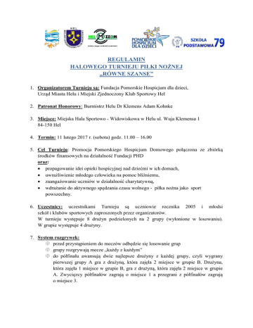 REGULAMIN HALOWEGO TURNIEJU PIŁKI NOŻNEJ „RÓWNE SZANSE” 1. Organizatorem Turnieju są: Fundacja Pomorskie Hospicjum dla dzieci, Urząd Miasta Helu i Miejski Zjednoczony Klub Sportowy Hel 2. Patronat Honorowy: Burmistrz Helu Dr Klemens Adam Kohnke 3. Miejsce: Miejska Hala Sportowo - Widowiskowa w Helu ul. Wuja Klemensa 1 84-150 Hel 4. Termin: 11 lutego 2017 r. (sobota) godz. 11.00 – 16.00 5. Cel Turnieju: Promocja Pomorskiego Hospicjum Domowego połączona ze zbiórką środków finansowych na działalność Fundacji PHD oraz: propagowanie idei opieki hospicyjnej nad dziećmi w ich domach, uwrażliwienie młodego człowieka na pomoc bliźniemu, zaangażowanie uczniów w działalność charytatywną, wdrażanie do aktywnego spędzania czasu wolnego - piłka nożna jako sport powszechny. 6. Uczestnicy: uczestnikami Turnieju są uczniowie rocznika 2005 i młodsi szkół i klubów sportowych zaproszonych przez organizatorów. W turnieju występuje 8 drużyn podzielonych na 2 grupy (wyłonione w losowaniu). W grupie występuje 4 drużyny. 7. System rozgrywek: przed przystąpieniem do meczów odbędzie się losowanie grup grupy rozgrywają mecze „każdy z każdym” do półfinału awansują dwie najlepsze drużyny z każdej grupy, czyli wygrany pierwszej grupy A gra z drużyną, która zajęła 2 miejsce w grupie B. Drużyna, która zajęła 1 miejsce w grupie B, gra z drużyną, która zajęła 2 miejsce w grupie A. Zwycięzcy półfinałów zagrają o miejsce 1 a przegrani z półfinałów zagrają o miejsce 3. 8. Warunki uczestnictwa: warunkiem uczestnictwa w Turnieju jest przesłanie pisemnego zgłoszenia drużyny (karta zgłoszeniowa) do dnia 10 lutego 2017r. podpisaną przez kierownika, trenera/opiekuna grupy. 9. Zgłoszenia drużyn: Marek Furgoł 694-457-429 [email protected] Norbert Górski 694-533-389 [email protected] 10. W czasie meczów obowiązuje strój sportowy obuwie zmienne halowe. 11. Zasady gry: - drużyna składa się maksymalnie z 10 osób + trener/opiekun; - zawodnik ma prawo startu tylko w jednej drużynie; - po zgłoszeniu zawodnika do jednej drużyny, nie może on przejść do drugiej drużyny; - na boisku jednocześnie przebywa 5 zawodników (4 w polu gry + bramkarz); - podczas spotkania trener/opiekun drużyny i zawodnicy rezerwowi zajmują miejsca na ławkach w strefie zmian; - zawodnicy opuszczający i wchodzący na boisko muszą przekroczyć linię boczną w obrębie strefy zmian jego drużyny; - czas meczu zostanie ustalony przed rozpoczęciem turnieju w zależności od zgłoszonych drużyn; - czas trwania każdej połowy winien być przedłużony, aby umożliwić wykonanie ewentualnego rzutu karnego; - przy rażącym przewinieniu zawodnika sędzia będzie udzielał od 1 – do 3 minut kary; oraz żółtą kartkę. Otrzymanie kartki czerwonej wyklucza zawodnika z gry w tym meczu. Druga żółta kartka dla zawodnika oznacza automatycznie kartkę czerwoną. Zawodnik wykluczony nie może powrócić do gry. Zawodnik rezerwowy może wejść do gry po upływie 2 minut od wykluczenia współpartnera, o ile wcześniej drużyna osłabiona nie straci bramki. W takim przypadku: jeżeli 4 zawodników gra przeciwko 5 i tracą bramkę, mogą uzupełnić skład; jeżeli obie drużyny mają po 4 zawodników i pada bramka – nie uzupełniają składu; jeżeli 3 zawodników gra przeciwko 4 lub 5 i traci bramkę – mogą uzupełnić skład tylko o 1 zawodnika; jeżeli obie drużyny mają po 3 zawodników i pada bramka – nie uzupełniają składu; jeżeli drużyna grająca w osłabieniu strzela bramkę, nie uzupełnia składu przed upływem 2 minut od chwili wykluczenia zawodnika. Uzupełnienie składu wymaga zgody sędziego czasowego, a w razie jego braku, drugiego sędziego; - za rażące naruszenia regulaminu turnieju oraz Miejskiej Hali Sportowo - Widowiskowej w Helu organizatorzy mają prawo wykluczyć zawodnika lub całą drużynę z turnieju auty wykonywane z linii autowych z obu stron boiska, piłka odbita od sufitu – to wznowienie gry z linii autowej; - bramkarz ma prawo wznowić grę wyrzutem ręką, aż pod bramkę drużyny przeciwnej; - liczba zmian podczas meczu jest nieograniczona; - bramkarz może zamienić się miejscami z zawodnikiem z pola; Punktacja za zwycięstwo - 3 punkty, za remis - 1 punkt, za przegraną - 0 punktów, w przypadku remisu (konieczność wyłonienia zwycięzcy) rozgrywana jest 2 minutowa dogrywka, a następnie seria rzutów karnych po 3 strzały, o kolejności zajmowanych miejsc decyduje: liczba zdobytych punktów; wynik bezpośredniego spotkania; ilość zdobytych bramek między zainteresowanymi drużynami; ilość straconych bramek między zainteresowanymi drużynami; drużyny powinny występować w jednakowych koszulkach (znacznikach); opiekun drużyny jest odpowiedzialny za pobyt uczniów na boisku i poza nim; 12. Postanowienia końcowe: Organizatorzy zapewniają: obsługę sędziowską opiekę medyczną prowadzenie dokumentacji rozgrywek prowadzącego turniej Organizator nie ponosi odpowiedzialności z tytułu odszkodowania za zaginione mienie i przedmioty osobiste uczestników rozgrywek Uczestnicy Turnieju ubezpieczają się na koszt własny (bądź są objęci ubezpieczeniem z polisy własnej szkoły, klubu) Ostateczną decyzję w sprawach spornych podejmuje główny organizator Turnieju.