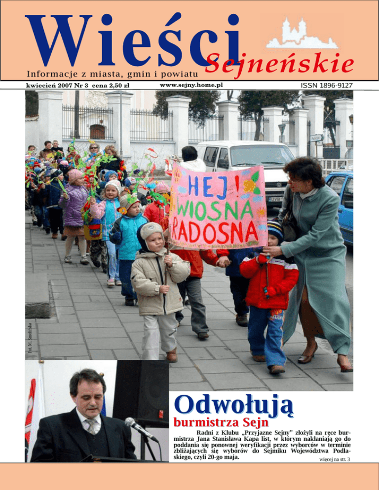 Inform acje z m ias ta, gm in i pow iatu Fot. M . Sm olińs k a ISSN 189 6-9 127 O d w ołu ją b u r m is tr z a Se jn R ad ni z K l ub u „Przyjazne Se jny” złożyl i na ręce b urm istrza Jana Stanisław a K apa l ist, w k tórym nak łaniają go d o pod d ania się ponow ne j w e ryfik acji prze z w yb orców w te rm inie zb l iżających się w yb orów d o Se jm ik u W ojew ód ztw a Pod l ask ie go, czyl i 20-go m aja. w ięce jna str. 3 R ol n ik u ! •Ch ce s z s k or z y s taćz d otacji u n ijn ych ? •Potr z e b u je s z porad y ? Pom oże m y w w y pe łn ie n iu w n ios k u m .in . n a: •d opłaty b e z pośr e d n ie (GPS, w y d r u k i m ap) •pr ogram y r ol n ośr od ow is k ow e •in w e s tycje w gos pod ar s tw ach r ol n ych •u łatw ie n ie s tar tu m łod y m r ol n ik om •r óżn icow an ie d z iałal n ości poz ar ol n icz e j •m ik r opr z e d s ięb ior s tw a O fe r u je m y r ów n ie ż s pr z e d aż i m on taż pr z y d om ow ych i pr z y z agr od ow ych ocz y s z cz al ni ście k ów . Z głoś s ię d o nas – pom oże m y. O d d w óch l atd ziałam y na ty m te re nie Służy m y fach ow ąporad ą. Strona 2 Z apras z am y d o b iu ra w Se jn ach „SM O LIŃSK I” K an ce l ar ia Praw n o- Gos pod ar cz a ul . Słow ack ie go 3 (z a Sy n agogą) w god z . 9 .00 - 17.00 te l . (087) 516 24 87 0 500 025 437 W ie ści Se jne ńs k ie R ad ni z K l ub u „Przyjazne Se jny” złożyl i na ręce b urm istrza Jana Stanisław a K apa l ist, w k tórym nak łaniają go d o pod d ania się ponow ne j w e ryfik acji prze z w yb orców w te rm inie zb l iżających się w yb orów d o Se jm ik u W oje w ód ztw a Pod l ask ie go, czyl i 20-go m aja. – K ie row al iśm y s ię prostą prze s łank ą. W k ażde j pryw atne j firm ie os oba, k tóra z pow odu 30 czy k ilkudzie s ięciu złotych naraziłaby m ias to na s traty finans ow e , straciłaby zaufanie – w yjaśnia Ark adius z Now al s k i, przew odniczący K lubu R adnych „Przyjazne Se jny”. W s pom niane 30 zł s tało s ię przyczyną porażk i s ądow e j w proce s ie z W ojew ódzk im Prze ds iębiorstw e m Re alizacji Inw e stycji. Z pow odu nie zapłace nia opłaty s ądow e j w w yże j w ym ie nione j w ys ok ości, s ąd odrzuciłape lację M iasta Se jny od w yrok u nak azujące go s płatę W PR I ponad 3 m ln zł. Kons e k w e ncje s ą odczuw ane w dalszych s ądow ych zm aganiach – 30 zł zam k nęło po części inne m ożliw e drogi odw ołania s ię od w yrok u. Nie pom ogło w yznacze nie prze z s uw alsk i s ąd k olejne go te rm inu na w nie s ie nie ape lacji – pod k onie c m arca Sąd Ape lacyjny w Białym s tok u uznał to za be zpodstaw ne i nie rozpatryw ałodw ołania od w yrok u. Se jnom pozos tała ape l acja do Sądu Najw yżs ze go „W zw iązk u z zais tnie nie m po te rm inie ostatnich w yborów s am orządow ych fak tów , k tóre w znaczący s pos ób w pływ ają na l os y Se jn i ich O byw ate li oraz w be zpośre dni s pos ób m ają zw iąze k z jak ością w yk onania prze z Pana Burm istrza pow ie rzone go prze z W yborców m andatu zw racam y s ię z prośbą o dobrow olne poddanie s ię ponow ne j w e ryfik acji w yborcze j. W te n s pos ób, be z narażania środk ów publicznych , w yborcy będą m ogli s am odzie l nie i bardzie j św iadom ie podjąć de cyzję o najl e ps ze j obs adzie pe rs onalne j stanow is k a Burm istrza M ias ta Se jny. Pana dobrow olna de cyzja be z w ątpie nia w płynie na w zrost zaufania s połe czne go do instytucji s am orządow ych i de m ok ratycznych proce dur s połe cze ństw a obyw ate l s k ie go. M oże te ż przynie ść w zm ocnie nie pozycji now ow ybrane go Burm istrza M iasta Se jny w ne gocjacjach i pracach zw iązanych z zaże gnanie m nie be zpie cze ństw a zah am ow ania rozw oju m iasta na ok re s k ilku Nr 3 pok ol e ń. Nie be z znacze nia je st w artość Pana postaw y w obe c te j prośby. Stanow ić będzie ona jas ny i czyte lny k om unik at o otw artości w ładz Nas ze go M iasta i Pana os obistym stos unk u do najw ięk s zych os iągnięć ok re s u po odzys k aniu prze z Nas z K raj s uw e re nności w 19 89 r. – podm iotow ości O byw ate li i ich be zpośre dnie go w pływ u na k s ztałt R ze czpos polite j” – czytam y w liście radnych Ark adius za Now alsk ie go, R afała Sław ińs k ie go i M arcina Szlegie ra. Przyznają, że m ają cich e poparcie k ilku innych radnych . W s e jne ńs k ie j radzie z k ażdym pos ie dze nie m k om is ji czy obradam i s e s ji pogłębia s ię podział i pojaw iają s ię no- ch cą po porostu zabłys nąć w s połe cze ńs tw ie s e jne ńs k im jak o prze ciw nicy K apa, przy ok azji s ie jąc nie dorze czność. D ziałania tych panów w R adzie M iasta od s am e go początk u nas taw ione s ą na głos ze nie populizm u i s ianie fe rm e ntu. W ych odzi tu zw yk ła nie ch ęć do burm is trza. Stos ują w s ze lkie m etody i s pos oby, aby m u dok uczyć. Z astanaw iam s ię, co je s zcze cie k aw e go w ym yślą. Jak o były ich nauczycie lje s te m zaże now any ich pos taw ą w R adzie M iasta. Po pros tu s ię za nich w s tydzę. M im o w s zystk o m am nadzie ję, że w k ońcu zm ądrze ją i zaczną rze czyw iście , k onstruk tyw nie działać na rze cz Se jn. Te go ocze k ująod nich w yborcy. O ile burm istrz s am nie us tąpi ze stanow is k a, „Ustaw a o s am orządzie gm innym ” ze zw ala R adzie na Ark adius z Now alsk i rozpis anie re fe re ndum w śród m ie s zk ańców w s praw ie odw ołania burm is trza dopie ro po upływ ie 9 m ie s ięcy od dnia w yboru burm is trza na stanow is k o. W św ietle praw a rada m oże podjąć uch w ałę o re fe re ndum , na w nios e k 1/4 ustaw ow e go s k ładu rady (w przypadk u Se jn – na w nios e k 4 radnych ). Z a re fe re ndum m us i głos ow ać 3/5 R ady (w Se jnach – 9 radnych ). Re fe re ndum m oże zos tać rozpis ane rów nie ż w w ynik u 