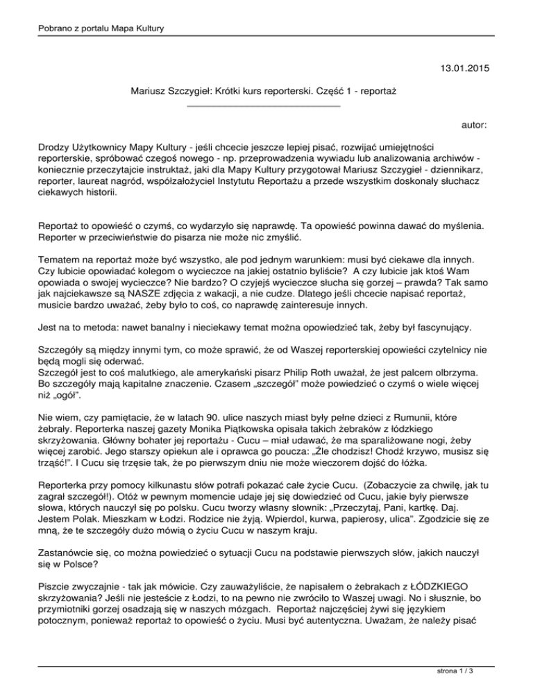 Pobrano z portalu Mapa Kultury 13.01.2015 Mariusz Szczygieł: Krótki kurs reporterski. Część 1 - reportaż ____________________________ autor: Drodzy Użytkownicy Mapy Kultury - jeśli chcecie jeszcze lepiej pisać, rozwijać umiejętności reporterskie, spróbować czegoś nowego - np. przeprowadzenia wywiadu lub analizowania archiwów koniecznie przeczytajcie instruktaż, jaki dla Mapy Kultury przygotował Mariusz Szczygieł - dziennikarz, reporter, laureat nagród, współzałożyciel Instytutu Reportażu a przede wszystkim doskonały słuchacz ciekawych historii. Reportaż to opowieść o czymś, co wydarzyło się naprawdę. Ta opowieść powinna dawać do myślenia. Reporter w przeciwieństwie do pisarza nie może nic zmyślić. Tematem na reportaż może być wszystko, ale pod jednym warunkiem: musi być ciekawe dla innych. Czy lubicie opowiadać kolegom o wycieczce na jakiej ostatnio byliście? A czy lubicie jak ktoś Wam opowiada o swojej wycieczce? Nie bardzo? O czyjejś wycieczce słucha się gorzej – prawda? Tak samo jak najciekawsze są NASZE zdjęcia z wakacji, a nie cudze. Dlatego jeśli chcecie napisać reportaż, musicie bardzo uważać, żeby było to coś, co naprawdę zainteresuje innych. Jest na to metoda: nawet banalny i nieciekawy temat można opowiedzieć tak, żeby był fascynujący. Szczegóły są między innymi tym, co może sprawić, że od Waszej reporterskiej opowieści czytelnicy nie będą mogli się oderwać. Szczegół jest to coś malutkiego, ale amerykański pisarz Philip Roth uważał, że jest palcem olbrzyma. Bo szczegóły mają kapitalne znaczenie. Czasem „szczegół” może powiedzieć o czymś o wiele więcej niż „ogół”. Nie wiem, czy pamiętacie, że w latach 90. ulice naszych miast były pełne dzieci z Rumunii, które żebrały. Reporterka naszej gazety Monika Piątkowska opisała takich żebraków z łódzkiego skrzyżowania. Główny bohater jej reportażu - Cucu – miał udawać, że ma sparaliżowane nogi, żeby więcej zarobić. Jego starszy opiekun ale i oprawca go poucza: „Źle chodzisz! Chodź krzywo, musisz się trząść!”. I Cucu się trzęsie tak, że po pierwszym dniu nie może wieczorem dojść do łóżka. Reporterka przy pomocy kilkunastu słów potrafi pokazać całe życie Cucu. (Zobaczycie za chwilę, jak tu zagrał szczegół!). Otóż w pewnym momencie udaje jej się dowiedzieć od Cucu, jakie były pierwsze słowa, których nauczył się po polsku. Cucu tworzy własny słownik: „Przeczytaj, Pani, kartkę. Daj. Jestem Polak. Mieszkam w Łodzi. Rodzice nie żyją. Wpierdol, kurwa, papierosy, ulica”. Zgodzicie się ze mną, że te szczegóły dużo mówią o życiu Cucu w naszym kraju. Zastanówcie się, co można powiedzieć o sytuacji Cucu na podstawie pierwszych słów, jakich nauczył się w Polsce? Piszcie zwyczajnie - tak jak mówicie. Czy zauważyliście, że napisałem o żebrakach z ŁÓDZKIEGO skrzyżowania? Jeśli nie jesteście z Łodzi, to na pewno nie zwróciło to Waszej uwagi. No i słusznie, bo przymiotniki gorzej osadzają się w naszych mózgach. Reportaż najczęściej żywi się językiem potocznym, ponieważ reportaż to opowieść o życiu. Musi być autentyczna. Uważam, że należy pisać strona 1 / 3 Pobrano z portalu Mapa Kultury tak jakby się opowiadało daną historię siostrze, bratu, mamie, tacie, swojej dziewczynie czy chłopakowi. A przecież nigdy nie powiecie siostrze: „Wiesz, on pracował na łódzkim skrzyżowaniu. Powiemy: „Pracował na skrzyżowaniu w Łodzi” albo „Pracował w Łodzi na skrzyżowaniu”. (Zastanówcie się, który szyk zdania brzmi lepiej). Często w telewizji dziennikarze wygłaszają napisane wcześniej teksty i mówią np., że „starogardzka prokuratura umorzyła śledztwo”, a my zastanawiamy się, jaka prokuratura? Gdzie? Stara prokuratura? Białogardzka prokuratura? Piszmy najprościej i najczytelniej: „Prokuratura w Starogardzie…”. Nie „pojazd uderzył w drzewo”, bo nie jesteśmy urzędnikami, tylko „opel roztrzaskał się na wielkim dębie”. Nie stwierdzajmy, tylko opisujmy. Nie „był zdenerwowany”, tylko „walił głową o biurko”. Reportaż nie jest wypracowaniem szkolnym. W dziedzinie reportażu władza Waszych polonistek nie ma mocy prawnej. Nie musicie reportażu o pani, która na osiedlu karmi koty i spotykają ją przez to przykrości, zaczynać od wstępu jak w wypracowaniu o Janie Kochanowskim: „Janina Kochanowska jest jedną z najaktywniejszych karmicielek kotów na osiedlu Renesansowym. Ta wybitna przedstawicielka działań wolontariackich i idei humanistycznych, które wciela od wielu lat, nie ma na tymże osiedlu łatwego życia”. Nie. Zdecydowanie Janina Kochanowska nie powinna być potraktowana jak Jan Kochanowski, choć też robi rzeczy piękne. „Najszybszy jest ten bez oczu. Wyczuwa ją już na kilometr i biegnie jak strzała. Chce polizać jej palce wcześniej od innych”. To nienajgorszy początek i wcale nie musimy od razu w pierwszym zdaniu zdradzać, że chodzi o koty. Dlatego wolałbym zacząć tekst od „Pracował w Łodzi na skrzyżowaniu”, niż „Żebrał w Łodzi na skrzyżowaniu”. Czytelnik lubi być zaskakiwany, uważam, że nasz sposób pisania powinien być dla niego frapujący. „Pracował w Łodzi na skrzyżowaniu. Udawał sparaliżowanego”. Wciąga? Myślę, że tak, bo zaskakuje czytelnika. Zaskoczenie – to dobry element każdego tekstu, przedstawienia, filmu czy zdjęcia. Można napisać od razu, że żebrał, ale zawsze istnieje obawa, że wielu czytelników nie będzie chciało czytać o żebraku, ponieważ mają na żebraków z góry ustalony pogląd (negatywny). Natomiast wydaje mi się, że wiele osób będzie chciało czytać o kimś, kto żyje z udawania. A może przez jakiś czas nie pisać o czym jest ta praca, tylko chwilę pozostawić czytelnika w przeświadczeniu, że nasz bohater pracował w jakimś normalnym zawodzie i normalnym miejscu