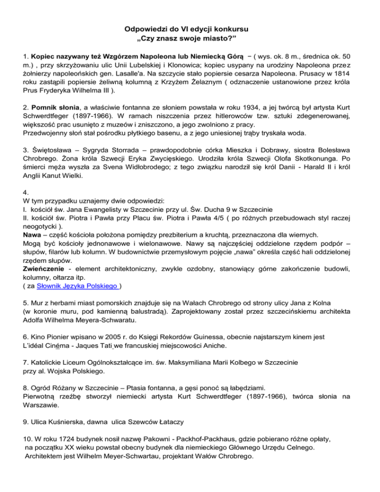 Odpowiedzi do VI edycji konkursu „Czy znasz swoje miasto?” 1. Kopiec nazywany też Wzgórzem Napoleona lub Niemiecką Górą − ( wys. ok. 8 m., średnica ok. 50 m.) , przy skrzyżowaniu ulic Unii Lubelskiej i Klonowica; kopiec usypany na urodziny Napoleona przez żołnierzy napoleońskich gen. Lasalle'a. Na szczycie stało popiersie cesarza Napoleona. Prusacy w 1814 roku zastąpili popiersie żeliwną kolumną z Krzyżem Żelaznym ( odznaczenie ustanowione przez króla Prus Fryderyka Wilhelma III ). 2. Pomnik słonia, a właściwie fontanna ze słoniem powstała w roku 1934, a jej twórcą był artysta Kurt Schwerdtfeger (1897-1966). W ramach niszczenia przez hitlerowców tzw. sztuki zdegenerowanej, większość prac usunięto z muzeów i zniszczono, a jego zwolniono z pracy. Przedwojenny słoń stał pośrodku płytkiego basenu, a z jego uniesionej trąby tryskała woda. 3. Świętosława – Sygryda Storrada – prawdopodobnie córka Mieszka i Dobrawy, siostra Bolesława Chrobrego. Żona króla Szwecji Eryka Zwycięskiego. Urodziła króla Szwecji Olofa Skotkonunga. Po śmierci męża wyszła za Svena Widłobrodego; z tego związku narodził się król Danii - Harald II i król Anglii Kanut Wielki. 4. W tym przypadku uznajemy dwie odpowiedzi: I. kościół św. Jana Ewangelisty w Szczecinie przy ul. Św. Ducha 9 w Szczecinie II. kościół św. Piotra i Pawła przy Placu św. Piotra i Pawła 4/5 ( po różnych przebudowach styl raczej neogotycki ). Nawa – część kościoła położona pomiędzy prezbiterium a kruchtą, przeznaczona dla wiernych. Mogą być kościoły jednonawowe i wielonawowe. Nawy są najczęściej oddzielone rzędem podpór – słupów, filarów lub kolumn. W budownictwie przemysłowym pojęcie „nawa” określa część hali oddzielonej rzędem słupów. Zwieńczenie - element architektoniczny, zwykle ozdobny, stanowiący górne zakończenie budowli, kolumny, ołtarza itp. ( za Słownik Języka Polskiego ) 5. Mur z herbami miast pomorskich znajduje się na Wałach Chrobrego od strony ulicy Jana z Kolna (w koronie muru, pod kamienną balustradą). Zaprojektowany został przez szczecińskiemu architekta Adolfa Wilhelma Meyera-Schwaratu. 6. Kino Pionier wpisano w 2005 r. do Księgi Rekordów Guinessa, obecnie najstarszym kinem jest L’idéal Cinéma - Jaques Tati we francuskiej miejscowości Aniche. 7. Katolickie Liceum Ogólnokształcące im. św. Maksymiliana Marii Kolbego w Szczecinie przy al. Wojska Polskiego. 8. Ogród Różany w Szczecinie – Ptasia fontanna, a gęsi ponoć są łabędziami. Pierwotną rzeźbę stworzył niemiecki artysta Kurt Schwerdtfeger (1897-1966), twórca słonia na Warszawie. 9. Ulica Kuśnierska, dawna ulica Szewców Łataczy 10. W roku 1724 budynek nosił nazwę Pakowni - Packhof-Packhaus, gdzie pobierano różne opłaty, na początku XX wieku powstał obecny budynek dla niemieckiego Głównego Urzędu Celnego. Architektem jest Wilhelm Meyer-Schwartau, projektant Wałów Chrobrego.