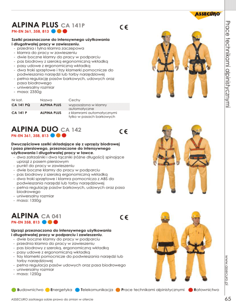 Prace technikami alpinistycznymi ALPINA PLUS CA 141P PN-EN 361, 358, 813 Szelki przeznaczone do intensywnego użytkowania i długotrwałej pracy w zawieszeniu. - przednia i tylna klamra zaczepowa - klamra do pracy w zawieszeniu - dwie boczne klamry do pracy w podparciu - pas biodrowy z szeroką ergonomiczną wkładką - pasy udowe z ergonomiczną wkładką - dwa troki sprzętowe i trzy klamerki pomocnicze do podwieszania narzędzi lub torby narzędziowej - pełna regulację pasów barkowych, udowych oraz pasa biodrowego - uniwersalny rozmiar - masa: 2350g Nr kat. CA 141 PQ Nazwa ALPINA PLUS CA 141 P ALPINA PLUS Cechy wyposażona w klamry automatyczne z klamrami automatycznymi tylko w pasach barkowych ALPINA DUO CA 142 PN-EN 361, 358, 813 Dwuczęściowe szelki składające się z uprzęży biodrowej i pasa piersiowego, przeznaczone do intensywnego użytkowania i długotrwałej pracy w ławce. - dwa zatrzaśniki i dwa łączniki (różne długości) spinające uprząż z pasem piersiowym - punkt do pracy w zawieszeniu - dwie boczne klamry do pracy w podparciu - pas biodrowy z szeroką ergonomiczną wkładką - dwa troki sprzętowe i klamra pomocnicza z ABS do podwieszania narzędzi lub torby narzędziowej - pełna regulację pasów barkowych, udowych oraz pasa biodrowego - uniwersalny rozmiar - masa: 1350g ALPINA CA 041 PN-EN 358, 813 Budownictwo Energetyka Telekomunikacja ASSECURO zastrzega sobie prawo do zmian w ofercie Prace technikami alpinistycznymi www.assecuro.pl Uprząż przeznaczona do intensywnego użytkowania i długotrwałej pracy w podparciu i zawieszeniu. - dwie boczne klamry do pracy w podparciu - przednia klamra do pracy w zawieszeniu - pas biodrowy z szeroką, ergonomiczną wkładką - pasy udowe z ergonomiczną wkładką - trzy klamerki pomocnicze do podwieszania narzędzi lub torby narzędziowej - pełna regulacja pasów udowych oraz pasa biodrowego - uniwersalny rozmiar - masa: 1250g Ratownictwo 65