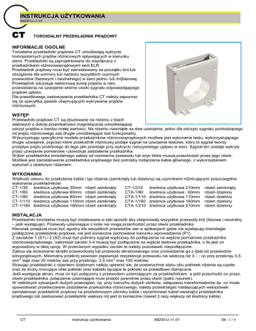 INSTRUKCJA UśYTKOWANIA IM200-U v1.01 CT TOROIDALNY PRZEKŁADNIK PRĄDOWY INFORMACJE OGÓLNE Toroidalne przekładniki prądowe CT umoŜliwiają wykrycie homopolarnych prądów róŜnicowych spływających w kierunku ziemi. Przekładniki są zaprojektowane do współpracy z przekaźnikami róŜnicowoprądowymi serii ELR. Przekładnik prądowy musi być zainstalowany na początku linii lub obciąŜenia dla ochrony lub nadzoru wszystkich czynnych przewodów (fazowych i neutralnego) w sieci jedno- lub trójfazowej. Przekłądnik odczytuje wektorową sumę prądów w celu przeniesienia na uzwojenie wtórne cewki sygnału odpowiadającego prądowi upływu. Dla prawidłowego zastosowania przekładnika CT naleŜy zapoznac się ze specyfiką zjawisk obejmujących wykrywanie prądów róŜnicowych. WSTĘP Przekładniki prądowe CT są zbudowane na rdzeniu z blach stalowych o dobrej przenikalności magnetycznej umoŜliwiającej odczyt prądów o bardzo małej wartości. Na rdzeniu nawinięte sa dwa uzwojenia, jedno dla odczytu sygnału pochodzącego od prądu róŜnicowego zaś drugie umoŜliwiające test funkcjonalny. Wykorzystując specyficzne modele przekaźników róŜnicowoprądowych moŜliwe jest wykonanie testu, wykorzystującego drugie uzwojenie, poprzez które przekaźnik róŜnicowy podaje sygnał na uzwojenie testowe, który to sygnał tworzy przepływ prądu podobnego do tego jaki powstaje przy wykryciu rzeczywistego upływu w sieci. Sygnał ten zostaje wykryty przez uzwojenie pomiarowe i powoduje zadziałanie przekaźnika. Wybór przekładnika toroidalnego zaleŜy od rozmiarów przewodu lub szyn które muszą przechodzić przez jego otwór. MoŜliwe jest zainstalowanie przekładnika prądowego bez potrzeby rozłączania kabla głównego, z wykorzystaniem wykonań z dzielonym rdzeniem. WYKONANIA Wielkość otworu do przełoŜenia kabla i typ rdzenia (zamknięty lub dzielony) są czynnikami róŜnicującymi poszczególne wykonania przekładników: CT-1/35 średnica uŜytkowa 35mm rdzeń zamknięty CT-1/210 średnica uŜytkowa 210mm rdzeń zamknięty CT-1/60 średnica uŜytkowa 60mm rdzeń zamknięty CTA-1/60 średnica uŜytkowa 60mm rdzeń dzielony CT-1/80 średnica uŜytkowa 80mm rdzeń zamknięty CTA-1/110 średnica uŜytkowa 110mm rdzeń dzielony CT-1/110 średnica uŜytkowa 110mm rdzeń zamknięty CTA-1/160 średnica uŜytkowa 160mm rdzeń dzielony CT-1/160 średnica uŜytkowa 160mm rdzeń zamknięty CTA-1/210 średnica uŜytkowa 210mm rdzeń dzielony INSTALACJA Przekładniki toroidalne muszą być instalowane w taki sposób aby obejmowały wszystkie przewody linii (fazowe i neutralny – jeśli występuje). Przewody uziemiające z kolei nie mogą przechodzić przez otwór przekładnika Kierunek przejścia musi być zgodny dla wszystkich przewodów zaś w aplikacjach gdzie nie wystepują równolegle podłączone przekładniki prądowe, nie jest konieczne zachowanie kierunku wprowadzenia (P1). Z zacisków 1 (S1) i 2 (S2) musi być pobrany sygnał wyjściowy do podłączenia na wejście pomiarowe przekaźnika róŜnicowoprądowego, natomiast zaciski 3-4 muszą być podłączone na wyjście testowe przekaźnika, o ile jest on wyposaŜony w taką opcję. W przeciwnym wypadku zaciski te naleŜy pozostawić niepodłączone. Zaleca się stosowanie skrętki przewodowej lub przewodu ekranowanego oraz prowadzenie go z dala od przewodów silnoprądowych. Minimalny przekrój powinien zapewniać rezystancje przewodu nie wiekszą niŜ 3 Ω; co przy przekroju 0,5 2 2 mm daje max 20 metrów zaś przy przekroju 2,5 mm max 100 metrów. Stosując przekładniki z rdzeniem dzielonym naleŜy upewnić sie, Ŝe powierzchnie styku obu połówek rdzenia są czyste oraz Ŝe śruby mocujące obie połówki oraz kabelki łączące te połówki sa prawidłowo dokręcone. Jeśli występuje ekran, musi on być połączony z przewodem uziemiającym za przekładnikiem a jeśli przechodzi on przez, otwór przekładnika, połączenie uziemiające musi przejść powrotnie przez otwór (patrz rysunek). W niektórych sytuacjach duŜych przeciąŜeń, np. przy rozruchu duŜych silników, załączaniu transformatorów itp. co moŜe spowodować przedwczesne zadziałanie przekaźnika róŜnicowego, naleŜy przestrzegać nastepujących wskazówek: zainstalować przekładnik prądowy na prostoliniowym odcinku kabla i wycentrować kabel wewnątrz przekładnika prądowego lub zastosować przekładnik większy niŜ jest to konieczne (nawet 2 razy większy od średnicy kabla). CT instrukcja uŜytkowania IM200-U v1.01 Str. 1 / 4 ZASTOSOWANIA Typowa aplikacja przekładnika prądowego obejmuje wykrywanie prądów róŜnicowych ale jest moŜliwe uŜycie go do wykrywania prądów upływu w innych aplikacjach jak np: Równoległa praca transformatorów (OMNIBUS), linie wielosekcyjne, wykrywanie prądu upływu w połączeniu przewodu zerowego / uziemienia transformatora lub przez przekładniki prądowe linii, ten ostatni przypadek występuje gdy największy przekładnik prądowy nie jest w stanie objąć wszystkich przewodów. Przy wykorzystaniu tych przekładnikow toroidalnych z instrumentami innymi niŜ rodzina przekładników róŜnicowoprądowych ELR, maksymalna ich wartość nie m oŜe przekraczać 600Ω. Dla uzyskania dodatkowych informacji dotyczących takich aplikacji prosimy kontaktować sie z naszym działem pomocy technicznej. PODŁĄCZENIE CT instrukcja uŜytkowania IM200-U v1.01 Str. 2 / 4 WYMIARY Typ CT-1/35 CT-1/60 CT-1/80 CT-1/110 CTA-1/110 CT-1/160 CTA-1/160 CT-1/210 CTA-1/210 CT A 35 60 80 110 110 160 160 210 210 B 100 100 150 150 145 220 220 310 310 C 60 60 110 110 110 156 156 240 240 Wymiary (mm) D E F 110 47 50 110 47 50 160 70 50 160 70 50 150 75 45 236 110 64 236 110 64 290 145 260 290 145 260 instrukcja uŜytkowania G 43 43 43 43 38 50 50 280 280 H 30 30 30 30 25 34 34 36 36 K 180 55 55 IM200-U v1.01 Str. 3 / 4 PARAMETRY TECHNICZNE CT-1/35 CT-1/60 CT-1/80 CT-1/110 CTA-1/110 CT-1/160 CTA-1/160 CT-1/210 CTA-1/210 Typ
