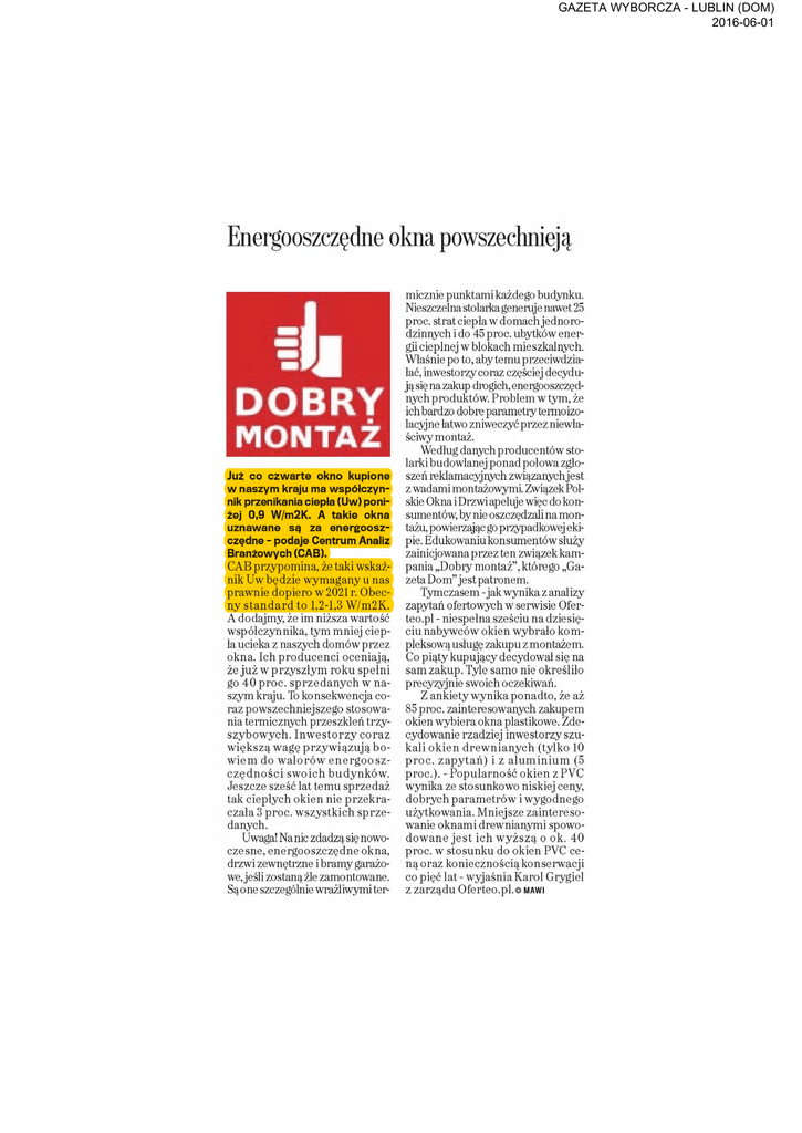 GAZETA WYBORCZA - LUBLIN (DOM) 2016-06-01 Energooszczędne okna powszechnieją DOBRY MONTAŻ Już co czwarte okno kupione w naszym kraju ma współczyn nik przenikania ciepła (Uw) poni żej 0,9 W/m2K. A takie okna uznawane są za energoosz czędne - podaje Centrum Analiz Branżowych (CAB). CAB przypomina, że taki wskaź nik Uw będzie wymagany u nas prawnie dopiero w 2021 r. Obec ny standard to 1,2-1,3 W/m2K. A dodajmy że im niższa wartość współczynnika, tym mniej ciep ła ucieka z naszych domów przez okna. Ich producenci oceniają, że już w przyszłym roku spełni go 40 proc. sprzedanych w na szym kraju. To konsekwencja co raz powszechniejszego stosowa nia termicznych przeszkleń trzyszybowych. Inwestorzy coraz większą wagę przywiązują bo wiem do walorów energooszczędności swoich budynków. Jeszcze sześć lat temu sprzedaż tak ciepłych okien nie przekra czała 3 proc. wszystkich sprze danych. Uwaga! Na nic zdadzą się nowoczesne, energooszczędne okna, drzwi zewnętrzne i bramy garażo we, jeśli zostaną źle zamontowane. Są one szczególnie wrażliwymiter micznie punktami każdego budynku. Nieszczelna stolarka generuje nawet 25 proc. strat ciepła w domach jednoro dzinnych i do 45 proc. ubytków ener gii cieplnej w blokach mieszkalnych. Właśnie po to, aby temu przeciwdzia łać, inwestorzy coraz częściejdecydu ją się nazakup drogich,energooszczęd nych produktów. Problem w tym, że ich bardzo dobre parametry termoizo lacyjne łatwo zniweczyć przez niewła ściwy montaż. Według danych producentów sto larki budowlanej ponad połowa zgło szeń reklamacyjnych związanychjest z wadamimontażowymi. Związek Pol skie Okna i Drzwi apeluje więc do kon sumentów, by nie oszczędzali na mon tażu, powierzając go przypadkowejeki pie. Edukowaniu konsumentówsłuży zainicjowana przez ten związek kam pania „Dobiy montaż", którego „Ga zeta Dom"jest patronem. Tymczasem -jak wynika z analizy zapytań ofertowych w serwisie Oferteo.pl - niespełna sześciu na dziesię ciu nabywców okien wybrało kom pleksową usługę zakupu z montażem. Co piąty kupujący decydował się na sam zakup. Tyle samo nie określiło precyzyjnie swoich oczekiwań. Z ankiety wynika ponadto, że aż 85 proc. zainteresowanych zakupem okien wybiera okna plastikowe. Zde cydowanie rzadziej inwestorzy szu kali okien drewnianych (tylko 10 proc. zapytań) i z aluminium (5 proc.). - Popularność okien z PVC wynika ze stosunkowo niskiej ceny dobrych parametrów i wygodnego użytkowania. Mniejsze zaintereso wanie oknami drewnianymi spowo dowane jest ich wyższą o ok. 40 proc. w stosunku do okien PVC ce ną oraz koniecznością konserwacji co pięć lat - wyjaśnia Karol Grygiel z zarządu Oferteo.pl.© MAWI