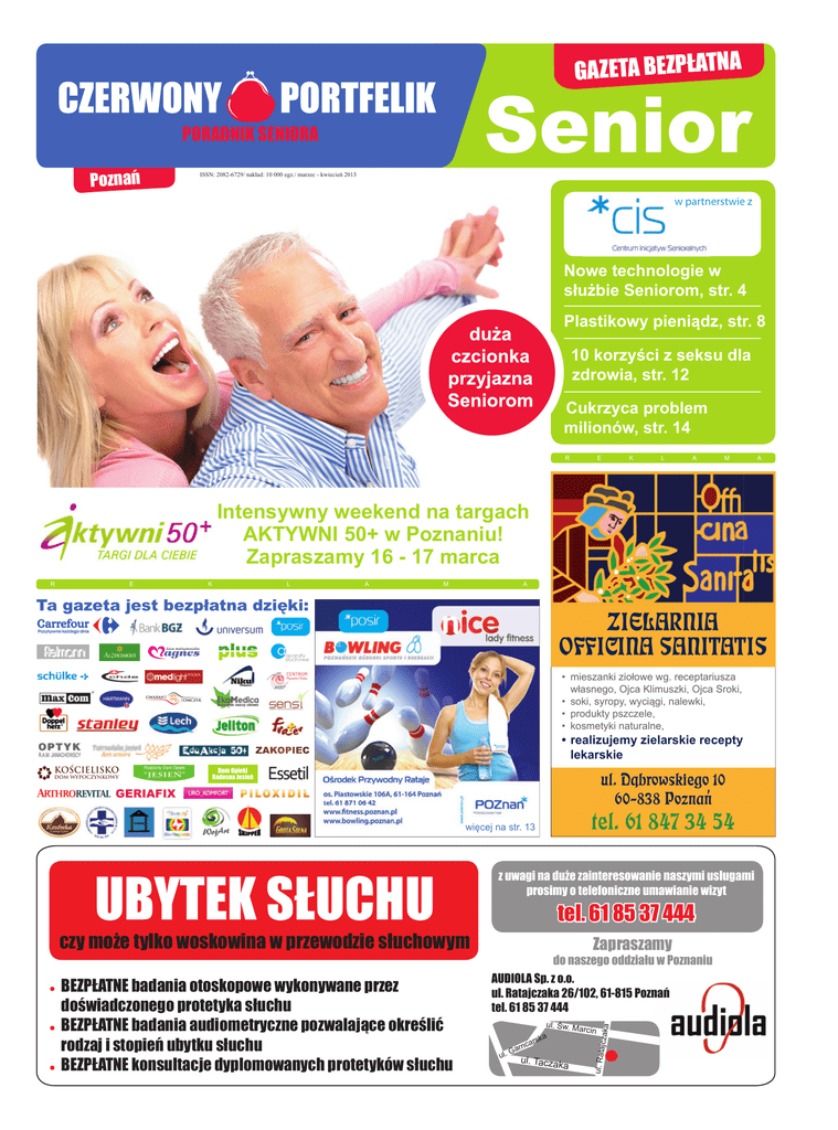 GazETa BEzPŁaTNa www.czerwonyportfelik.pl / Senior / dwumiesięcznik bezpłatny POraDNIk SENIOra Poznań ISSN: 2082-6729/ nakład: 10 000 egz./ marzec - kwiecień 2013 w partnerstwie z Nowe technologie w służbie Seniorom, str. 4 Plastikowy pieniądz, str. 8 10 korzyści z seksu dla zdrowia, str. 12 Cukrzyca problem milionów, str. 14 R E K L A M A Intensywny weekend na targach AKTYWNI 50+ w Poznaniu! Zapraszamy 16 - 17 marca R E K L A M A Ta gazeta jest bezpłatna dzięki: ZIELARNIA OFFICINA SANITATIS • mieszanki ziołowe wg. receptariusza własnego, Ojca Klimuszki, Ojca Sroki, • soki, syropy, wyciągi, nalewki, • produkty pszczele, • kosmetyki naturalne, • realizujemy zielarskie recepty lekarskie ZAKOPIEC DOM WYPOCZYNKOWY Dom Opieki radosna Jesień ul. Dabrowskiego 10 60-838 Poznan GERIAFIX tel. 61 847 34 54 więcej na str. 13 tel. 61 85 37 444 czy może tylko woskowina w przewodzie słuchowym ● ● ● BEzPŁaTNE badania otoskopowe wykonywane przez doświadczonego protetyka słuchu BEzPŁaTNE badania audiometryczne pozwalające określić rodzaj i stopień ubytku słuchu BEzPŁaTNE konsultacje dyplomowanych protetyków słuchu zapraszamy do naszego oddziału w Poznaniu auDIOLa Sp. z o.o. ul. ratajczaka 26/102, 61-815 Poznań tel. 61 85 37 444 ul. Św. M ul. nca r Ga arcin a rsk ul. Tacza ka ul. Rata uByTEk SŁuCHu z uwagi na duże zainteresowanie naszymi usługami prosimy o telefoniczne umawianie wizyt jczaka KOŚCIELISKO 2 www.czerwonyportfelik.pl / Senior / dwumiesięcznik bezpłatny Warto wiedzieć Senioralny Od maja 2010 roku działa w Poznaniu przy ul. Mickiewicza 9a Centrum Inicjatyw Senioralnych. W ramach CentrumIS działa Punkt Informacji 50+ - jest to miejsce, w którym Seniorzy znajdą interesujące ogłoszenia i motywację do ciekawego spędzenia czasu. CentrumIS promuje tylko sprawdzone i rzetelne oferty, dbając o to, by Seniorzy mogli wybierać spośród najlepszych propozycji. Poniżej przedstawiamy niektóre z nich. Poznań Stowarzyszenie Wzajemnej Pomocy Flandria zaprasza do udziału w marcowych zajęciach. W programie: 26.03. 17.00-18.00 „W ZDROWYM CIELE - EKO DUCH” - ZDROWY SEN - prawie jedną trzecią naszego życia przesypiamy, sen jest niezbędny do zachowania zdrowia i dobrego samopoczucia; uczestnicy spotkania będą mogli usłyszeć jak zadbać o to, aby nasz sen był zdrowy, jak i na czym powinniśmy spać i jakie mogą być skutki złego snu. Koszt: 5 zł/os. 28.03. 17.00-18.00 „W ZDROWYM CIELE - EKO DUCH” - TRENING TECHNIK RELAKSACJI. Okazja do poznania sposobów na produktywny i skuteczny odpoczynek, walkę z napięciem i stresem oraz poprawę samopoczucia. Koszt: 5 zł/os. Konieczne wcześniejsze zapisy: 664 999 886 lub w siedzibie SWP „Flandria”, ul. Zacisze 4. Gimnastyka na Chwiałce. Zachęcamy do skorzystania z zajęć przygotowanych przez Poznańskie Ośrodki Sportu i Rekreacji. Zajęcia odbywają się w salach gimnastycznych przy ul. Chwiałkowskiego 34. Z treningów można korzystać od poniedziałku do piątku w godz. 8.30 15.00. Dla Seniorów przygotowano zajęcia ogólnorozwojowe oraz gimnastykę. Koszt godzinnego treningu wynosi 8 zł. Kontakt: 61 833 05 11 Bezpłatne warsztaty „Internet to nie magia”. W ramach projektu „Polska Cyfrowa Równych Szans”, który ma na celu wspieranie działań na rzecz podnoszenia kompetencji cyfrowych dorosłych Polaków z pokolenia 50+ w ich lokalnych środowiskach odbędą się bezpłatne warsztaty „Internet to nie magia”. Zajęcia prowadzi Elżbieta Węgrzynowicz, Latarniczka. Jeśli są Państwo zainteresowani przeprowadzeniem takich zajęć w Państwa Klubie, Stowarzyszeniu i macie komputer (minimum jeden lub więcej) – zapraszamy do kontaktu z CentrumIS. poleca Centrum Inicjatyw Senioralnych Stowarzyszenie Pilotów Wycieczek zaprasza do udziału w marcowych zajęciach. Trwa tworzenie grup na zajęcia z języka włoskiego (początkujący) i języka rosyjskiego (powtórki, konwersacje). Spotkanie informacyjne 6 marca godz. 16.00. W programie spotkań i wycieczek: 8.03. godz. 17.00 Spotkanie przy muzyce biesiadnej. 11.03. godz. 18.00. Prelekcja pt. „ABC Nowego Jorku” przedstawi Wirginia Kubiś – wstęp wolny. 20.03. godz.16.00 „Poznajemy Sztukę Origami” – przygotowanie wiosennych kwiatów – prowadzi Halina Grajewska. Należy przynieść nożyczki i kolorowy papier. Do towarzystwa można zabrać wnuki. 23.03. Powitanie wiosny na szlaku baroku – wycieczka. Zapisy w biurze stowarzyszenia lub telefonicznie, ul. Zacisze 4, tel. 61 848 13 37. Prosimy dzwonić w czasie dyżurów: poniedziałek 13.00-18.00, środa: 11.00-16.00. Towarzystwo Uniwersytet Trzeciego Wieku zaprasza Seniorki oraz Seniorów młodych duchem, którzy chcieliby zaangażować się tworzenie kabaretu „Po sześćdziesiątce i... setce też”. Seniorko/Seniorze jeśli potrafisz pisać zabawne teksty lub/i dobierać do nich muzykę oraz masz pomysł na choreografię zgłoś się do UTW. Więcej informacji w biurze UTW ul. Ratajczaka 37 lub telefonicznie 61 851 00 36. Kawiarnia Kamea, wyróżniona certyfikatem Miejsca Przyjaznego Seniorom, przygotowała dla Seniorów szczególną promocję: dla wszystkich, którzy przedłożą kelnerowi ulotkę rabatową, przewidziany jest rabat w wysokości 15% na dowolne specjały z karty. Promocja obowiązuje codziennie do godziny 15.00. Po ulotki zapraszamy do Centrum Inicjatyw Senioralnych. Bezpłatne porady psychologiczne w Centrum Inicjatyw Senioralnych. W każdą środę w godzinach 12.00-14.00 zapraszamy do CentrumIS. Prosimy o wcześniejsze zarezerwowanie terminu. Serdecznie zapraszamy! Zapewniamy możliwość rozmowy w przyjaznej atmosferze. Kontakt: 61 847 21 11. Informacja Ekonomiczna w CentrumIS Seniorko, Seniorze! Szukasz rozwiązań na lepsze zarządzanie swoimi finansami? Pojęcia ekonomiczne nie są dla Ciebie jasne? Nie wiesz jakie oprocentowanie wybrać i co to tak naprawdę oznacza? Chcesz wiedzieć na co zwrócić uwagę przy wybieraniu 
