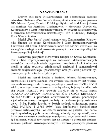 NASZE SPRAWY Dużym sukcesem Stowarzyszenia jest odznaczenie naszego sztandaru Medalem „Pro Patria”. Uroczystość miała miejsce podczas XIV Marszu Żywej Pamięci Polskiego Sybiru. Aktu dekoracji dokonał minister Jan Stanisław Ciechanowski – kierownik Urzędu ds. Kombatantów i Osób Represjonowanych. W poczcie sztandarowym, z ramienia Stowarzyszenia uczestniczyli: Jan Rudziński, Jadwiga Kot i Wanda Kostro. Medal „Pro Patria” został ustanowiony Zarządzeniem Kierownika Urzędu do spraw Kombatantów i Osób Represjonowanych 1 września 2011 roku. Uhonorowane mogą być osoby i instytucje „za szczególne zasługi w kultywowaniu pamięci o walce o niepodległość Rzeczypospolitej Polskiej”. Nadawany jest przez kierownika Urzędu do Spraw Kombatantów i Osób Represjonowanych na podstawie udokumentowanych wniosków naczelnych władz organizacji kombatanckich i ofiar represji, a także organów administracji rządowej i samorządowej szczebla wojewódzkiego i powiatowego oraz polskich placówek dyplomatycznych i attache wojskowych. Medal ma kształt krążka o średnicy 36 mm, fakturowanego, srebrzonego i oksydowanego. Na awersie umieszczony jest wizerunek stylizowanego orła Rzeczypospolitej z przełomu XVII i XVIII wieku, opartego o skrzyżowane ze sobą – kosę bojową i szablę polską (wzór 1921/22). Na rewersie znajduje się w otoku napis: „URZĄD DO SPRAW KOMBATANTÓW I OSÓB REPRESJONOWANYCH”, a pośrodku odwzorowanie krzyża pochodzące z jednolitego wzoru chorągwi piechoty i sztandarów jazdy, ustalonego w 1919 r. Poniżej krzyża, w dwóch rzędach, umieszczono napis: „PRO PATRIA” i „1768–1989” (daty konfederacji barskiej oraz przemian ustrojowych). Pod datami znajduje się gałązka liści dębowych symbolizujących cnotę, odwagę, chwałę, wytrzymałość, moc i siłę oraz wawrzyn uosabiający zwycięstwo, czyn bohaterski, chwałę i zaszczyt. Medal zawieszony jest na wstążce z centralnie umieszczonym paskiem ciemnogranatowym i dwoma pąsowymi paskami 160 KRESOWE STANICE przedzielonymi srebrzystymi prążkami i prążkami czarnymi na obrzeżach wstążki. *** Witamy w naszym gronie nowych członków: 552. Mieczysława Mikos-Skarżyńska – os. Berdówka, pow. Nowogródek, woj. nowogródzkie, wnuczka osadnika Bonifacego Sankowskiego. Serdecznie przepraszamy Panią Mieczysławę za podanie błędnego stopnia pokrewieństwa w numerze 63. 561. Krystyna Kurucz – os. Dobrzanice woj. tarnopolskie, wnuczka osadnika 562. Eugenia Charkton (Rusnak) – os. Dobrzanice, woj. tarnopolskie, córka osadnika Józefa Rosnaka 563. Tadeusz Mirecki – os. Marysin, pow. Wołkowysk woj. białostockie, syn osadnika Jana Mireckiego 564. Wanda Kania – osada Wola Strzelecka, pow. Krzemieniec, woj. wołyńskie, córka osadnika Emila Sawickiego 565. Jadwiga Rynas, osada Wola Strzelecka pow. Krzemieniec, woj. wołyńskie, córka osadnika Emila Sawickiego Tak liczne grono nowych członków to potomkowie osadników, a jednocześnie członkowie bratniej organizacji – Stowarzyszenia Klubu Pod Baobabem, popularnie zwani Afrykańczykami. KRESOWE STANICE 161 Stowarzyszenie Klub pod Baobabem we Wrocławiu istnieje od 1989 r., tj. od 25 lat i liczy obecnie ok. 200 członków. Skupia on zesłańców Sybiru, którzy po układzie Sikorski-Majski z 30 lipca 1941 r. zostali uratowani przez gen. Władysława Andersa i w 1942 r. przez Persję (Iran) i Indie zostali skierowani do ówczesnych kolonii brytyjskich w południowej i wschodniej Afryce (Uganda, Kenia, Tanganika – ob. Tanzania, Rodezja Północna – ob. Zambia, Rodezja Południowa – ob. Zimbabwe oraz Republika Południowej Afryki). Przebywało tam ponad 18 tys. ludzi przez okres 5–8 lat. Do Polski wróciło ok. 3 tys. Po ostatnim zjeździe Afrykańczyków, który odbył się we Wrocławiu w dniach 11-14 września 2014 r., chęć zapisania się do Stowarzyszenia Rodzin Osadników Wojskowych i Cywilnych Kresów Wschodnich wyraziło kilka osób. *** Wpłaty na działalność Stowarzyszenia w okresie od 1 lipca do 30 września 2014 roku: Henryk Witkowski Józefa Kornecka Teresa Pawlik Maria Jończyk Mieczysława Mikos-Skarżyńska 50 zł 60 zł 70 zł 10 zł 50 zł Edward Rutczyński Józef Więckowski Zofia Krokocka Grażyna Rebell Jadwiga Mikos 100 zł 20 zł 60 zł 60 zł 50 zł Dziękujemy bardzo serdecznie wszystkim darczyńcom, którzy wpłacają pieniądze dodatkowo, ponad wymagane należności. I w ten sposób pokrywamy ciągle wzrastające wydatki. *** Zapraszamy na otwarte zebrania zarządu w każdy ostatni poniedziałek miesiąca na godzinę 16.00. Najbliższe zebrania odbędą się: 24 listopada i 29 grudnia 2014 r. Pełnimy też stałe dyżury sekretariatu i redakcji w każdy czwartek od godziny 15.00 do 17.00. W szczególnych przypadkach, dla osób spoza Warszawy spotykamy się w dowolnie umówionym terminie, w lokalu Stowarzyszenia przy Alei Armii Ludowej 30 m. 2. 162 KRESOWE STANICE