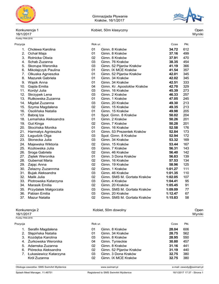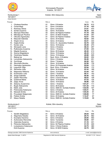 Gimnazjada Pływanie Kraków, 16/1/2017 Konkurencja 1 16/1/2017 Kobiet, 50m klasyczny Open Wyniki Punkty: FINA 2016 Pozycja 1. 2. 3. 4. 5. 6. 7. 8. 9. 10. 11. 12. 13. 14. 15. 16. 17. 18. 19. 20. 21. 22. 23. 24. 25. 26. 27. 28. 29. 30. 31. 32. 33. 34. 35. 36. 37. Rok ur. Cholewa Karolina Ochał Maja Rolnicka Oliwia Schab Zuzanna Skorupa Weronika Mikołajczyk Paulina Olkuska Agnieszka Mazurek Gabriela Wąsik Anna Gajda Emilia Kordyl Julia Skrzypek Lena Rutkowska Zuzanna Migdał Zuzanna Szyma Magdalena Osolińska Natalia Babraj Iza Lemańska Aleksandra Gut Kinga Słocińska Monika Harmatys Agnieszka Łagudzik Olga Słonecka Julia Majewska Wiktoria Kozłowska Julia Sroga Gabriela Ziętek Weronika Gubernat Maria Zając Anna Żelazny Zuzannma Bujak Aleksandra Malik Julia Piotrowska Katarzyna Marasik Emilia Przydatek Małgorzata Pabian Emilia Mazur Natalia Konkurencja 2 16/1/2017 01 01 02 03 03 01 01 01 01 04 03 03 01 03 02 01 01 01 02 01 01 03 03 02 03 02 01 02 02 02 03 02 03 02 03 03 02 Gimn. 8 Kraków Gimn. 8 Kraków Gimn. 8 Kraków Gimn. 76 Kraków Gimn. 52 Pijarów Kraków Gimn. IX MCE Kraków Gimn. 52 Pijarów Kraków Gimn. 34 Kraków Gimn. 34 Kraków Gimn. Kr. Apostołów Kraków Gimn. 16 Kraków Gimn. 2 Kraków Gimn. 1 Kraków Gimn. 20 Kraków Gimn. 15 Kraków Gimn. 15 Kraków Społ. Gimn. 8 Kraków Gimn. 2 Kraków Gimn. 7 Kraków Gimn. 16 Kraków Gimn. 53 Prezentek Kraków Społ. Gimn. 8 Kraków Gimn. 34 Kraków Gimn. 15 Kraków Gimn. 7 Kraków Gimn. 46 Kraków Gimn. 3 Dona Kraków Gimn. 16 Kraków Gimn. 19 Kraków Gimn. 1 Kraków Gimn. 46 Kraków Gimn. SMS M. Gortata Kraków Gimn. 4 Kraków Gimn. 20 Kraków Gimn. SMS M. Gortata Kraków Gimn. 20 Kraków Gimn. SMS M. Gortata Kraków Czas Pkt. 34.72 37.16 37.91 38.35 41.19 41.54 42.01 42.02 42.51 42.70 45.39 46.33 47.05 49.30 49.35 49.98 50.02 50.26 50.28 52.58 52.84 52.94 53.32 53.44 56.31 56.40 56.83 57.53 58.96 1:01.27 1:01.35 1:02.05 1:04.41 1:05.45 1:09.09 1:12.47 1:15.83 612 499 470 454 366 357 345 345 333 329 273 257 245 213 213 205 204 201 201 176 173 172 169 167 143 142 139 134 125 111 110 107 95 91 77 67 58 Kobiet, 50m dowolny Open Wyniki Punkty: FINA 2016 Pozycja 1. 2. 3. 4. 5. 6. 7. Rok ur. Serafin Magdalena Stępińska Natalia Kozdęba Karolina Żurkowska Weronika Adamska Zuzanna Piórecka Aleksandra Łukasiewicz Katarzyna Król Zuzanna Obsługa zawodów: SMS SwimArt Myślenice Splash Meet Manager, 11.46751 01 01 03 04 02 02 03 02 Gimn. 8 Kraków Gimn. 34 Kraków Gimn. 8 Kraków Gimn. Tynieckie Gimn. 8 Kraków Gimn. 52 Pijarów Kraków Gimn. 3 Dona Kraków Gimn. IX MCE Kraków Czas Pkt. 28.04 28.75 28.95 30.80 31.16 31.19 32.75 32.75 606 562 550 457 441 440 380 380 www.swimart.pl e-mail: [email protected] Registered to SMS SwimArt Myślenice 16/1/2017 17:37 - Strona 1 Gimnazjada Pływanie Kraków, 16/1/2017 Konkurencja 2, Kobiet, 50m dowolny, Open Pozycja 9. 10. 11. 12. 13. 14. 15. 16. 17. 18. 19. 21. 22. 23. 24. 25. 26. 27. 28. 29. 30. 31. 32. 33. 34. 35. 36. 37. 38. 39. 40. 41. 42. 43. 44. 45. 46. 47. 48. 49. 50. Rok ur. Bistroń Małgorzata Łęgowska Pola Konarska Róża Gackowiec Wiktoria Duda Dominika Górka Klaudia Darłak Julia Madeyska Alicja Cichowska Julia Tomczuk Barbara Stanaszek Sylwia Wójtowicz Anna Misztal Aleksadra Kowalska Weronika Lechowicz Zofia Chmura Łucja Lach Kamila Wójcik Barbara Bandoła Weronika Kwołek Maria Jastrzębska Zuzanna Wrona Wiktoria Pipień Paulina Lejmel Miriam Tkaczyk Emilia Lach Martina Czekańska Hanna Dudzik Agnieszka Królik Olga Huszno Julia Kowacz Gabriela Jamróz Laura Pietrzyk Maja Paszko Wiktoria Pabian Oliwia Paluch Weronika Figut Oliwia Krakowska Magdalena Lach Laura Czaplicka Alicja Borek Ewa Skwarnicka Dominika Obsługa zawodów: SMS SwimArt Myślenice Splash Meet Manager, 11.46751 01 03 03 02 02 02 02 01 02 03 03 03 01 01 03 02 01 01 01 01 01 03 04 01 02 02 01 02 02 03 03 03 03 04 03 01 03 02 03 03 03 03 Gimn. 16 Kraków Gimn. 52 Pijarów Kraków Pryw. Gimn. 2 Kraków Gimn. 36 Kraków Gimn. Nazaret Gimn. 75 Kraków Gimn. 32 Kraków Gimn. 15 Kraków Gimn. 46 Kraków Gimn. Kostka Kraków Gimn. 3 Dona Kraków Gimn. IX MCE Kraków Gimn. 75 Kraków Gimn. 1 Kraków Gimn. 15 Kraków Gimn. 3 Dona Kraków Gimn. 20 Kraków Gimn. 16 Kraków Gimn. 2 Kraków Gimn. 53 Prezentek Kraków Gimn. 15 Kraków Pryw. Gimn. Akad. 6 Kraków Gimn. 20 Kraków Gimn. 53 Prezentek Kraków Gimn. 36 Kraków Gimn. 25 Kraków Gimn. 52 Pijarów Kraków Gimn. 7 Kraków Gimn. 1 Kraków Gimn. 16 Kraków Gimn. 2 Kraków Społ. Gimn. 8 Kraków Gimn. 46 Kraków Gimn. 7 Kraków Gimn. 75 Kraków Gimn. 46 Kraków Gimn. 7 Kraków Gimn. SMS M. Gortata Kraków Gimn. 4 Kraków Gimn. Tynieckie Gimn. Tynieckie Gimn. 1 Kraków Czas Pkt. 33.19 33.62 33.98 34.03 34.70 34.75 35.03 35.40 35.88 36.43 37.32 37.32 37.69 37.76 38.03 38.21 38.44 38.68 38.75 38.76 38.96 39.50 39.53 39.84 39.88 39.94 40.06 40.25 40.28 41.48 41.69 41.80 42.23 42.93 43.13 43.64 44.74 46.90 47.17 48.19 51.19 53.56 365 351 340 339 319 318 310 301 289 276 257 257 249 248 242 239 235 230 229 229 225 216 216 211 210 209 207 204 204 187 184 182 177 168 166 160 149 129 127 119 99 86 www.swimart.pl e-mail: [email protected] Registered to SMS SwimArt Myślenice 16/1/2017 17:37 - Strona 2 Gimnazjada Pływanie Kraków, 16/1/2017 Konkurencja 3 16/1/2017 Kobiet, 50m grzbietowy Open Wyniki Punkty: FINA 2016 Pozycja 1. 2. 3. 4. 5. 6. 7. 8. 9. 10. 11. 12. 13. 14. 15. 16. 17. 18. 19. 20. 21. 22. 23. 24. 25. 26. Rok ur. Pogorzelska Laura Król Wiktoria Tasak Aleksandra Broda Nikola Świerta Emilia Staśkiewicz Nikola Woźniak Natalia Wróblewska Martyna Mikrut Michalina Morawska Laura Żyła Julia Kowal Maria Figiel Urszula Chomicka-Bindas Zofia Chudaszek Nadine Krzepkowska Marianna Borowy Marta Grzybowska Julia Kowalczyk Laura Chlebda Gabriela Bieńko Paulina Kos Roksana Gąsior Aleksandra Hyła Izabela Moskała Julia Sadzik Oliwia Konkurencja 4 16/1/2017 01 02 03 01 03 04 01 02 03 03 02 04 03 03 Gimn. 8 Kraków Gimn. 8 Kraków Gimn. 8 Kraków Gimn. IX MCE Kraków