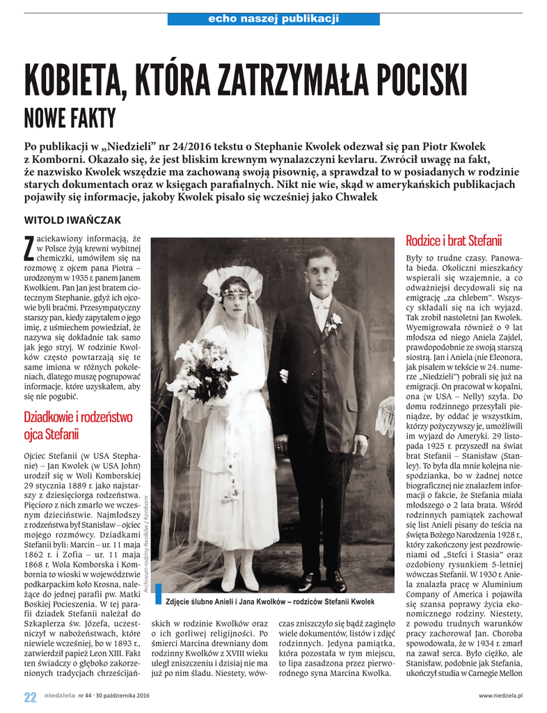 echo naszej publikacji Kobieta, która zatrzymała pociski nowe fakty Po publikacji w „Niedzieli” nr 24/2016 tekstu o Stephanie Kwolek odezwał się pan Piotr Kwolek z Komborni. Okazało się, że jest bliskim krewnym wynalazczyni kevlaru. Zwrócił uwagę na fakt, że nazwisko Kwolek wszędzie ma zachowaną swoją pisownię, a sprawdzał to w posiadanych w rodzinie starych dokumentach oraz w księgach parafialnych. Nikt nie wie, skąd w amerykańskich publikacjach pojawiły się informacje, jakoby Kwolek pisało się wcześniej jako Chwałek Witold Iwańczak Z Rodzice i brat Stefanii aciekawiony informacją, że w Polsce żyją krewni wybitnej chemiczki, umówiłem się na rozmowę z ojcem pana Piotra – urodzonym w 1935 r. panem Janem Kwolkiem. Pan Jan jest bratem ciotecznym Stephanie, gdyż ich ojcowie byli braćmi. Przesympatyczny starszy pan, kiedy zapytałem o jego imię, z uśmiechem powiedział, że nazywa się dokładnie tak samo jak jego stryj. W rodzinie Kwolków często powtarzają się te same imiona w różnych pokoleniach, dlatego muszę pogrupować informacje, które uzyskałem, aby się nie pogubić. Dziadkowie i rodzeństwo ojca Stefanii Archiwum rodziny Kwolków z Komborni Ojciec Stefanii (w USA Stephanie) – Jan Kwolek (w USA John) urodził się w Woli Komborskiej 29 stycznia 1889 r. jako najstarszy z dziesięciorga rodzeństwa. Pięcioro z nich zmarło we wczesnym dzieciństwie. Najmłodszy z rodzeństwa był Stanisław – ojciec mojego rozmówcy. Dziadkami Stefanii byli: Marcin – ur. 11 maja 1862 r. i Zofia – ur. 11 maja 1868 r. Wola Komborska i Kombornia to wioski w województwie podkarpackim koło Krosna, należące do jednej parafii pw. Matki Boskiej Pocieszenia. W tej parafii dziadek Stefanii należał do Szkaplerza św. Józefa, uczestniczył w nabożeństwach, które niewiele wcześniej, bo w 1893 r., zatwierdził papież Leon XIII. Fakt ten świadczy o głęboko zakorzenionych tradycjach chrześcijań- 22 niedziela nr 44 . 30 października 2016 Zdjęcie ślubne Anieli i Jana Kwolków – rodziców Stefanii Kwolek skich w rodzinie Kwolków oraz o ich gorliwej religijności. Po śmierci Marcina drewniany dom rodzinny Kwolków z XVIII wieku uległ zniszczeniu i dzisiaj nie ma już po nim śladu. Niestety, wów- czas zniszczyło się bądź zaginęło wiele dokumentów, listów i zdjęć rodzinnych. Jedyna pamiątka, która pozostała w tym miejscu, to lipa zasadzona przez pierworodnego syna Marcina Kwolka. Były to trudne czasy. Panowała bieda. Okoliczni mieszkańcy wspierali się wzajemnie, a co odważniejsi decydowali się na emigrację „za chlebem”. Wszyscy składali się na ich wyjazd. Tak zrobił nastoletni Jan Kwolek. Wyemigrowała również o 9 lat młodsza od niego Aniela Zajdel, prawdopodobnie ze swoją starszą siostrą. Jan i Aniela (nie Eleonora, jak pisałem w tekście w 24. numerze „Niedzieli”) pobrali się już na emigracji. On pracował w kopalni, ona (w USA – Nelly) szyła. Do domu rodzinnego przesyłali pieniądze, by oddać je wszystkim, którzy pożyczywszy je, umożliwili im wyjazd do Ameryki. 29 listopada 1925 r. przyszedł na świat brat Stefanii – Stanisław (Stanley). To była dla mnie kolejna niespodzianka, bo w żadnej notce biograficznej nie znalazłem informacji o fakcie, że Stefania miała młodszego o 2 lata brata. Wśród rodzinnych pamiątek zachował się list Anieli pisany do teścia na święta Bożego Narodzenia 1928 r., który zakończony jest pozdrowieniami od „Stefci i Stasia” oraz ozdobiony rysunkiem 5-letniej wówczas Stefanii. W 1930 r. Aniela znalazła pracę w Aluminium Company of America i pojawiła się szansa poprawy życia ekonomicznego rodziny. Niestety, z powodu trudnych warunków pracy zachorował Jan. Choroba spowodowała, że w 1934 r. zmarł na zawał serca. Było ciężko, ale Stanisław, podobnie jak Stefania, ukończył studia w Carnegie Mellon www.niedziela.pl Photo-archiwum Smithsonian Institution – z czasów promocji kevlaru r e k l a m a Stefania Kwolek i urwała się korespondencja ze Stefanią. Pan Jan, mój rozmówca, dowiedział się o śmierci Stefanii Kwolek z tekstu w „Niedzieli”. Na cmentarzu w Lower Burrell obok New Kensington, gdzie na samym początku osiedlili się rodzice Stefanii, są groby całej amerykańskiej odnogi rodziny Kwolek. Na nagrobku rodziców Stefanii jest błędnie podany rok urodzin jej ojca – 1892. Bardzo dziękuję za informacje i wszystkie nadesłane materiały panom Janowi Kwolkowi i jego synowi Piotrowi. I III-1778/16 Archiwum cmentarza w Lower Burrell University na wydziale Inżynierii Chemicznej. Później pracował w Gulf Research in Harmarville, jako inżynier i menedżer. Stefania często pisywała (po angielsku) do swojego stryja Stanisława Kwolka (ojca mojego rozmówcy), opisywała w listach życie swoje i brata. W jednym z listów z 1999 r. pisała o chorobie brata – Stanisław był wówczas już po drugim zawale serca. Oboje nie założyli rodzin, oboje byli na emeryturze i oboje uczestniczyli wówczas w akcjach promocyjnych kevlaru. 15 kwietnia 2004 r. zmarł Stanisław Grób rodziny Kwolków na cmentarzu w Lower Burrell www.niedziela.pl 30 października 2016 . nr 44 niedziela 23