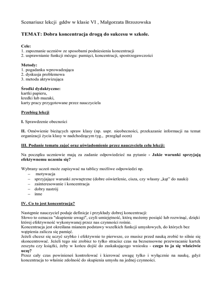 Scenariusz lekcji gddw w klasie VI , Małgorzata Brzozowska TEMAT: Dobra koncentracja drogą do sukcesu w szkole. Cele: 1. zapoznanie uczniów ze sposobami podniesienia koncentracji 2. usprawnianie funkcji mózgu: pamięci, koncentracji, spostrzegawczości Metody: 1. pogadanka wprowadzająca 2. dyskusja problemowa 3. metoda aktywizująca Środki dydaktyczne: kartki papieru, kredki lub mazaki, karty pracy przygotowane przez nauczyciela Przebieg lekcji I. Sprawdzenie obecności II. Omówienie bieżących spraw klasy (np. uspr. nieobecności, przekazanie informacji na temat organizacji życia klasy w nadchodzącym tyg., przegląd ocen) III. Podanie tematu zajęć oraz uświadomienie przez nauczyciela celu lekcji: Na początku uczniowie mają za zadanie odpowiedzieć na pytanie - Jakie warunki sprzyjają efektywnemu uczeniu się? Wybrany uczeń może zapisywać na tablicy możliwe odpowiedzi np. motywacja sprzyjające warunki zewnętrzne (dobre oświetlenie, cisza, czy własny „kąt” do nauki) zainteresowanie i koncentracja dobry nastrój inne IV. Co to jest koncentracja? Następnie nauczyciel podaje definicje i przykłady dobrej koncentracji: Słowo to oznacza "skupienie uwagi", czyli umiejętność, którą możemy posiąść lub rozwinąć, dzięki której efektywność wykonywanej przez nas czynności rośnie. Koncentracja jest określana mianem podstawy wszelkich funkcji umysłowych, do których bez wątpienia zalicza się pamięć. Jeżeli chcesz się uczyć szybko i efektywnie to pierwsze, co musisz przed nauką zrobić to silnie się skoncentrować. Jeżeli tego nie zrobisz to tylko stracisz czas na bezsensowne przewracanie kartek zeszytu czy książki, żeby w końcu dojść do zaskakującego wniosku - czego to ja się właściwie uczę? Przez cały czas powinieneś kontrolować i kierować uwagę tylko i wyłącznie na naukę, gdyż koncentracja to właśnie zdolność do skupienia umysłu na jednej czynności. V. Jak rozwijać zdolność koncentracji - kilka praktycznych wskazówek 1. Zacznij od przygotowania miejsca, w którym będziesz się uczył. Może to być biurko, kanapa, krzesło, stół w kuchni - to, co najbardziej tobie odpowiada. Ważne jest jednak, aby uczyć zazwyczaj, a jeśli to możliwe, zawsze, TYLKO w tym miejscu. Okazuje się, że po pewnym czasie nasz organizm będzie "automatycznie" przechodził w stan gotowości do przyjmowania wiedzy właśnie w tym miejscu. 2. Postaraj się wyeliminować wszystkie rozpraszające cię czynniki, tzn. bodźce oddziałujące na wzrok, słuch, powonienie itp.; zasada jest prosta: albo się uczysz i wszystkie inne zadania odkładasz na później, albo się relaksujesz i wtedy nawet na ułamek sekundy nie myślisz o nauce (nie można robić tych czynności naraz, bo wtedy ani się nic nie nauczysz, ani porządnie nie wypoczniesz). 3. Zadbaj o odpowiednie oświetlenie, nie należy mieszać oświetlenia, tzn. uczyć się przy równoczesnym świetle naturalnym i sztucznym. 4. Z miejsca, w którym się uczyć warto usunąć wszelkie rozpraszające naszą uwagę przedmioty (pilot TV, telefon, gazety). Dzięki temu będziesz mógł się skoncentrować na materiale. 5. Wyjdź przed rozpoczęciem nauki na krótki spacer lub przynajmniej przewietrz pomieszczenie, w którym będziesz się uczył. 6. Wyeliminuj wszelkiego rodzaju głośne dźwięki dochodzące z zewnątrz lub występujące w pomieszczeniu, w którym się uczysz - poradzisz sobie z nimi zamykając okno, idąc do czytelni, wkładając do uszu stopery lub... przyzwyczajając się. 7. Przystępuj do nauki z silną motywacją (nigdy nie ucz się w przekonaniu, że to, co robisz nie ma sensu - pamiętaj, że uczysz się dla siebie, w określonym celu, który sam sobie powinieneś wyznaczyć - np. dobre oceny w szkole, własna satysfakcja). 8. Ucz się o właściwej dla ciebie porze dnia; niektórzy ludzie lepiej koncentrują się rano (tzw. skowronki), a inni późnym wieczorem (tzw. sowy); pamiętaj jednak, żeby unikać uczenia się bezpośrednio po godzinie 13, ponieważ wtedy wzrasta ilość glikogenu we krwi, co prowadzi do ogólnego znużenia i braku koncentracji. 9. Unikaj stresu - zdenerwowanie i silny stres to poważni wrogowie pamięci - obniżają zdolność zapamiętywania, koncentrację, zacierają ślady pamięciowe. 10. Pamiętaj, nie daje się utrzymać tego samego skupienia na każdym etapie wykonywania zadania. Każdy człowiek potrzebuje fazy rozgrzewki. Zatem nie zaczynaj nauki od najtrudniejszej części, ale powtórz sobie na początek najważniejsze informacje z poprzedniej lekcji. Dopiero potem przejdź do przyswajania nowego materiału. Mózg ludzki jest zdolny do wzmożonej koncentracji tylko przez około 40 minut, dlatego przerwy planuj w takich właśnie odstępach; powinny trwać od 5 do 10 minut - nie dłużej, bo rozleniwisz pamięć i stracisz wątek; Krótkie przerwy ułatwiają koncentrację. Wbrew pozorom krótka przerwa nie jest stratą czasu. 11. Kształć swoją spostrzegawczość na co dzień. Spróbuj przez jakiś czas wykonywać wszystkie czynności bardzo świadomie, np. myjąc zęby czy parząc kawę. Przyjrzyj się szczegółom na przedmiocie, który bierzesz do ręki. Oglądając wiadomości w telewizji spróbuj tak słuchać, jakbyś miał je potem komuś powtórzyć. VI. Ćwiczenia Uczniowie dostają od nauczyciela wcześniej przygotowane karty pracy np. 1. Odszukaj wśród bezładnie ułożonych liter wyrazy oznaczające zwierzęta. Odczytaj słowo, które utworzą pierwsze litery odszukanych wyrazów. Spróbuj zrobić to w 1 minutę. 1. MAHNFATRUBYKOETUTNCZDIJĆMMONCUDHULGJDLJ 2. JHSFIESUTWRYNOSABNGDIJRTWYSŚDUIKZLOPWKAZFDJG 3. JJZAJFHDFISDKHINRYTFASKLRYŚJILOPRGYUTGLDJYLJG 4. JYHFSETNUĆSKNUTORKAFSDPOLRYUTKDLJIGCFAKDDKF 5. JLASJFSLJFSJFGGÓFDSJWILKGHGDIFKLOEWFDWJIKCZOIFKG 6. FGYUJKÓLKPEWBGYJIKIDFRINDYKLJIOPBREDECEUJMDFIFJ 7. HASHFKZFMYRZHDKSHASKGLSKOTUJSRHWMNBUWJK 2. W parach spróbujcie ułożyć w ciągu jednej minuty jak 