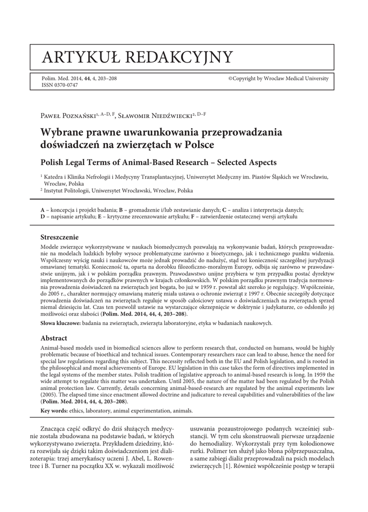 Artykuł Redakcyjny Polim. Med. 2014, 44, 4, 203–208 ISSN 0370-0747 © Copyright by Wroclaw Medical University Paweł Poznański1, A–D, F, Sławomir Niedźwiecki2, D–F Wybrane prawne uwarunkowania przeprowadzania doświadczeń na zwierzętach w Polsce Polish Legal Terms of Animal-Based Research – Selected Aspects 1 Katedra i Klinika Nefrologii i Medycyny Transplantacyjnej, Uniwersytet Medyczny im. Piastów Śląskich we Wrocławiu, Wrocław, Polska 2Instytut Politologii, Uniwersytet Wrocławski, Wrocław, Polska A – koncepcja i projekt badania; B – gromadzenie i/lub zestawianie danych; C – analiza i interpretacja danych; D – napisanie artykułu; E – krytyczne zrecenzowanie artykułu; F – zatwierdzenie ostatecznej wersji artykułu Streszczenie Modele zwierzęce wykorzystywane w naukach biomedycznych pozwalają na wykonywanie badań, których przeprowadzenie na modelach ludzkich byłoby wysoce problematyczne zarówno z bioetycznego, jak i technicznego punktu widzenia. Współczesny wyścig nauki i naukowców może jednak prowadzić do nadużyć, stąd też konieczność szczególnej jurydyzacji omawianej tematyki. Konieczność ta, oparta na dorobku filozoficzno-moralnym Europy, odbija się zarówno w prawodawstwie unijnym, jak i w polskim porządku prawnym. Prawodawstwo unijne przybiera w tym przypadku postać dyrektyw implementowanych do porządków prawnych w krajach członkowskich. W polskim porządku prawnym tradycja normowania prowadzenia doświadczeń na zwierzętach jest bogata, bo już w 1959 r. powstał akt szeroko je regulujący. Współcześnie, do 2005 r., charakter normujący omawianą materię miała ustawa o ochronie zwierząt z 1997 r. Obecnie szczegóły dotyczące prowadzenia doświadczeń na zwierzętach reguluje w sposób całościowy ustawa o doświadczeniach na zwierzętach sprzed niemal dziesięciu lat. Czas ten pozwolił ustawie na wystarczające okrzepnięcie w doktrynie i judykaturze, co odsłoniło jej możliwości oraz słabości (Polim. Med. 2014, 44, 4, 203–208). Słowa kluczowe: badania na zwierzętach, zwierzęta laboratoryjne, etyka w badaniach naukowych. Abstract Animal-based models used in biomedical sciences allow to perform research that, conducted on humans, would be highly problematic because of bioethical and technical issues. Contemporary researchers race can lead to abuse, hence the need for special law regulations regarding this subject. This necessity reflected both in the EU and Polish legislation, and is rooted in the philosophical and moral achievements of Europe. EU legislation in this case takes the form of directives implemented in the legal systems of the member states. Polish tradition of legislative approach to animal-based research is long. In 1959 the wide attempt to regulate this matter was undertaken. Until 2005, the nature of the matter had been regulated by the Polish animal protection law. Currently, details concerning animal-based-research are regulated by the animal experiments law (2005). The elapsed time since enactment allowed doctrine and judicature to reveal capabilities and vulnerabilities of the law (Polim. Med. 2014, 44, 4, 203–208). Key words: ethics, laboratory, animal experimentation, animals. Znacząca część odkryć do dziś służących medycynie została zbudowana na podstawie badań, w których wykorzystywano zwierzęta. Przykładem dziedziny, która rozwijała się dzięki takim doświadczeniom jest dializoterapia: trzej amerykańscy uczeni J. Abel, L. Rowentree i B. Turner na początku XX w. wykazali możliwość usuwania pozaustrojowego podanych wcześniej substancji. W tym celu skonstruowali pierwsze urządzenie do hemodializy. Wykorzystali przy tym kolodionowe rurki. Polimer ten służył jako błona półprzepuszczalna, a same zabiegi dializ przeprowadzali na psich modelach zwierzęcych [1]. Również współcześnie postęp w terapii 204 P. Poznański, S. Niedźwiecki nerkozastępczej, w tym badania nad polimerami służącymi do dializoterapii, opiera się na badaniach prowadzonych na zwierzętach [2]. Za przykłady innych, równie istotnych dla podwalin medycyny odkryć mogą służyć prace Roberta Kocha z drugiej połowy XIX w. nad Bacillus anthracis i następnie przedstawienie przez niego tzw. Postulatów Kocha [3]. Także w dziedzinie immunologii najważniejsze badania nad strukturą przeciwciał zostały oparte na komórkach plazmatycznych myszy chorych na szpiczaka mnogiego. Współczesna transplantologia opiera się natomiast na badaniach, w których leczono choroby hematologiczne u myszy poprzez przeszczepianie szpiku kostnego [4]. Doświadczenia na zwierzętach przyczyniały się ponadto do rozwoju między innymi takich obszarów, jak diagnostyka chorób zakaźnych czy lekooporność. Miały też wpływ na rozwój współczesnej wakcynologii, terapii przeciwnowotworowej, chirurgii eksperymentalnej i wielu innych [5]. Modele zwierzęce były wykorzystywane w licznych dziedzinach i obszarach medycyny. W latach 1996–2001 przyznano sześć Nagród Nobla w dziedzinie fizjologii i medycyny – w pięciu nagrodzonych badaniach zostały wykorzystane modele zwierzęce [5]. Normy etyczne a normy prawne Z przytoczonych powyżej przykładów wynika, że badania nad zwierzętami stanowiły często ich główny element, a zaprzestanie eksperymentów na zwierzętach mogłoby odebrać możliwość rozwoju niektórym obszarom medycyny, w innych zaś zmusiłoby do eksperymentowania bezpośrednio na człowieku. Jeśli jednak etycznie nie dopuszczamy do przeprowadzenia ich na ludziach, to co uzasadnia wykorzystanie zwierząt jako gatunków modelowych? Pierwszą przesłanką jest brak alternatywnych modeli, gdyż zarówno badania na układach modelowych in vitro, jak i tworzenie symulacji komputerowych można uznać jedynie za pomocnicze wobec badań in vivo. Należy przy tym pamiętać, iż transponowanie wyników badań z modeli zwierzęcych na gatunek docelowy w sposób bezkrytyczny m