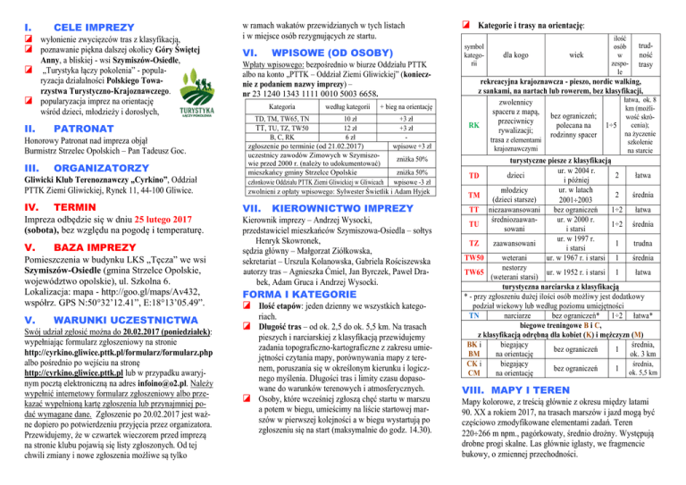 I. CELE IMPREZY wyłonienie zwycięzców tras z klasyfikacją, poznawanie piękna dalszej okolicy Góry Świętej Anny, a bliskiej - wsi Szymiszów-Osiedle, „Turystyka łączy pokolenia” - popularyzacja działalności Polskiego Towarzystwa Turystyczno-Krajoznawczego. popularyzacja imprez na orientację wśród dzieci, młodzieży i dorosłych, II. PATRONAT Honorowy Patronat nad impreza objął Burmistrz Strzelec Opolskich – Pan Tadeusz Goc. III. ORGANIZATORZY Gliwicki Klub Terenoznawczy „Cyrkino”, Oddział PTTK Ziemi Gliwickiej, Rynek 11, 44-100 Gliwice. IV. TERMIN Impreza odbędzie się w dniu 25 lutego 2017 (sobota), bez względu na pogodę i temperaturę. V. BAZA IMPREZY Pomieszczenia w budynku LKS „Tęcza” we wsi Szymiszów-Osiedle (gmina Strzelce Opolskie, województwo opolskie), ul. Szkolna 6. Lokalizacja: mapa - http://goo.gl/maps/Av432, współrz. GPS N:50°32’12.41”, E:18°13’05.49”. V. WARUNKI UCZESTNICTWA Swój udział zgłosić można do 20.02.2017 (poniedziałek): wypełniając formularz zgłoszeniowy na stronie http://cyrkino.gliwice.pttk.pl/formularz/formularz.php albo pośrednio po wejściu na stronę http://cyrkino.gliwice.pttk.pl lub w przypadku awaryjnym pocztą elektroniczną na adres [email protected]. Należy wypełnić internetowy formularz zgłoszeniowy albo przekazać wypełnioną kartę zgłoszenia lub przynajmniej podać wymagane dane. Zgłoszenie po 20.02.2017 jest ważne dopiero po potwierdzeniu przyjęcia przez organizatora. Przewidujemy, że w czwartek wieczorem przed imprezą na stronie klubu pojawią się listy zgłoszonych. Od tej chwili zmiany i nowe zgłoszenia możliwe są tylko w ramach wakatów przewidzianych w tych listach i w miejsce osób rezygnujących ze startu. VI. WPISOWE (OD OSOBY) Wpłaty wpisowego: bezpośrednio w biurze Oddziału PTTK albo na konto „PTTK – Oddział Ziemi Gliwickiej” (koniecznie z podaniem nazwy imprezy) – nr 23 1240 1343 1111 0010 5003 6658. Kategoria według kategorii + bieg na orientację TD, TM, TW65, TN 10 zł +3 zł 12 zł +3 zł TT, TU, TZ, TW50 B, C, RK 6 zł zgłoszenie po terminie (od 21.02.2017) wpisowe +3 zł uczestnicy zawodów Zimowych w Szymiszozniżka 50% wie przed 2000 r. (należy to udokumentować) mieszkańcy gminy Strzelce Opolskie zniżka 50% członkowie Oddziału PTTK Ziemi Gliwickiej w Gliwicach wpisowe -3 zł zwolnieni z opłaty wpisowego: Sylwester Świetlik i Adam Hyjek VII. KIEROWNICTWO IMPREZY Kierownik imprezy – Andrzej Wysocki, przedstawiciel mieszkańców Szymiszowa-Osiedla – sołtys Henryk Skowronek, sędzia główny – Małgorzat Ziółkowska, sekretariat – Urszula Kolanowska, Gabriela Rościszewska autorzy tras – Agnieszka Ćmiel, Jan Byrczek, Paweł Drabek, Adam Gruca i Andrzej Wysocki. FORMA I KATEGORIE Ilość etapów: jeden dzienny we wszystkich kategoriach. Długość tras – od ok. 2,5 do ok. 5,5 km. Na trasach pieszych i narciarskiej z klasyfikacją przewidujemy zadania topograficzno-kartograficzne z zakresu umiejętności czytania mapy, porównywania mapy z terenem, poruszania się w określonym kierunku i logicznego myślenia. Długości tras i limity czasu dopasowane do warunków terenowych i atmosferycznych. Osoby, które wcześniej zgłoszą chęć startu w marszu a potem w biegu, umieścimy na liście startowej marszów w pierwszej kolejności a w biegu wystartują po zgłoszeniu się na start (maksymalnie do godz. 14.30). Kategorie i trasy na orientację: symbol kategorii dla kogo wiek ilość osób w zespole trudność trasy rekreacyjna krajoznawcza - pieszo, nordic walking, z sankami, na nartach lub rowerem, bez klasyfikacji, łatwa, ok. 8 zwolennicy km (możlispaceru z mapą, bez ograniczeń; wość skróprzeciwnicy cenia); polecana na 1÷5 RK rywalizacji; na życzenie rodzinny spacer trasa z elementami szkolenie krajoznawczymi na starcie turystyczne piesze z klasyfikacją ur. w 2004 r. dzieci 2 łatwa TD i później ur. w latach młodzicy 2 średnia TM (dzieci starsze) 20012003 bez ograniczeń 1÷2 łatwa TT niezaawansowani średniozaawanur. w 2000 r. 1÷2 średnia TU sowani i starsi ur. w 1997 r. zaawansowani 1 trudna TZ i starsi weterani ur. w 1967 r. i starsi 1 średnia TW50 nestorzy ur. w 1952 r. i starsi 1 łatwa TW65 (weterani starsi) turystyczna narciarska z klasyfikacją * - przy zgłoszeniu dużej ilości osób możliwy jest dodatkowy podział wiekowy lub według poziomu umiejętności narciarze bez ograniczeń* 1÷2 łatwa* TN biegowe treningowe B i C, z klasyfikacją odrębną dla kobiet (K) i mężczyzn (M) BK i biegający średnia, bez ograniczeń 1 na orientację ok. 3 km BM CK i biegający średnia, bez ograniczeń 1 ok. 5,5 km na orientację CM VIII. MAPY I TEREN Mapy kolorowe, z treścią głównie z okresu między latami 90. XX a rokiem 2017, na trasach marszów i jazd mogą być częściowo zmodyfikowane elementami zadań. Teren 220266 m npm., pagórkowaty, średnio drożny. Występują drobne progi skalne. Las głównie iglasty, we fragmencie bukowy, o zmiennej przechodności. IX. JAK DOTRZEĆ DO BAZY Szymiszów-Osiedle jest zachodnią częścią (odrębne sołectwo) wsi Szymiszów, znajdującą się ok. 7 km na zachód od Strzelec Opolskich, po północnej stronie linii kolejowej Gliwice – Strzelce Op. – Opole, przy szosie z Kalinowa do Suchej. Na południowym obrzeżu osiedla jest stacja kolejowa Szymiszów. Od stacji do bazy należy iść najpierw na zachód do przejazdu kolejowego, potem 810 m na północ ulica Ligonia, a na koniec skręcić w lewo (na zachód) w ulicę Szkolną 260 m. Odjazdy pociągów Przewozów Regionalnych do Szymiszowa (drugie warianty tylko dla tras rekreacyjnej i biegowych): z Gliwic 7.29 i 10.46 przez Strzelce Op. 8.05 i 11.21, przyjazd 8.09 i 11.25; z Opola 9.17 i 12.15, przyjazd 9.38 i 12.37. X. ŚWIADCZENIA mapa w koszulce foliowej i opis zadań dla uczestnika, w kategoriach TD, TM, TU, TZ, TW50, TW65 i TN nagrody dla zwycięzców oraz dyplomy od 1 do co najmniej 3 miejsca; w 