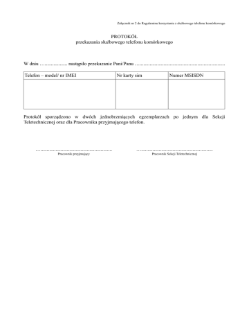 Załącznik nr 2 do Regulaminu korzystania z służbowego telefonu komórkowego PROTOKÓŁ przekazania służbowego telefonu komórkowego W dniu ….................. nastąpiło przekazanie Pani/Panu ….................................................................... Telefon – model/ nr IMEI Nr karty sim Numer MSISDN Protokół sporządzono w dwóch jednobrzmiących egzemplarzach po jednym dla Sekcji Teletechnicznej oraz dla Pracownika przyjmującego telefon. …......................................................... …......................................................... Pracownik przyjmujący Pracownik Sekcji Teletechnicznej