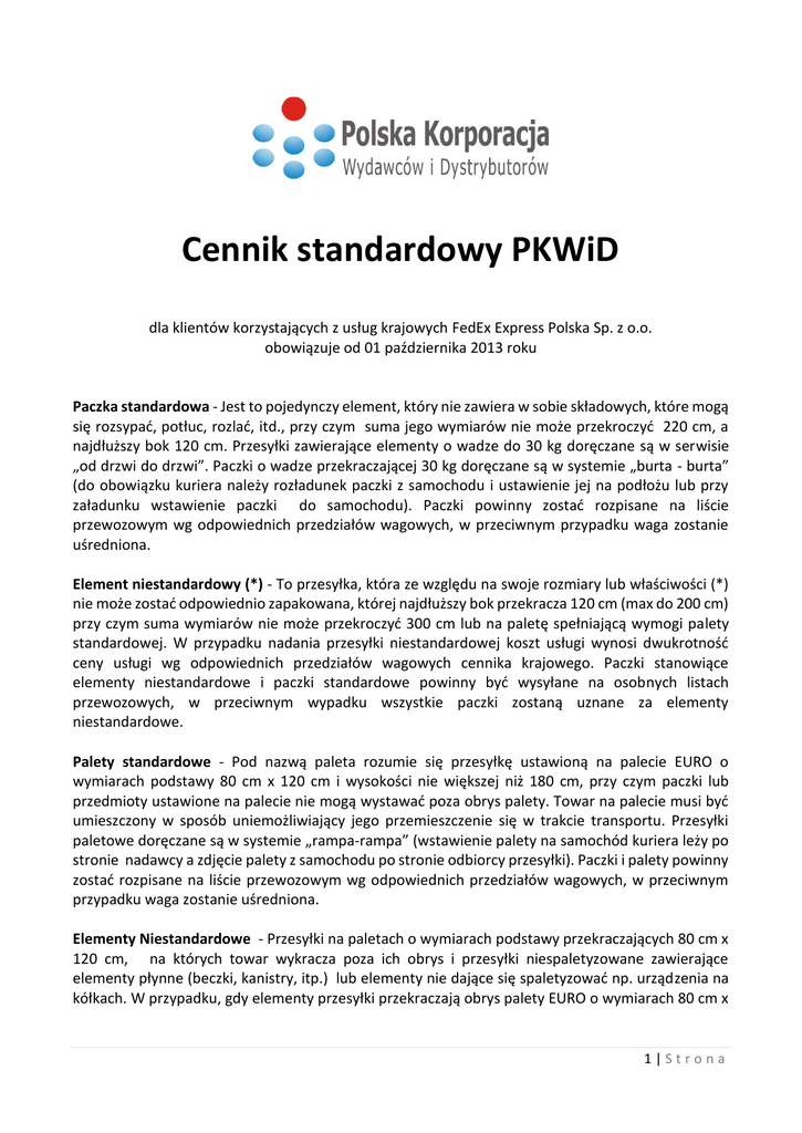 Cennik standardowy PKWiD dla klientów korzystających z usług krajowych FedEx Express Polska Sp. z o.o. obowiązuje od 01 października 2013 roku Paczka standardowa - Jest to pojedynczy element, który nie zawiera w sobie składowych, które mogą się rozsypać, potłuc, rozlać, itd., przy czym suma jego wymiarów nie może przekroczyć 220 cm, a najdłuższy bok 120 cm. Przesyłki zawierające elementy o wadze do 30 kg doręczane są w serwisie „od drzwi do drzwi”. Paczki o wadze przekraczającej 30 kg doręczane są w systemie „burta - burta” (do obowiązku kuriera należy rozładunek paczki z samochodu i ustawienie jej na podłożu lub przy załadunku wstawienie paczki do samochodu). Paczki powinny zostać rozpisane na liście przewozowym wg odpowiednich przedziałów wagowych, w przeciwnym przypadku waga zostanie uśredniona. Element niestandardowy (*) - To przesyłka, która ze względu na swoje rozmiary lub właściwości (*) nie może zostać odpowiednio zapakowana, której najdłuższy bok przekracza 120 cm (max do 200 cm) przy czym suma wymiarów nie może przekroczyć 300 cm lub na paletę spełniającą wymogi palety standardowej. W przypadku nadania przesyłki niestandardowej koszt usługi wynosi dwukrotność ceny usługi wg odpowiednich przedziałów wagowych cennika krajowego. Paczki stanowiące elementy niestandardowe i paczki standardowe powinny być wysyłane na osobnych listach przewozowych, w przeciwnym wypadku wszystkie paczki zostaną uznane za elementy niestandardowe. Palety standardowe - Pod nazwą paleta rozumie się przesyłkę ustawioną na palecie EURO o wymiarach podstawy 80 cm x 120 cm i wysokości nie większej niż 180 cm, przy czym paczki lub przedmioty ustawione na palecie nie mogą wystawać poza obrys palety. Towar na palecie musi być umieszczony w sposób uniemożliwiający jego przemieszczenie się w trakcie transportu. Przesyłki paletowe doręczane są w systemie „rampa-rampa” (wstawienie palety na samochód kuriera leży po stronie nadawcy a zdjęcie palety z samochodu po stronie odbiorcy przesyłki). Paczki i palety powinny zostać rozpisane na liście przewozowym wg odpowiednich przedziałów wagowych, w przeciwnym przypadku waga zostanie uśredniona. Elementy Niestandardowe - Przesyłki na paletach o wymiarach podstawy przekraczających 80 cm x 120 cm, na których towar wykracza poza ich obrys i przesyłki niespaletyzowane zawierające elementy płynne (beczki, kanistry, itp.) lub elementy nie dające się spaletyzować np. urządzenia na kółkach. W przypadku, gdy elementy przesyłki przekraczają obrys palety EURO o wymiarach 80 cm x 1|Strona 120 cm i wysokości nie większej niż 180 cm, koszt usługi wynosi dwukrotność ceny wg odpowiednich przedziałów wagowych cennika krajowego. Jeżeli przedmioty przekraczają ponad dwukrotnie wymiary palety EURO cena wynosi odpowiednią wielokrotność zajętych miejsc paletowych. (*) Elementy, których: wymiary są większe niż 120 cm x 50 cm x 50 cm: w formie walca, kuli lub o nieregularnych kształtach z wystającymi elementami, oznakowane etykietami „Góra/Dół” oraz „Ostrożnie szkło”, których zawartość stanowią chemikalia (farby, lakiery, rozpuszczalniki, itp.). Serwis Krajowy Usługi podstawowe Waga paczki w kg Do 1 kg Do 5 kg Do 10 kg Do 15 kg Do 20 kg Do 30 kg Powyżej 30 kg dodatkowa opłata za 10 kg Do 100 kg** Do 300 kg** Do 500 kg** Do 800 kg** Do 1000 kg** Powyżej 1000 kg** Cena standardowa* 18,00 zł 19,00 zł 20,00 zł 21,00 zł 22,00 zł 23,00 zł 12,00 zł 100,00 zł 120,00 zł 150,00 zł 180,00 zł 200,00 zł 400,00 zł * Cena za jedną paczkę w przesyłce. Jeżeli waga rzeczywista lub gabarytowa paczki przekracza 70 kg, paczka musi być umieszczona na palecie, wycena wg cennika paletowego. Jeżeli paczka o wadze rzeczywistej lub gabarytowej powyżej 70 kg nie mieści się na palecie o wymiarach EURO jest wyceniana z cennika paletowego + dopłata za paletę niestandardową. *** Zleceniobiorca nie przyjmuje do przewozu palet cięższych niż 1000 kg (dopuszcza się realizację wykonania usługi według niniejszych warunków tylko i wyłącznie po uprzednim uzgodnieniu z lokalnym przedstawicielem FedEx Express Polska Sp. z o.o.) Powyższe ceny dotyczą przesyłek nadanych w godz. 8:00-17:00; paczkowych doręczanych następnego dnia roboczego z gwarantowanym terminem doręczenia na poziomie 95% oraz przesyłek paletowych doręczanych w ciągu 2 dni roboczych. Przesyłka dłużycowa Jest to jeden element o długości od 200 cm do 300 cm, przy czym suma pozostałych dwóch wymiarów nie przekracza 80 cm oraz o wadze rzeczywistej do 30 kg - wycena wg wagi przeliczeniowej 300 kg. Nie przyjmuje się do przewozu 2|Strona przesyłek dłużycowych o wadze jednostkowej powyżej 30 kg lub długości przekraczającej 300 cm. Przesyłka gabarytowa Przesyłki o niskiej wadze i dużej objętości traktowane są jako przesyłki gabarytowe. Wycena z wagi gabarytowej następuje gdy wynik z poniższego wzoru przekracza wagę rzeczywistą: waga gabarytowa = wysokość (cm) x długość (cm) x szerokość (cm) / 6000 Usługi dodatkowe i opcje niestandardowe Pobranie i ubezpieczenie Cena standardowa Usługa za pobraniem COD Polega na pobraniu należności za doręczony towar i przekazaniu jej wyłącznie w formie przelewu bankowego na konto wskazane przez nadawcę w ciągu 14 dni roboczych od dnia doręczenia przesyłki. Przesyłka " za pobraniem " musi być ubezpieczona co najmniej do kwoty pobrania. Ubezpieczenie przesyłki Każda przesyłka powinna być ubezpieczona poprzez wpisanie na liście przewozowym w rubryce "wartość ubezpieczenia" rzeczywistej wartości przesyłki Zastrzeżenia odbioru/doręczenia doręczenie przesyłki do godz. 10:00 doręczenie przesyłki do godz. 12:00 doręczenie przesyłki w godz. 17:00-19:00 doręczenie przesyłki w godz. 19:00-22:00 odbiór przesyłki w godzinach 17:00-19:00 Do 100 zł Do 200 zł Do 300 zł Do 400 zł Do 500 zł Do 100