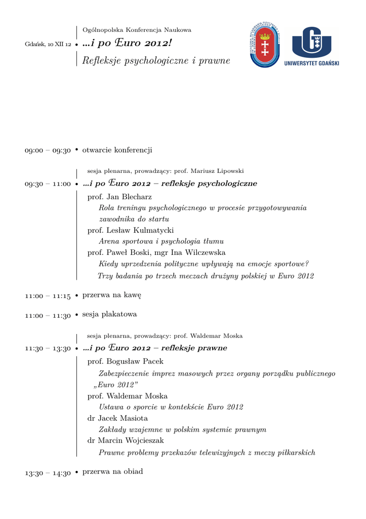 : – : • Gdańsk, XII Ogólnopolska Konferencja Naukowa • …i Gdańsk, XII : po Euro ! Refleksje psychologiczne i prawne : – : • otwarcie konferencji : – : • sesja plenarna, prowadzący: prof. Mariusz Lipowski : – : • …i po Euro – refleksje psychologiczne prof. Jan Blecharz Rola treningu psychologicznego w procesie przygotowywania zawodnika do startu prof. Lesław Kulmatycki Arena sportowa i psychologia tłumu prof. Paweł Boski, mgr Ina Wilczewska Kiedy uprzedzenia polityczne wpływają na emocje sportowe? Trzy badania po trzech meczach drużyny polskiej w Euro 2012 : – : • przerwa na kawę : – : • sesja plakatowa : – : • sesja plenarna, prowadzący: prof. Waldemar Moska : – : • …i po Euro – refleksje prawne prof. Bogusław Pacek Zabezpieczenie imprez masowych przez organy porządku publicznego „Euro 2012” prof. Waldemar Moska Ustawa o sporcie w kontekście Euro 2012 dr Jacek Masiota Zakłady wzajemne w polskim systemie prawnym dr Marcin Wojcieszak Prawne problemy przekazów telewizyjnych z meczy piłkarskich : – : • przerwa na obiad : – : • : – : • sesja tematyczna, prowadzący: prof. Bogusław Pacek Wokół prawa sportowego dr Jan Kudrelek Dowodowe wykorzystanie monitoringu w postępowaniu karnym w świetle ustawy o bezpieczeństwie imprez masowych dr Filip Przybylski-Lewandowski Historia prawnych uwarunkowań współzawodnictwa sportowego – przyczynek dr Jacek Potulski Nowelizacja prawa karnego na Euro 2012. Sens i praktyka dr Paweł Petasz Uwag kilka o ryzyku sportowym jako okoliczności wyłączającej kryminalną bezprawność czynu dr Beata Ruszkiewicz Wpływ sportowych imprez masowych na kształtowanie się społeczeństwa obywatelskiego w Polsce dr Karolina Tetłak Zwolnienia podatkowe na Euro 2012 : – : • przerwa na kawę : – : • sesja tematyczna, prowadzący: prof. Franciszek Makurat : – : • Wokół psychologii sportu prof. Franciszek Makurat Obraz kibiców w środkach masowego przekazu przed i po Euro 2012 prof. Mariusz Lipowski Piłkarz – idol czy narcyz? prof. Marcin Krawczyński Dynamika grupy sportowej na przykładzie zespołu piłki nożnej – stan aktualny i perspektywy dalszych badań dr Jacek Gwoździewicz, mgr Paweł Brandt Zabezpieczenie medyczne turnieju Euro 2012 dr Marek Graczyk Projekt SIOKO – jego założenia programowe, realizacja i efekty dr Ryszard Makarowski Ile stresu w stresie, aby osiągnąć sportowy cel dr Jan Supiński Uniwersalne wartości sportu – teraźniejszość i przyszłość : – : • zakończenie konferencji wręczenie nagród za najlepsze postery podsumowanie obrad : – : • kolacja