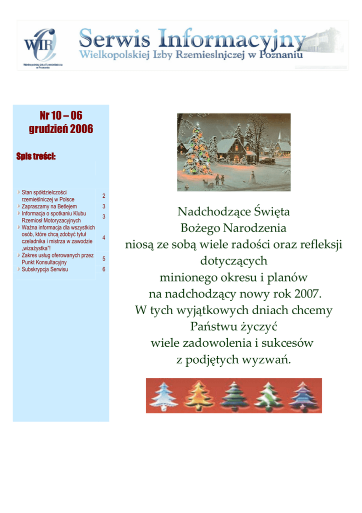 Nr 10 – 06 grudzień 2006 Spis treści: Stan spółdzielczości rzemieślniczej w Polsce Zapraszamy na Betlejem Informacja o spotkaniu Klubu Rzemiosł Motoryzacyjnych Ważna informacja dla wszystkich osób, które chcą zdobyć tytuł czeladnika i mistrza w zawodzie „wizażystka”! Zakres usług oferowanych przez Punkt Konsultacyjny Subskrypcja Serwisu 2 3 3 4 5 6 Nadchodzące Święta Bożego Narodzenia niosą ze sobą wiele radości oraz refleksji dotyczących minionego okresu i planów na nadchodzący nowy rok 2007. W tych wyjątkowych dniach chcemy Państwu życzyć wiele zadowolenia i sukcesów z podjętych wyzwań. Stan spółdzielczości rzemieślniczej w Polsce. Prezentowany stan spółdzielczości rzemieślniczej oparty został na przeprowadzanych okresowo badaniach ankietowych oraz materiałach z lustracji. Dokonując podsumowania informacji ankietowych oraz materiałów lustracyjnych odnoszących się do warunków, możliwości i cech charakterystycznych w działalności spółdzielni rzemieślniczych należy zwrócić w szczególności uwagę na rysujące się tendencje. Zanikanie podstawowych niegdyś form działalności spółdzielni, postawiło większość rzemieślniczych organizacji spółdzielczych w dość dramatycznej sytuacji. Badania ankietowe potwierdziły założenia, że znaczna część dotychczasowego stanu spółdzielni będzie miała w najbliższym czasie bardzo poważne trudności w dalszym funkcjonowaniu, jeżeli kierownictwa tych jednostek postawione będą w obliczu niepewności i dezorientacji wywołanej przeciągającymi się pracami nad prawem spółdzielczym i pozostałymi przepisami regulującymi działalność spółdzielni. Stan organizacyjny spółdzielni na przestrzeni ostatnich kilkunastu lat przedstawia poniższe zestawienie: 1990r. – 593 spółdzielnie, 1992r. – 469 spółdzielni, 1994r. – 422 spółdzielnie, 1996r. – 360 spółdzielni, 1998r. – 292 spółdzielnie, 2000r. – 280 spółdzielni, 2004r. – 265 spółdzielni, 2006r. – ok. 250 spółdzielni. • • prowadzenie biur rachunkowych – 19%, inne – 4%. Z przedstawionych powyżej danych liczbowy wynika, iż systematycznie spada ilość spółdzielni. Niestety polityka gospodarcza państwa nie sprzyja funkcjonowaniu i rozwojowi spółdzielczości rzemieślniczej. Przyczyny spadku liczby spółdzielni podzielić można na zewnętrzne i wewnętrzne. Podstawowe przyczyny zewnętrzne to: • niesprzyjające rozwojowi spółdzielczości prawo, zwłaszcza to obowiązujące na początku lat dziewięćdziesiątych, • nierówność na niekorzyść spółdzielni unormowań prawnych w stosunku do spółek prawa handlowego, • duży koszt pozyskiwania zewnętrznych źródeł finansowania działalności spółdzielni, • traktowanie spółdzielni przez państwo i jego organa jako pozostałości starego systemu, • brak pozytywnego nastawienia środowiska gospodarczego do tej formy aktywności gospodarczej, • negatywny stosunek mediów. Główne przyczyny wewnętrzne: • zerwanie więzi gospodarczych i społecznych pomiędzy przedsiębiorcami i spółdzielnią, • niedowład organizacyjny i słabość kadry zarządzającej, • brak pomysłów i wyobraźni władz samorządowych na dalszą działalność spółdzielni, • kryzys tożsamości spółdzielczej i członkostwa, • problemy z wykorzystaniem potencjału ekonomicznego spółdzielni. Analizując liczbę członków spółdzielni, stwierdzić należy, że największą grupę stanowią spółdzielnie mające 20-50 członków /72%, następnie powyżej 50 członków /19%/, a grupa poniżej 20 członków stanowi 9% łącznej liczby badanych spółdzielni. Wszystko to powoduje, że coraz większe wyzwania stają Jeśli chodzi o obsługę administracyjną to przeważają spółdzielnie przed kadrą zarządzającą i spółdzielczym samorządem. zatrudniające poniżej 5 osób /45%/. Kierownictwa spółdzielni cały czas stoją przed problemami Na terenie działania Wielkopolskiej Izby Rzemieślniczej związanymi z ciągłym dostosowywaniem do zmieniających się utrzymuje więź z WIR 20 spółdzielni, stanowi to ok. 8% wszystkich warunków. Spółdzielnie, które tego nie robiły, już przestały istnieć spółdzielni rzemieślniczych w Polsce. Jeśli chodzi o liczbę albo znajdują się w trakcie procesu likwidacyjnego. członków to dominują – podobnie jak w skali kraju - spółdzielnie o Wydaje się, że szansą jest branżowość i specjalizacja liczbie członków 20-50 – 58%, następnie spółdzielnie poniżej 20 spółdzielczości przy równocześnie jej dużej elastyczności w członków – 33% i powyżej 50 członków – 9% - czyli odwrotnie jak zakresie reagowania na zmieniające się potrzeby rynku. Należy w kraju. wzorem klastrów w struktury spółdzielni przyjmować firmy i Wielkość zatrudnienia w administracji spółdzielni kształtuje się instytucje zapewniające obsługę całego procesu gospodarczego podobnie jak w kraju – dominują spółdzielnie zatrudniające ok. 5 od instytutów badawczych, poprzez firmy zaopatrzeniowe, osób. marketingowe do firm dystrybucyjnych, a nawet firm Z analizy danych wynika, że majątek trwały jest poważnym atutem pozyskujących zewnętrzne źródła finansowania. spółdzielczości rzemieślniczej. Budynki administracyjnomagazynowe są prawie w 100% własnością spółdzielni, następnie Informację opracowano w oparciu o materiał otrzymany ze ZRP w grunty w 90%, maszyny i urządzenia w 64% i środki transportu w Warszawie pt. „Ocena aktualnego stanu organizacyjnego i sytuacji 18%. Jest to w większości pozostałość z dawnych lat rozwoju tej ekonomiczno-finansowej spółdzielni rzemieślniczych”. formy organizacyjnej działalności. Źródła przychodu i obecne kierunki działalności spółdzielni rzemieślniczych to: • działalność statutowa – 45%, • wynajem pomieszczeń – 32%, Opracowanie Wiesław Ratajczak Serwis Informacyjny Wielk