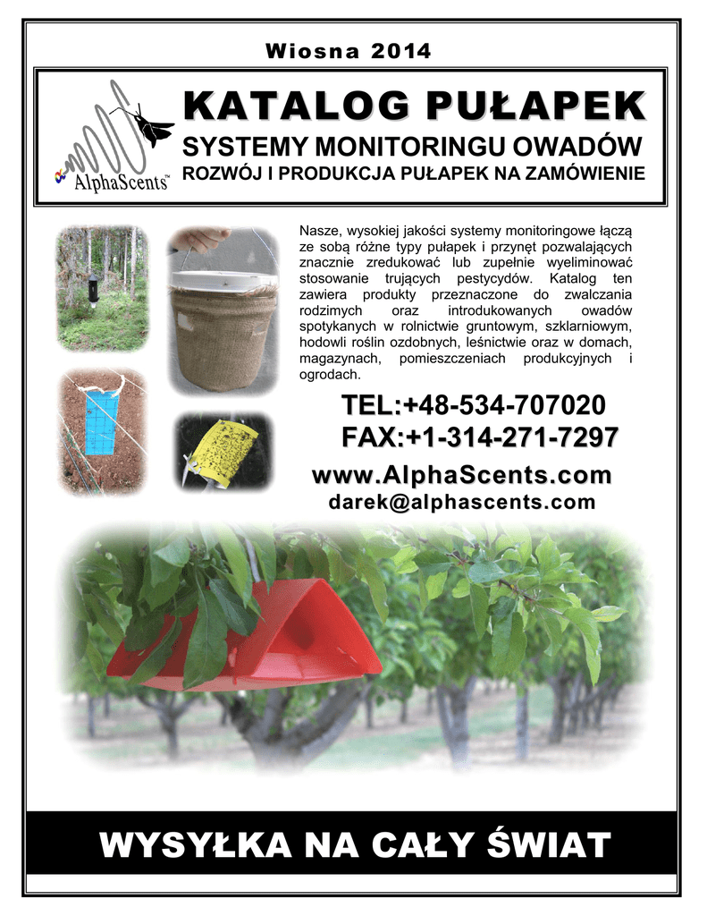 W i o s n a 2 0 1 KATALOG PUŁAPEK SYSTEMY MONITORINGU OWADÓW ROZWÓJ I PRODUKCJA PUŁAPEK NA ZAMÓWIENIE Nasze, wysokiej jakości systemy monitoringowe łączą ze sobą różne typy pułapek i przynęt pozwalających znacznie zredukować lub zupełnie wyeliminować stosowanie trujących pestycydów. Katalog ten zawiera produkty przeznaczone do zwalczania rodzimych oraz introdukowanych owadów spotykanych w rolnictwie gruntowym, szklarniowym, hodowli roślin ozdobnych, leśnictwie oraz w domach, magazynach, pomieszczeniach produkcyjnych i ogrodach. TEL:+4 18-534-707020 FAX:+1-314-271-7297 www.AlphaScents.com [email protected] WYSYŁKA NA CAŁY ŚWIAT ALPHA SCENTS PUŁAPKA DELTA JEDNORAZOWEGO UŻYTKU PRZEZNACZENIE: Ćmy, motyle (Lepidoptera) Wygodny i prosty montaż. Wystarczy połączyć na szczycie zszywaczen bądź spinaczem biurowym. Pułapka wewnątrz pokryta jest naszym znakomitym, niebrudzącym klejem No-Mess Adhesive™. Przyklejają się do niego tylko owady, nie plantator. Niewielkie otwory wejsciowe, przy prawidłowym montażu zmniejszają ryzyko dla ptaków natomiast nie ograniczają możliwości wejścia owadom. Pułapka odporna jest na niesprzyjające warunki atmosferyczne. Ekologiczna – podlegająca biodegradacji. Do stosowania w połączeniu z przynętami (sprzedawanymi osobno). OPIS PUŁAPKI: KOLOR CZERWONY Składniki: pułapka z samoprzylepnym wnętrzem i wieszak Wymiary (po zmontowaniu): 18 D x 10Sz x 11,4W cm 2 Powierzchnia pokryta klejem: 497 cm Rozmiar siatki: 2,5 x 2,5 cm Otwór na wieszak: 1 po montażu pułapki WIELOSEZONOWA PUŁAPKA PLASTIKOWA TYPU DELTA Stosowanie wielosezonowe, Bardzo prosty, samodzielny montaż na plantacji, bez dodatkowych narzędzi, wymienna wkładka pokryta naszym znakomitym klejem No-Mess Adhesive™. Odporna na niesprzyjające warunki atmosferyczne. Magazynowana i wysyłana w formie niezmontowanej. W komplecie używana łącznie z przynętą (w osobnej sprzedaży). PRZEZNACZENIE: Ćmy, motyle (Lepidoptera) OPIS PUŁAPKI: KOLOR CZERWONY LUB BIAŁY Składniki: pułapka, wieszak, wkładka Wymiary pułapki po złożeniu: 28D x 19Sz x 13W cm Wymiary wkładki: 18 x 18 cm Powierzchnia aktywna (pokryta klejem): 232 cm2 Siatka na wkładce: 2,5 x 2,5 cm WIELOKROTNEGO UŻYTKU PUŁAPKA JACKSONA Pułapka wielokrotnego użytku używana w komplecie z wymienną wkładką pokrytą naszym znakomitym klejem No-Mess Adhesive. Prosta w montażu na plantacji. Ekologiczna – ulegająca biodegradacji. Konieczna przynęta (w osobnej sprzedaży). Magazynowana i wysyłana w formie niezmontowanej. PRZEZNACZENIE: Muszki OPIS PUŁAPKI: 2 ALPHA SCENTS Owocówki, Muchówki Składniki: pułapka, wieszak, wkładka Wymiary pułapki: 13Dx9Szx8W cm Wymiary wkładki: 18 x 18 cm Powierzchnia aktywna (pokryta klejem): 232 cm2 TEL: +48-534-707020 • FAX +1-314-271-7297 ALPHA SCENTS NO-MESS ADHESIVE™ PŁASKIE PUŁAPKI KARTONOWE Skuteczność odłowu 1,5-2,2 raza wyższa niż innych marek potwierdzona badaniami przeprowadzonymi przez Departament Rolnictwa Stanów Zjednoczonych (USDA). Odporne na niesprzyjające warunki atmosferyczne i zraszacze używane w deszczowniach. Ekologiczne – ulegające biodegradacji. Używane w komplecie z przynętą (w osobnej sprzedaży). PRODUKT ŻÓŁTA KARTA na nasionnice, stonkę kukurydzianą I inne chrząszcze, pasikoniki, skoczki i koliszki, osy, wciornastki, mączliki oraz wiele innych. Powirzchnia lepowa 13 cm x 20 cm (z ubu stron). ŻÓŁTA KARTA 2 STRONY LEPOWE JEDNOSTRONNA ŻÓŁTA KARTA (można zawiesić lub owinąć wokół gałęzi lub kołka wbitego w ziemię). Zastosowanie jak wyżej. Powierzchnia lepowa 20 cm x 26 cm (jednostronnna) ZIELONA KARTA 2 STRONY LEPOWE ZIELONA KARTA, atrakcyjna dla wciornastków, mszyc, skoczków i koliszków. Powierzchnia lepowa 7.5 cm x 12 cm (z obu stron) NIEBIESKO/ŻÓŁTA KARTA na wciornastki, mączliki, owocówki, mszyce, skoczki, koliszki, stonki kukurydziane i inne chrząszcze. Powierzchnia lepowa 8 cm x 20 cm (jedna strona żółta, druga niebieska) NIEBIESKOŻÓŁTA KARTA JEDNOSTRONNA, SKLADANA DO TYLU ZOŁTA KARTA ALPHA SCENTS BUGEND™ PUŁAPKA NA SZKODNIKI SPIŻARNIOWE Z FEROMONEM ZAIMPREGNOWANYM W KLEJU Pułapka na szkodniki spiżarniowe ma feromon zaimpregnowany w kleju do zwabiania i odłowu ciem i chrząszczy które atakują suche jedzenie i pasze, kwiaty, tytoń, skóry i futra. PRZEZNACZONA DLA NASTĘPUJĄCYCH SZKODNIKÓW: Omacnica spichrzanka Śródziemnomorski mól mączny, Mklik próchniczek, Mól migdałowy, Cygarowiec, Skórniki. OPIS PUŁAPKI: (Mól Składniki: pułapka z feromonem zawartym w kleju Opcje: perforowana w 3 miejscach Wymiary wkładki: 18 x 5 cm Powierzchnia aktywna: 181 cm2 Rozmiar siatki: 1,3x1,3 cm TEL: +48-534-707020 • FAX +1-314-271-7297 spożywczy), WINDOWBUGCATCHER™ NAOKIENNA PUŁAPKA NA OWADY Krystalicznie przezroczysta pułapka przyklejana do szyby okiennej za pomocą samoprzylepnego paska na krawędzi, który nie zostawia śladu kleju po zdjęciu pułapki. Aktywna strona pułapki pokryta jest niebrudzącym klejem No-Mess Adhesive. Owady zgodnie z naturą gromadzą sie przy oknach ponieważ jest dla nich atrakcyjne światło i ciepło które tam znajdują. Naturalnym zygzakowatym ruchem zmierzają w kierunku dolnej części szyby gdzie należy zamontować pułapkę WINDOWBUGCATCHER™. Dostępna w dwóch rozmiarach. PRZEZNACZENIE: muchy, osy, ćmy, mole, chrząszcze, i wiele innych owadów które wleciały do pomieszczenia OPIS PUŁAPKI: Składniki: pułapka jednostronna, wieszak Wymiary pułapki: mała - 24 x 7 cm, duża - 41 x 12 cm Powierzchnia aktywna: mała -138 cm2, duża - 439 cm2 NATURAL CATCH PLUS® Naturalny Odłów PUŁAPKA PUDEŁKOWA NA BRUDNICĘ NIEPARKĘ I B. MNISZKĘ Pułapka w kształcie przypominającym karton do mleka produkowana na zamówienie Agencji Rządowych (przynęta w osobnej sprzedaży). Przeznaczenie: Muszki owocówki (octówki). Pułapka absolutnie bezpieczna, do zastosowania w miejscach przygotowania żywności, w miejs