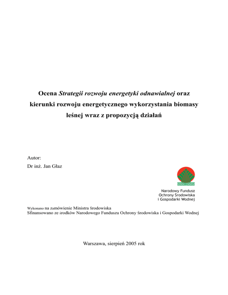 Ocena Strategii rozwoju energetyki odnawialnej oraz kierunki rozwoju energetycznego wykorzystania biomasy leśnej wraz z propozycją działań Autor: Dr inż. Jan Głaz Wykonano na zamówienie Ministra Środowiska Sfinansowano ze środków Narodowego Funduszu Ochrony Środowiska i Gospodarki Wodnej Warszawa, sierpień 2005 rok Spis treści: 1. Cel i metodyka pracy………………………………………………….…………. 2 2. Przegląd literatury……………………………………………………………… 7 3. Potencjalne i realne możliwości pozyskania drewna na cele energetyczne do 2010 roku…………………………………………………………………… 12 3.1. Dozwolony rozmiar (etat) pozyskania grubizny drewna w Lasach Państwowych ……………………………………………………… 12 3.2. Potencjalne i realne możliwości pozyskania drewna mało- i średniowymiarowego ………………………………………………… 25 Rozmiar pozyskania grubizny drewna w postaci tzw. odpadów zrębowych…. 3.3. 26 4. Potencjalne i realne możliwości pozyskania drewna mało- i średniowymiarowego w lasach pozostałych do 2010 roku ……………. 26 4.1. Uwarunkowania ……………………………………………………………… 26 4.2. Rozmiar pozyskania drewna mało- i średniowymiarowego w lasach pozostałych do 2010 roku ………………………………………………………………. 27 5. Zapotrzebowanie przemysłu drzewnego i papierniczego oraz innych odbiorców na drewno do 2010 roku ………………………………………………………… 28 6. Podaż drewna na cele energetyczne do 2010 roku ……………………………… 29 7. Szacunkowa podaż drewna na cele energetyczne do 2020 roku ……………….. 30 8. Propozycja korekty zapisów Strategii w zakresie produkcji energii z biomasy leśnej …………………………………………………………………………….. 31 9. Propozycja działań dla rozszerzenia produkcji energii z biomasy leśnej ………. 33 2 10. Podsumowanie ………………………………………………………………… 36 Literatura i źródła ………………………………………………………………… 38 Tabele 3 Jan Głaz Ocena Strategii rozwoju energetyki odnawialnej oraz kierunki rozwoju energetycznego wykorzystania biomasy leśnej wraz z propozycją działań 1. Cel i metodyka pracy A. Cel pracy Stan środowiska przyrodniczego ulega pogorszeniu w wyniku zanieczyszczeń pyłowych i gazowych powstałych w trakcie produkcji różnych wyrobów oraz z transportu, a zwłaszcza produkcji energii ze źródeł nieodnawialnych (w Polsce głównie z węgla). Dla poprawy tej sytuacji uruchomiono liczne procesy przeciwstawiające się temu stanowi i jego skutkom. Jest to m.in. idea trwałego i zrównoważonego rozwoju i wywodzący się z niej Protokół z Kioto, ochrona bioróżnorodności, Natura 2000 i paneuropejski proces ochrony lasów. Na ich podstawie sformułowano liczne zalecenia dla poszczególnych państw, które wspólnie z organizacjami międzynarodowymi przystąpiły do ich wdrażania. Jednym z działań jest zwiększenie udziału energii ze źródeł odnawialnych w ogólnej jej produkcji. Polska na mocy Traktatu o Przystąpieniu i Dyrektywy 2001/77/WE (30), początkowo jako kraj stowarzyszony a obecnie członek Unii Europejskiej, przystąpiła m.in. do realizacji tego programu. Opracowano w tym celu Strategię rozwoju energetyki odnawialnej, przyjętej przez Radę Ministrów w dniu 5 września 2000 r. i Sejm RP w dniu 23 sierpnia 2001 roku. Strategia ta nakreśliła program, który ma na celu uzyskanie w 2010 roku 7,5% udziału energii z odnawialnych źródeł w ogólnej jej produkcji, a w 2020 – 14%. Po przeanalizowaniu realnych i potencjalnych źródeł odnawialnych energii przyjęto, że głównym źródłem tego wzrostu będzie biomasa (produkty fotosyntezy), tj. drewno, słoma, torf. W strategii tej założono, że: • lesistość Polski w 2025 roku wyniesie 33%, • 2 – 2, 5 mln m3 drewna pozostaje w lesie ze względu na ograniczony popyt, • niewykorzystane drewno w postaci odpadów pozostaje w zakładach przemysłu drzewnego. Założenia tej strategii w odniesieniu do drewna wymagają zmian, bowiem od czasu jej opracowania znacznie wzrosło zapotrzebowanie na drewno przez różnych odbiorców a głównie przez przemysł drzewny. Pewnym zmianom uległy trendy wzrostu lesistości kraju. Nie wszystkie prognozowane wskaźniki zmiany zasobów drzewnych i możliwości ich użytkowania potwierdziły się. 4 Celem niniejszej pracy jest opracowanie informacji niezbędnych do oceny i aktualizacji Strategii rozwoju energetyki odnawialnej oraz określenia kierunków rozwoju energetycznego wykorzystania biomasy leśnej wraz z propozycją działań w tym zakresie. Podstawową informacją będzie prognoza podaży drewna na cele energetyczne do 2020 roku. B. Krótka charakterystyka lasów w Polsce Istnieje duże zapotrzebowanie na drewno, które jest produktem lasu, plantacji i zadrzewień. W przeważającej części drewno, jako surowiec do dalszego przerobu i produkcji wyrobów finalnych, jest pozyskiwane w lasach. W Polsce dominują lasy skarbu państwa, będące w zarządzie Państwowego Gospodarstwa Leśnego Lasy Państwowe (PGL LP). Zajmują one około 78% ogólnej powierzchni lasów w Polsce. Według stanu na 1.01.2004 r. zaewidencjonowano 8,94 ml ha lasów, w tym lasów PGL Lasy Państwowe - 7,0 ml ha, lasów prywatnych - 1,56 ml ha, w zarządzie parków narodowych -180 tys. ha, w Agencji Nieruchomości Rolnych - 66 tys. ha i lasów będących własnością gmin -78 tys. ha (tabela 1). Rozmieszczenie lasów ogółem i według kategorii własności jest nierównomierne (tab. 1). Lesistość waha się od 20,6% w woj. Łódzkim do 48,5% w woj. Lubuskim, a w drugim pod względem lesistości woj. Podkarpackim wynosi 