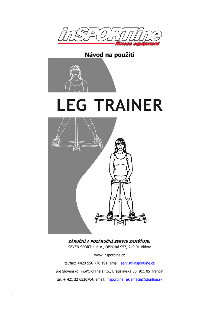 Návod na použití ZÁRUČNÍ A POZÁRUČNÍ SERVIS ZAJIŠŤUJE: SEVEN SPORT s. r. o., Dělnická 957, 749 01 Vítkov www.insportline.cz tel/fax: +420 556 770 191, email: [email protected] pre Slovensko: inSPORTline s.r.o., Bratislavská 36, 911 05 Trenčín tel: + 421 32 6526704, email: [email protected] 1 Děkujeme, že jste se rozhodli pro koupi našeho produktu. Ačkoliv vynakládáme velké úsilí k zajištění kvality každého našeho výrobku, ojediněle se mohou vyskytnout chybějící nebo vadné díly. V případě objevení jakýchkoliv závad na stroji či zaznamenáte-li chybějící části stroje, kontaktujte nás za účelem jeho nahrazení (viz kontakt na první straně návodu). Tento stroj je určen výhradně pro domácí použití. Záruku na stroj nelze poskytnout v případě jeho použití pro komerční, profesionální účely v posilovacích centrech. Základní informace: • • • • Tento stroj je určen pouze pro domácí použití. Stroj není určen pro komerční účely a vyšší výkonnostní zatížení. Nesprávné používání (jako např. nadměrné cvičení, prudké pohyby bez rozcvičení, špatné nastavení), mohou poškodit vaše zdraví. Před začátkem cvičení, konzultujte váš zdravotní stav – srdeční systém, krevní tlak, ortopedické problémy atd. se svým lékařem. Výrobce není zodpovědný za jakékoliv zranění, škodu nebo selhání způsobené použitím tohoto výrobku či špatným sestavením a údržbou stroje. Doporučuje provést sestavení stroje a údržbu odborným servisem. Informace získáte u firmy Seven sport s.r.o. viz údaje na první straně návodu. Bezpečnostní informace Abyste zamezili úrazu či poškození stroje dodržujte následující pravidla: • Maximální nosnost stroje je 100 kg. • Stroj je zařazen do třídy HC – závislé na rychlosti a není vhodný pro terapeutické cvičení. • Stroj se nesmí používat v nevětraných místnostech. • Vysoká teplota, vlhkost a voda nesmí přijít se strojem do styku. • Před použitím si důkladně přečtěte návod na použití. • Umístěte stroj na pevnou a rovnou plochu. Ujistěte se, že stojí pevně a bezpečně. • Nestavějte se na řidítka. • Nechejte kolem stroje volnou plochu minimálně 1 metr na všechny strany. • Dodržujte minimální zasunutí sedlové tyče, která je specifikována v návodu. • Nesprávné nebo nadměrné cvičení může vážně poškodit vaše zdraví. • Ujistěte se, že páčky a další nastavovací mechanismy nejsou v cestě při cvičení. • Pravidelně kontrolujte všechny části. Pokud jsou poškozeny, stroj nepoužívejte a ihned poškozené části vyměňte nebo kontaktujte servis dodavatele (viz přední strana návodu) • Pravidelně kontrolujte všechny šrouby a matice, zda jsou pořádně dotaženy. • Nenechávejte děti a domácí zvířata bez dozoru na stroji či v blízkosti. • Tento stroj není hračka. • Uschovejte tento návod na použití pro případné objednání náhradních dílů v budoucnu. Důležité informace • 1 Sestrojte přístroj přesně podle návodu a ujistěte se,že používáte výhradně přiložené součástky navrženy pro tento přístroj. Před montáží zkontrolujte podle rozpisu částí, jestli máte všechny potřebné součástky. • Uchovávejte stroj v suchém místě s rovným podkladem a chraňte ho před vlhkostí. Pokud chcete zabránit znečištění, otlačení stroje atd., je doporučeno podložit ho vhodnou, neklouzavou podložkou. • Začnete-li pociťovat závrať, nevolnost, bolest na hrudníku nebo jiné abnormální příznaky, přestaňte okamžitě s cvičením. Případně to zkonzultujte se svým lékařem. Děti nebo hendikepovaní lidé by měli používat přístroj pouze v přítomnosti další osoby, která může pomoci a poradit. Během cvičení dávejte pozor, aby vaše tělo nepřišlo do styku s pohybujícími se části stroje. Při nastavování nastavitelných částí se ujistěte, že jsou nastaveny správně a ukazují označenou, maximální nastavitelnou pozici, např. posuvného sedáku. Necvičte po jídle. • • • • - Začínejte cvičit pozvolna. I když jste zkušený sportovec, začněte s cvičením pro začátečníky a postupně můžete přidávat. Vždy se držte rukojeti, když nastupujete a vystupujte ze stroje. Může dojít ke zranění, pokud se nebudete držet. Pro maximální efektivitu a bezpečnost si přečtěte následující instrukce. Upozornění: Před použitím stroje si přečtěte následující instrukce, abyste zamezili možnosti zranění či smrti. Vždy držte děti dál od stroje. Maximální nosnost stroje je 100 kg. Stroj je zařazen do třídy HC. Specifikace: Hmotnost: 9,98 kg, maximální nosnost: 100 kg, Délka:45,72cm, Šířka: 107 cm, Výška: 97,47 cm 1 Části: 1. Rukojeť 2. Seřizovací šroub 3. Přední koncová krytka 4. Pedál 5. Levá kolejnice 6. Kolejnicová koncová krytka 7. Levý konec kolejnice 8. Kolejnicová koncová krytka 9. Zadní koncová krytka 10. Zadní tyč 11. Kolejnicová koncová krytka 12. Pravý konec kolejnice 13. Kolejnicová koncová krytka 14. Pravá kolejnice 1 15. Zamykací šroub 16. Skládací tyč Složení stroje: Některé části stroje jsou již předmazány z výroby. Doporučujeme tedy chránit podlahu či jiné části před skvrnami, pomocí novin či hadry. Potřebné nářadí je součástí balení – T šroubovák Krok 1 Připevnění zadních koncové krytky a) Umístěte hlavní část na levé a pravé kryty kolejnice pomalu tak jak je ukázáno na obrázku. Nasuňte krytku na zadní tyč s dotažením šroubu na krytce a boku zadní tyče. Šroub dotáhněte pomocí přiloženého šroubováku. 1 Krok2 Připevnění předních koncových krytek na podpěrnou tyč a) Položte hlavní část na podlahu a ujistěte se, že zadní krytka je již připevněna a je pr