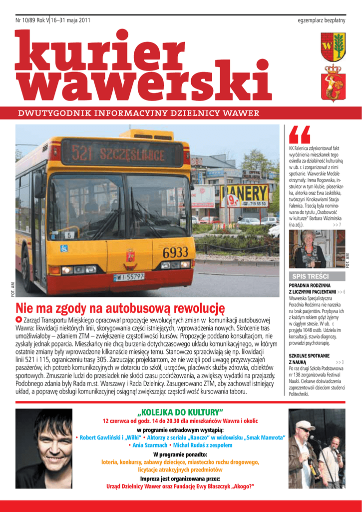Nr 10/89 Rok V 16–31 maja 2011 egzemplarz bezpłatny fot. AM KK Falenica zdyskontował fakt wyróżnienia mieszkanek tego osiedla za działalność kulturalną w ub. r. i zorganizował z nimi spotkanie. Wawerskie Medale otrzymały: Irena Rogowska, instruktor w tym klubie, piosenkarka, aktorka oraz Ewa Jaskólska, twórczyni Kinokawiarni Stacja Falenica. Trzecią była nominowana do tytułu „Osobowość w kulturze” Barbara Wizimirska >> 7 (na zdj.). fot. am Spis treści Nie ma zgody na autobusową rewolucję Zarząd Transportu Miejskiego opracował propozycje rewolucyjnych zmian w komunikacji autobusowej Wawra: likwidacji niektórych linii, skorygowania części istniejących, wprowadzenia nowych. Skrócenie tras umożliwiałoby – zdaniem ZTM – zwiększenie częstotliwości kursów. Propozycje poddano konsultacjom, nie zyskały jednak poparcia. Mieszkańcy nie chcą burzenia dotychczasowego układu komunikacyjnego, w którym ostatnie zmiany były wprowadzone kilkanaście miesięcy temu. Stanowczo sprzeciwiają się np. likwidacji linii 521 i 115, ograniczeniu trasy 305. Zarzucając projektantom, że nie wzięli pod uwagę przyzwyczajeń pasażerów, ich potrzeb komunikacyjnych w dotarciu do szkół, urzędów, placówek służby zdrowia, obiektów sportowych. Zmuszanie ludzi do przesiadek nie skróci czasu podróżowania, a zwiększy wydatki na przejazdy. Podobnego zdania były Rada m.st. Warszawy i Rada Dzielnicy. Zasugerowano ZTM, aby zachował istniejący układ, a poprawę obsługi komunikacyjnej osiągnął zwiększając częstotliwość kursowania taboru. „Kolejka do kultury” 12 czerwca od godz. 14 do 20.30 dla mieszkańców Wawra i okolic w programie estradowym wystąpią: • Robert Gawliński i „Wilki” • Aktorzy z serialu „Ranczo” w widowisku „Smak Mamrota” • Ania Szarmach • Michał Rudaś z zespołem W programie ponadto: loteria, konkursy, zabawy dziecięce, miasteczko ruchu drogowego, licytacje atrakcyjnych przedmiotów Impreza jest organizowana przez: Urząd Dzielnicy Wawer oraz Fundację Ewy Błaszczyk „Akogo?” Poradnia Rodzinna z licznymi pacjentami >> 6 Wawerska Specjalistyczna Poradnia Rodzinna nie narzeka na brak pacjentów. Przybywa ich z każdym rokiem gdyż żyjemy w ciągłym stresie. W ub. r. przyjęła 1048 osób. Udziela im konsultacji, stawia diagnozy, prowadzi psychoterapię. Szkolne spotkanie >> 3 z nauką Po raz drugi Szkoła Podstawowa nr 138 zorganizowała Festiwal Nauki. Ciekawe doświadczenia zaprezentowali dzieciom studenci Politechniki. 2 OD MARYSINA PO FALENICĘ Kurier ekologiczny Azbestu spis z natury Prezydent m.st. Warszawy informuje, że do 30 maja 2011 r. prowadzona jest inwentaryzacja wyrobów zawierających azbest wraz z oceną ich stanu technicznego. Spis z natury obejmuje pokrycia dachowe obiektów budowlanych, wykonane z płyt azbestowo-cementowych falistych i płaskich, tzw. „eternit”, na terenie Bemowa, Bielan, Mokotowa, Ochoty, Śródmieścia, Ursusa, Ursynowa, Włoch, Woli, Żoliborza i Wawra. Mieszkańcy wymienionych dzielnic, użytkownicy wyrobów zawierających azbest proszeni są o udzielenie pomocy wykonawcom inwentaryzacji, tj. umożliwienie dokonania stosownych pomiarów i oględzin na terenie nieruchomości. Prowadzona akcja ma na celu ustalenie ilości i stanu technicznego użytkowanych wyrobów zawierających azbest. Jest pierwszym etapem wieloletniego programu, którego zadaniem będzie sukcesywne usunięcie wszystkich wyrobów azbestowych z budynków znajdujących się na terenie m.st. Warszawy do 2032 roku. Inwentaryzację przeprowadza firma WGS84 Polska Sp. z o.o. W dzielnicy Wawer trwa ona do 30 maja 2011 r. Osoby wykonujące spis będą posiadają imienne upoważnienia, z numerem dowodu osobistego, do reprezentowania m.st. Warszawy przy wykonywaniu czynności, podpisane przez dyrektora Biura Ochrony Środowiska Urzędu m.st. Warszawy – panią Grażynę Sienkiewicz. Wyroby zawierające azbest, będące w złym stanie technicznym, mogą negatywnie wpływać na zdrowie mieszkańców (wdychanie włókien azbestowych zawieszonych w powietrzu może mieć działanie chorobotwórcze) i dlatego podlegają sukcesywnej eliminacji ze środowiska. Usuwanie wyrobów azbestowych powinno odbywać się przy zachowaniu szczególnych środków ostrożności, przez wyspecjalizowane i uprawnione firmy (posiadające decyzję administracyjną zezwalającą na wytwarzanie odpadów niebezpiecznych zawierających azbest, powstających podczas prowadzenia prac remontowo-budowlanych). Wydaje Urząd m.st. Warszawy dla dzielnicy Wawer Adres redakcji: 04-713 Warszawa, ul. Żegańska 1, V piętro, pok. 505 Redaktor naczelny: Andrzej Murat tel. (22) 443 68 18, 501 671 005 e-mail: [email protected] Skład i druk: www.pracowniacc.pl Nakład: 7 tys. egz. ISSN 1898-4398 Redakcja nie zwraca materiałów niezamówionych, zastrzega sobie prawo do dokonywania skrótów i redagowania. Kurier komunikacyjny | Konsultacje propozycji zmian autobusowycH Poprawiajcie nie psując Poprawiajcie obsługę komunikacyjną Wawra, ale nie psujcie tego, co zostało wprowadzone wcześniej, i co sprawdziło się w praktyce – takie jest zdanie mieszkańców i reprezentujących ich radnych dzielnicy, przedstawione podczas społecznych konsultacji. Oznacza to, że wawerczycy nie dali się nabrać na złudne – ich zdaniem – obietnice, że co prawda trasy niektórych linii będą krótsze, ale za to wzrośnie częstotliwość kursów. Zarząd Transportu Miejskiego do 19 maja dał czas mieszkańcom na wyrażenie swoich opinii w sprawie zaproponowanych przez niego zmian komunikacyjnych na terenie m.in. Wawra. Przedstawione propozycje nie przypadły – delikatnie mówiąc – do gustu mieszkańcom. Obradująca 12 maja Rada m.st. Warszawy wyraziła sprzeciw wobec zamiaru zlikwidowania linii autobusowych 521 oraz 115. Tego samego dnia Rada Dzielnicy przyjęła stanowisko podobne, nie zamykając jednak dyskusji na temat pozostałych linii. 13 ma