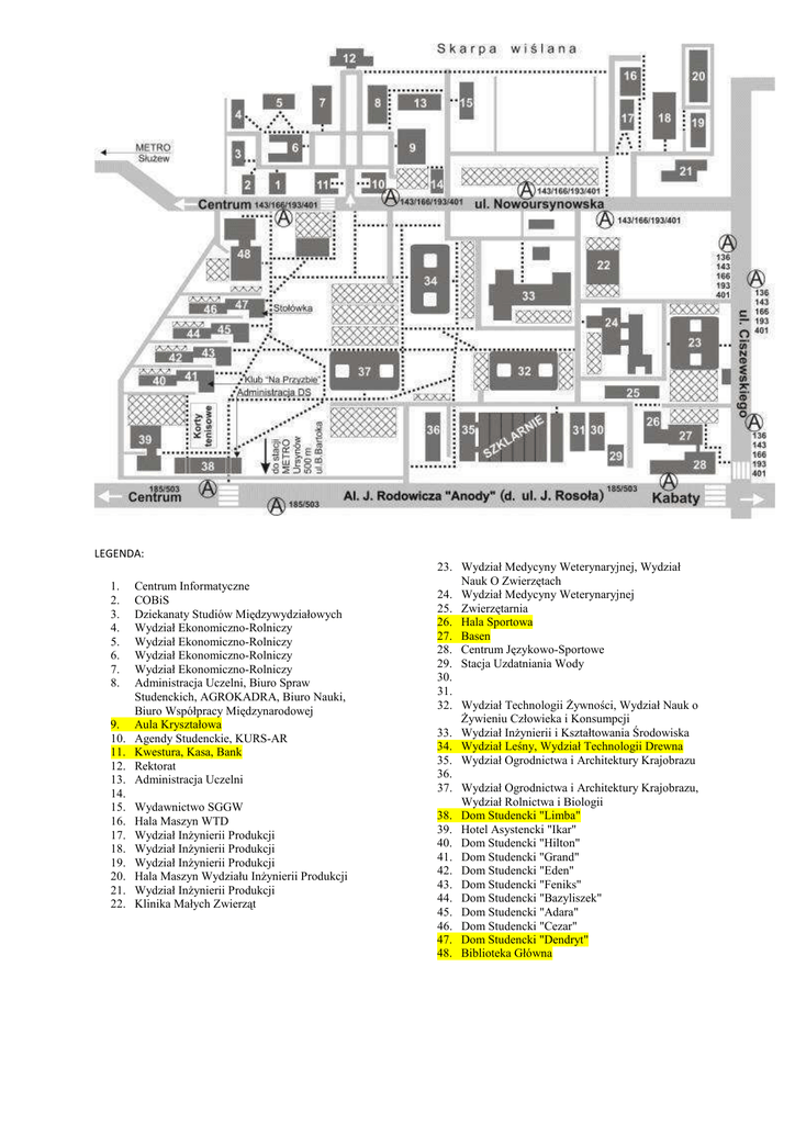 LEGENDA: 1. 2. 3. 4. 5. 6. 7. 8. 9. 10. 11. 12. 13. 14. 15. 16. 17. 18. 19. 20. 21. 22. Centrum Informatyczne COBiS Dziekanaty Studiów Międzywydziałowych Wydział Ekonomiczno-Rolniczy Wydział Ekonomiczno-Rolniczy Wydział Ekonomiczno-Rolniczy Wydział Ekonomiczno-Rolniczy Administracja Uczelni, Biuro Spraw Studenckich, AGROKADRA, Biuro Nauki, Biuro Współpracy Międzynarodowej Aula Kryształowa Agendy Studenckie, KURS-AR Kwestura, Kasa, Bank Rektorat Administracja Uczelni Wydawnictwo SGGW Hala Maszyn WTD Wydział InŜynierii Produkcji Wydział InŜynierii Produkcji Wydział InŜynierii Produkcji Hala Maszyn Wydziału InŜynierii Produkcji Wydział InŜynierii Produkcji Klinika Małych Zwierząt 23. Wydział Medycyny Weterynaryjnej, Wydział Nauk O Zwierzętach 24. Wydział Medycyny Weterynaryjnej 25. Zwierzętarnia 26. Hala Sportowa 27. Basen 28. Centrum Językowo-Sportowe 29. Stacja Uzdatniania Wody 30. 31. 32. Wydział Technologii śywności, Wydział Nauk o śywieniu Człowieka i Konsumpcji 33. Wydział InŜynierii i Kształtowania Środowiska 34. Wydział Leśny, Wydział Technologii Drewna 35. Wydział Ogrodnictwa i Architektury Krajobrazu 36. 37. Wydział Ogrodnictwa i Architektury Krajobrazu, Wydział Rolnictwa i Biologii 38. Dom Studencki "Limba" 39. Hotel Asystencki "Ikar" 40. Dom Studencki "Hilton" 41. Dom Studencki "Grand" 42. Dom Studencki "Eden" 43. Dom Studencki "Feniks" 44. Dom Studencki "Bazyliszek" 45. Dom Studencki "Adara" 46. Dom Studencki "Cezar" 47. Dom Studencki "Dendryt" 48. Biblioteka Główna
