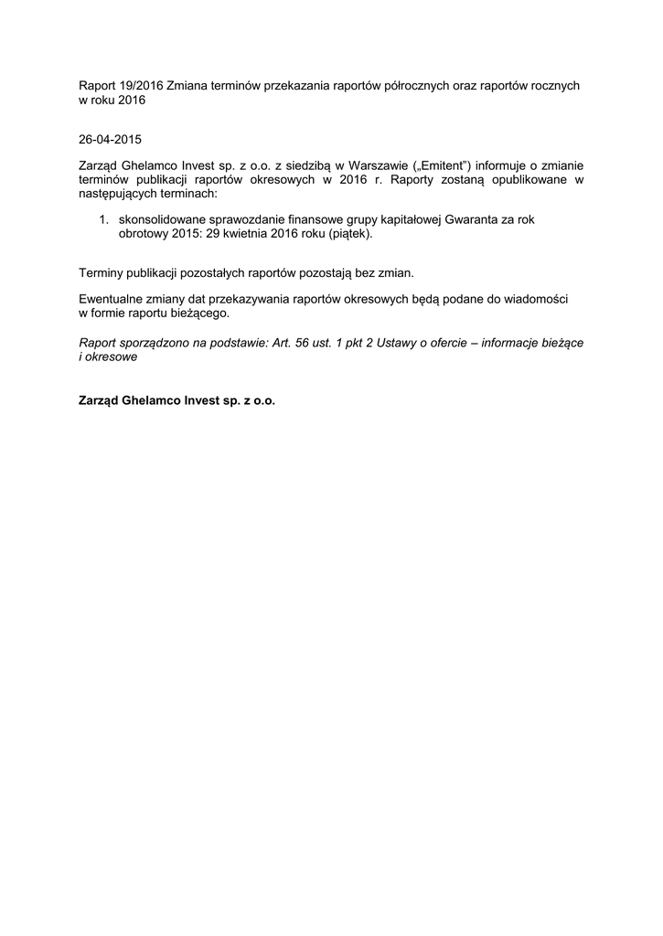 Raport 19/2016 Zmiana terminów przekazania raportów półrocznych oraz raportów rocznych w roku 2016 26-04-2015 Zarząd Ghelamco Invest sp. z o.o. z siedzibą w Warszawie („Emitent”) informuje o zmianie terminów publikacji raportów okresowych w 2016 r. Raporty zostaną opublikowane w następujących terminach: 1. skonsolidowane sprawozdanie finansowe grupy kapitałowej Gwaranta za rok obrotowy 2015: 29 kwietnia 2016 roku (piątek). Terminy publikacji pozostałych raportów pozostają bez zmian. Ewentualne zmiany dat przekazywania raportów okresowych będą podane do wiadomości w formie raportu bieżącego. Raport sporządzono na podstawie: Art. 56 ust. 1 pkt 2 Ustawy o ofercie – informacje bieżące i okresowe Zarząd Ghelamco Invest sp. z o.o.