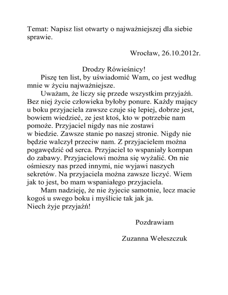 Temat: Napisz list otwarty o najważniejszej dla siebie sprawie. Wrocław, 26.10.2012r. Drodzy Rówieśnicy! Piszę ten list, by uświadomić Wam, co jest według mnie w życiu najważniejsze. Uważam, że liczy się przede wszystkim przyjaźń. Bez niej życie człowieka byłoby ponure. Każdy mający u boku przyjaciela zawsze czuje się lepiej, dobrze jest, bowiem wiedzieć, ze jest ktoś, kto w potrzebie nam pomoże. Przyjaciel nigdy nas nie zostawi w biedzie. Zawsze stanie po naszej stronie. Nigdy nie będzie walczył przeciw nam. Z przyjacielem można pogawędzić od serca. Przyjaciel to wspaniały kompan do zabawy. Przyjacielowi można się wyżalić. On nie ośmieszy nas przed innymi, nie wyjawi naszych sekretów. Na przyjaciela można zawsze liczyć. Wiem jak to jest, bo mam wspaniałego przyjaciela. Mam nadzieję, że nie żyjecie samotnie, lecz macie kogoś u swego boku i myślicie tak jak ja. Niech żyje przyjaźń! Pozdrawiam Zuzanna Wełeszczuk
