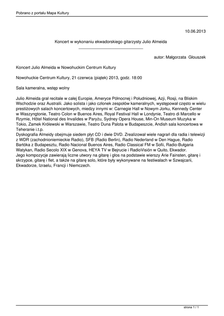 Pobrano z portalu Mapa Kultury 10.06.2013 Koncert w wykonaniu ekwadorskiego gitarzysty Julio Almeida ____________________________ autor: Małgorzata Głouszek Koncert Julio Almeida w Nowohuckim Centrum Kultury Nowohuckie Centrum Kultury, 21 czerwca (piątek) 2013, godz. 18:00 Sala kameralna, wstęp wolny Julio Almeida grał recitale w całej Europie, Ameryce Północnej i Południowej, Azji, Rosji, na Bliskim Wschodzie oraz Australii. Jako solista i jako członek zespołów kameralnych, występował często w wielu prestiżowych salach koncertowych, miedzy innymi w: Carnegie Hall w Nowym Jorku, Kennedy Center w Waszyngtonie, Teatro Colon w Buenos Aires, Royal Festival Hall w Londynie, Teatro di Marcello w Rzymie, Hôtel National des Invalides w Paryżu, Sydney Opera House, Min-On Museum Muzyka w Tokio, Zamek Królewski w Warszawie, Teatro Duna Palota w Budapeszcie, Andish sala koncertowa w Teheranie i.t.p. Dyskografia Almeidy obejmuje siedem płyt CD i dwie DVD. Zrealizował wiele nagrań dla radia i telewizji z WDR (zachodnioniemieckie Radio), SFB (Radio Berlin), Radio Nederland w Den Hague, Radio Bartóka z Budapesztu, Radio Nacional Buenos Aires, Radio Classical FM w Sofii, Radio-Bułgaria Watykan, Radio Secolo XIX w Genova, HEYA TV w Bejrucie i RadioVisión w Quito, Ekwador. Jego kompozycje zawierają liczne utwory na gitarę i głos na podstawie wierszy Arie Fainsten, gitarę i skrzypce, gitarę i flet, a także na gitarę solo, które były wykonywane na festiwalach w Szwajcarii, Ekwadorze, Izraelu, Francji i Niemczech. strona 1 / 1