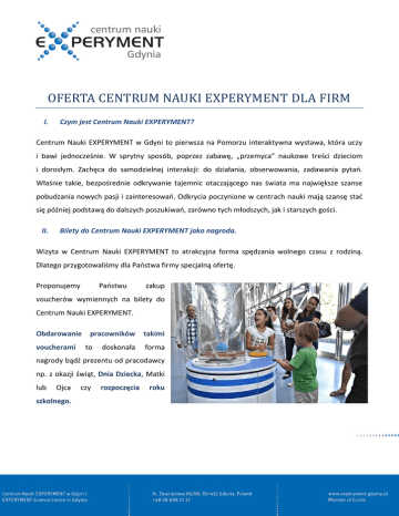 OFERTA CENTRUM NAUKI EXPERYMENT DLA FIRM I. Czym jest Centrum Nauki EXPERYMENT? Centrum Nauki EXPERYMENT w Gdyni to pierwsza na Pomorzu interaktywna wystawa, która uczy i bawi jednocześnie. W sprytny sposób, poprzez zabawę, „przemyca” naukowe treści dzieciom i dorosłym. Zachęca do samodzielnej interakcji: do działania, obserwowania, zadawania pytań. Właśnie takie, bezpośrednie odkrywanie tajemnic otaczającego nas świata ma największe szanse pobudzania nowych pasji i zainteresowań. Odkrycia poczynione w centrach nauki mają szansę stać się później podstawą do dalszych poszukiwań, zarówno tych młodszych, jak i starszych gości. II. Bilety do Centrum Nauki EXPERYMENT jako nagroda. Wizyta w Centrum Nauki EXPERYMENT to atrakcyjna forma spędzania wolnego czasu z rodziną. Dlatego przygotowaliśmy dla Państwa firmy specjalną ofertę. Proponujemy Państwu zakup voucherów wymiennych na bilety do Centrum Nauki EXPERYMENT. Obdarowanie voucherami pracowników to doskonała takimi forma nagrody bądź prezentu od pracodawcy np. z okazji świąt, Dnia Dziecka, Matki lub Ojca szkolnego. czy rozpoczęcia roku III. Informacje praktyczne. RODZAJ BILETU CENA BILET NORMALNY 20 ZŁ BILET ULGOWY * 12 ZŁ Cena: *ulga przysługuje dzieciom powyżej 2 lat, młodzieży uczącej się do 26 roku życia za okazaniem ważnej legitymacji, seniorom 70+; dzieci do 2 roku życia – wstęp bezpłatny Ilość zakupionych biletów jest dowolna Okres ważności biletów – 1 rok od daty zakupu IV. Forma współpracy. Współpraca nawiązywana jest na podstawie zawartej umowy o zakupie voucherów z Centrum Nauki EXPERYMENT. Jeśli są Państwo zainteresowani skorzystaniem z naszej oferty, serdecznie zapraszamy do kontaktu w celu omówienia warunków umowy: nr telefonu: 58 698 21 47 adres e-mail: [email protected] www.experyment.gdynia.pl