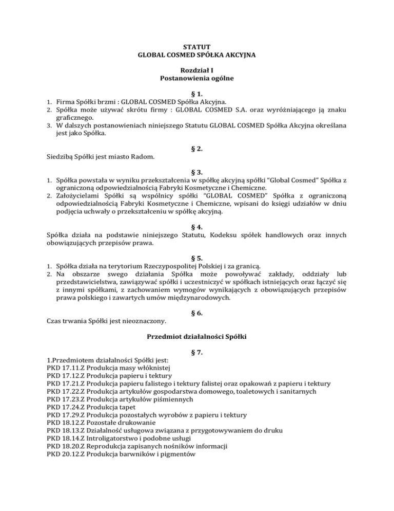 STATUT GLOBAL COSMED SPÓŁKA AKCYJNA Rozdział I Postanowienia ogólne § 1. 1. Firma Spółki brzmi : GLOBAL COSMED Spółka Akcyjna. 2. Spółka może używać skrótu firmy : GLOBAL COSMED S.A. oraz wyróżniającego ją znaku graficznego. 3. W dalszych postanowieniach niniejszego Statutu GLOBAL COSMED Spółka Akcyjna określana jest jako Spółka. Siedzibą Spółki jest miasto Radom. § 2. § 3. 1. Spółka powstała w wyniku przekształcenia w spółkę akcyjną spółki “Global Cosmed” Spółka z ograniczoną odpowiedzialnością Fabryki Kosmetyczne i Chemiczne. 2. Założycielami Spółki są wspólnicy spółki “GLOBAL COSMED” Spółka z ograniczoną odpowiedzialnością Fabryki Kosmetyczne i Chemiczne, wpisani do księgi udziałów w dniu podjęcia uchwały o przekształceniu w spółkę akcyjną. § 4. Spółka działa na podstawie niniejszego Statutu, Kodeksu spółek handlowych oraz innych obowiązujących przepisów prawa. § 5. 1. Spółka działa na terytorium Rzeczypospolitej Polskiej i za granicą. 2. Na obszarze swego działania Spółka może powoływać zakłady, oddziały lub przedstawicielstwa, zawiązywać spółki i uczestniczyć w spółkach istniejących oraz łączyć się z innymi spółkami, z zachowaniem wymogów wynikających z obowiązujących przepisów prawa polskiego i zawartych umów międzynarodowych. § 6. Czas trwania Spółki jest nieoznaczony. Przedmiot działalności Spółki § 7. 1.Przedmiotem działalności Spółki jest: PKD 17.11.Z Produkcja masy włóknistej PKD 17.12.Z Produkcja papieru i tektury PKD 17.21.Z Produkcja papieru falistego i tektury falistej oraz opakowań z papieru i tektury PKD 17.22.Z Produkcja artykułów gospodarstwa domowego, toaletowych i sanitarnych PKD 17.23.Z Produkcja artykułów piśmiennych PKD 17.24.Z Produkcja tapet PKD 17.29.Z Produkcja pozostałych wyrobów z papieru i tektury PKD 18.12.Z Pozostałe drukowanie PKD 18.13.Z Działalność usługowa związana z przygotowywaniem do druku PKD 18.14.Z Introligatorstwo i podobne usługi PKD 18.20.Z Reprodukcja zapisanych nośników informacji PKD 20.12.Z Produkcja barwników i pigmentów PKD 20.13.Z Produkcja pozostałych podstawowych chemikaliów nieorganicznych PKD 20.14.Z Produkcja pozostałych podstawowych chemikaliów organicznych PKD 20.16.Z Produkcja tworzyw sztucznych w formach podstawowych PKD 20.30.Z Produkcja farb, lakierów i podobnych powłok, farb drukarskich i mas uszczelniających PKD 20.41.Z Produkcja mydła i detergentów, środków myjących i czyszczących PKD 20.42.Z Produkcja wyrobów kosmetycznych i toaletowych PKD 20.53.Z Produkcja olejków eterycznych PKD 20.59.Z Produkcja pozostałych wyrobów chemicznych, gdzie indziej niesklasyfikowana PKD 22.22.Z Produkcja opakowań z tworzyw sztucznych PKD 25.11.Z Produkcja konstrukcji metalowych i ich części PKD 25.12.Z Produkcja metalowych elementów stolarki budowlanej PKD 25.61.Z Obróbka metali i nakładanie powłok na metale PKD 25.73.Z Produkcja narzędzi PKD 25.91.Z Produkcja pojemników metalowych PKD 25.92.Z Produkcja opakowań z metali PKD 27.51.Z Produkcja elektrycznego sprzętu gospodarstwa domowego PKD 27.52.Z Produkcja nieelektrycznego sprzętu gospodarstwa domowego PKD 28.23.Z Produkcja maszyn i sprzętu biurowego, z wyłączeniem komputerów i urządzeń peryferyjnych PKD 33.12.Z Naprawa i konserwacja maszyn PKD 33.14.Z Naprawa i konserwacja urządzeń elektrycznych PKD 33.17.Z Naprawa i konserwacja pozostałego sprzętu transportowego PKD 33.19.Z Naprawa i konserwacja pozostałego sprzętu i wyposażenia PKD 43.11.Z Rozbiórka i burzenie obiektów budowlanych PKD 43.12.Z Przygotowanie terenu pod budowę PKD 45.20.Z Konserwacja i naprawa pojazdów samochodowych, z wyłączeniem motocykli PKD 43.29.Z Wykonywanie pozostałych instalacji budowlanych PKD 43.31.Z Tynkowanie PKD 43.32.Z Zakładanie stolarki budowlanej PKD 43.33.Z Posadzkarstwo; tapetowanie i oblicowywanie ścian PKD 43.34.Z Malowanie i szklenie PKD 43.39.Z Wykonywanie robót budowlanych wykończeniowych PKD 43.91.Z Wykonywanie konstrukcji i pokryć dachowych PKD 43.99.Z Pozostałe specjalistyczne roboty budowlane, gdzie indziej niesklasyfikowane PKD 46.41.Z Sprzedaż hurtowa wyrobów tekstylnych PKD 46.42.Z Sprzedaż hurtowa odzieży i obuwia PKD 46.44.Z Sprzedaż hurtowa wyrobów porcelanowych, ceramicznych i szklanych oraz środków czyszczących PKD 46.45.Z Sprzedaż hurtowa perfum i kosmetyków PKD 46.47.Z Sprzedaż hurtowa mebli, dywanów i sprzętu oświetleniowego PKD 46.49.Z Sprzedaż hurtowa pozostałych artykułów użytku domowego PKD 46.65.Z Sprzedaż hurtowa mebli biurowych PKD 46.66.Z Sprzedaż hurtowa pozostałych maszyn i urządzeń biurowych PKD 46.69.Z Sprzedaż hurtowa pozostałych maszyn i urządzeń PKD 46.73.Z Sprzedaż hurtowa drewna, materiałów budowlanych i wyposażenia sanitarnego PKD 46.75.Z Sprzedaż hurtowa wyrobów chemicznych PKD 46.90.Z Sprzedaż hurtowa niewyspecjalizowana PKD 47.19.Z Pozostała sprzedaż detaliczna prowadzona w niewyspecjalizowanych sklepach PKD 47.99.Z Pozostała sprzedaż detaliczna prowadzona poza siecią sklepową, straganami i targowiskami PKD 52.10.B Magazynowanie i przechowywanie pozostałych towarów PKD 52.24.C Przeładunek towarów w pozostałych punkach przeładunkowych PKD 66.19.Z Pozostała działalność wspomagająca usługi finansowe, z wyłączeniem ubezpieczeń i funduszów emerytalnych PKD 68.10.Z Kupno i sprzedaż nieruchomości na własny rachunek PKD 68.20.Z Wynajem i zarządzanie nieruchomościami własnymi lub dzierżawionymi PKD 69.20.Z Działalność rachunkowo-księgowa; doradztwo podatkowe PKD 70.10.Z Działalność firm centralnych (head offices) i holdingów, z wyłączeniem holdingów finansowych PKD 70.21.Z Stosunki międzyludzkie (public relations) i komunikacja PKD 70.22.Z Pozostałe doradztwo w zakresie prowadzenia działalności gospodarczej i zarządzania PKD 73.11.Z Działalność agencji reklamowych PKD 73.20.Z Badanie rynk