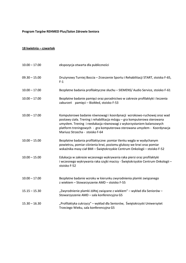 Program Targów REHMED Plus/Salon Zdrowie Seniora 18 kwietnia – czwartek 10.00 – 17.00 ekspozycja otwarta dla publiczności 09.30 – 15.00 Drużynowy Turniej Boccia – Zrzeszenie Sportu i Rehabilitacji START, stoiska F-65, F-1 10.00 – 17.00 Bezpłatne badania profilaktyczne słuchu – SIEMENS/ Audio Service, stoisko F-61 10.00 – 17.00 Bezpłatne badanie pamięci oraz poradnictwo w zakresie profilaktyki i leczenia zaburzeń pamięci – BioMed, stoisko F-53 10.00 – 17.00 Komputerowe badanie równowagi i koordynacji wzrokowo-ruchowej oraz wad postawy ciała. Trening i rehabilitacja mózgu – gra komputerowa sterowana umysłem. Trening i reedukacja równowagi z wykorzystaniem balansowych platform treningowych - gra komputerowa sterowana umysłem - Koordynacja Mariusz Strzecha - stoisko F-64 10.00 – 15.00 Bezpłatne badania profilaktyczne: pomiar tlenku węgla w wydychanym powietrzu, pomiar ciśnienia krwi, poziomu glukozy we krwi oraz pomiar wskaźnika masy ciał BMI – Świętokrzyskie Centrum Onkologii – stoisko F-52 10.00 – 15.00 Edukacja w zakresie wczesnego wykrywania raka piersi oraz profilaktyki i wczesnego wykrywania raka szyjki macicy - Świętokrzyskie Centrum Onkologii – stoisko F-52 10.00 – 17.00 Bezpłatne badanie wzroku w kierunku zwyrodnienia plamki związanego z wiekiem – Stowarzyszenie AMD – stoisko F-55 15.15 – 15.30 „Zwyrodnienie plamki żółtej związane z wiekiem” – wykład dla Seniorów – Stowarzyszenie AMD – sala konferencyjna G5 15.30 – 16.30 „Profilaktyka cukrzycy” – wykład dla Seniorów, Świętokrzyski Uniwersytet Trzeciego Wieku, sala konferencyjna G5 19 kwietnia – piątek 10.00 – 17.00 ekspozycja otwarta dla publiczności 08.00 – 09.00 Rejestracja uczestników Konferencji „Pomóżmy lepiej żyć” 09.00 – 09.30 Otwarcie Konferencji „Pomóżmy lepiej żyć” – sala konferencyjna G4 09.30 – 11.30 Konferencja „Pomóżmy lepiej żyć” – Sesja I, Kliniczne , diagnostyczne i terapeutyczne aspekty leczenia spastyczności – sala konferencyjna G4 12.00 – 14.00 Elektrostymulacja w spastyczności- metodyka miejsca ułożenia elektrod, dobór parametrów i rodzaju zabiegów – Warsztat I Zaopatrzenie ortotyczne w mózgowym porażeniu dziecięcym- pacjent z diplegią spastyczną (analiza przypadku) – Warsztat II 13.00 – 14.55 Konferencja „Pomóżmy lepiej żyć” – Sesja II: Małoinwazyjne metody leczenia schorzeń kręgosłupa i biodra – ArtMedik Kielce – sala konferencyjna G4 15.00 – 17.45 Konferencja „Pomóżmy lepiej żyć” – SESJA III: Potencjał diagnostyczny, terapeutyczny, profilaktyczny Metody McKenziego w leczeniu zespołów bólowych kręgosłupa i kończyn – Instytut McKenziego Polska – sala konferencyjna G4 10.30 – 17.15 Konferencja „Fizykoterapia w praktyce” – Wydawnictwo ELAMED, sala konferencyjna G1, G3 10.00 – 17.00 Bezpłatne badania profilaktyczne słuchu – SIEMENS/ Audio Service, stoisko F-61 10.00 – 17.00 Bezpłatne badanie pamięci oraz poradnictwo w zakresie profilaktyki i leczenia zaburzeń pamięci – BioMed, stoisko F-53 10.00 – 17.00 Komputerowe badanie równowagi i koordynacji wzrokowo-ruchowej oraz wad postawy ciała. Trening i rehabilitacja mózgu – gra komputerowa sterowana umysłem. Trening i reedukacja równowagi z wykorzystaniem balansowych platform treningowych - gra komputerowa sterowana umysłem - Koordynacja Mariusz Strzecha - stoisko F-64 10.00 – 15.00 Bezpłatne badania profilaktyczne: pomiar tlenku węgla w wydychanym powietrzu, pomiar ciśnienia krwi, poziomu glukozy we krwi oraz pomiar wskaźnika masy ciał BMI – Świętokrzyskie Centrum Onkologii – stoisko F-52 10.00 – 15.00 Edukacja w zakresie wczesnego wykrywania raka piersi oraz profilaktyki i wczesnego wykrywania raka szyjki macicy - Świętokrzyskie Centrum Onkologii – stoisko F-52 10.00 – 17.00 Bezpłatne badanie wzroku w kierunku zwyrodnienia plamki związanego z wiekiem – Stowarzyszenie AMD – stoisko F-55 15.15 – 15.30 „Zwyrodnienie plamki żółtej związane z wiekiem” – wykład dla Seniorów – Stowarzyszenie AMD – sala konferencyjna G5 15.30 – 15.45 „Czym się kierować przy wyborze suplementacji wspierającej wzrok?” – wykład dla Seniorów - Łukasz Petrykowski – Bausch & Lomb Polska, sala konferencyjna G5 09.00 – 12.00 Turniej Boccia dla klubów Seniora - Zrzeszenie Sportu i Rehabilitacji START, stoisko F-65 12.30 – 13.30 Pokazy walk szermierczych z udziałem uczestników Igrzysk Paraolimpijskich Londyn 2012 - Zrzeszenie Sportu i Rehabilitacji START – stoisko F-16 11.00 – 13.00 Dystansowe biegi uliczne - Zrzeszenie Sportu i Rehabilitacji START, tereny Targów Kielce 20 kwietnia – sobota 09.00 – 18.00 XI Spotkanie Terapeutów Certyfikowanych i Dyplomowanych Instytutu McKenziego Polska, sala konferencyjna G4 09.30 – 15.30 Turniej szachowy Activ P15’ „Wiosna 2013” - Zrzeszenie Sportu i Rehabilitacji START, stoisko F-17 10.00 – 15.00 ekspozycja otwarta dla publiczności 10.00 – 15.00 Bezpłatne badania profilaktyczne słuchu – SIEMENS/ Audio Service, stoisko F-61 10.00 – 15.00 Bezpłatne badanie pamięci oraz poradnictwo w zakresie profilaktyki i leczenia zaburzeń pamięci – BioMed, stoisko F-53 10.00 – 15.00 Komputerowe badanie równowagi i koordynacji wzrokowo-ruchowej oraz wad postawy ciała. Trening i rehabilitacja mózgu – gra komputerowa sterowana umysłem. Trening i reedukacja równowagi z wykorzystaniem balansowych platform treningowych - gra komputerowa sterowana umysłem - Koordynacja Mariusz Strzecha - stoisko F-64 10.00 – 15.00 Bezpłatne badania profilaktyczne: pomiar tlenku węgla w wydychanym powietrzu, pomiar ciśnienia krwi, poziomu glukozy we krwi oraz pomiar wskaźnika masy ciał BMI – Świętokrzyskie Centrum Onkologii – stoisko F-52 10.00 – 15.00 Edukacja w zakresie wczesnego wykrywania raka piersi oraz profilaktyki i wczesnego wykrywania raka szyjki 