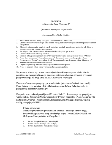ELEKTOR Milosniczka Ziemi Ojczystej III Sprawnosc wymagana do pionierki phm. Anna Nowobilska-Vasilios 1. 2. Wie co oznacza termin “czasy elekcyjne.” umiejscowi ten okres w czasie Opowie o Warszawie wymieniajac kilka dzielnic stolicy, rozpozna wazniejsze zabytki na pocztówkach lub fotografiach. 3. Zdobedzie wiadomosci o trzech slawnych postaciach polskich tego okresu z nastepujacych: Batory, Sobieski, Zamoyski, Chodkiewicz, Czerniecki 4. Zna miejsca kilku slawnych bitew i wie z kim Polska walczyla w tym okresie. 5. Opowie o Sobieskim i odsieczy Wiednia. 6. Wymieni tytuly poszczególnych czesci “Trylogii” Sienkiewicza. Zaznajomi sie z trescia “Potopu”. 7. Pozna fakty historyczne “Obrony Czestochowy”. Przeczytala trzy rozdzialy opisujace obrone Czestochowy z “Potopu” zaczynajace sie od “Tymczasem odezwal sie grozny Alfuid Witenberg ...” 8. Napisze krótkie streszczenie tych rozdzialów. 9. Obejrzala reprodukcje obrazów Matejki i potrafi kilka z nich rozpoznac. 10. Powie co sie dzialo w tym czasie w kraju jej obecnego zamieszkania Na pierwszej zbiórce tego tematu, dowiaduja sie harcerki tego czego nie wiedza lub nie pamietaja... na nastepnej zbiórce, po nauczeniu sie tematu zabawnym sposobem gry, mozna przeprowadzic po raz drugi turnej ELEKTOR! (w stylu Jeopardy!) Zastepowa/Druzynowa przygotuje gre przed zbiórka (potrzebne sa 240 4x6 index cards). Przed zbiórka, czyta rozdzialy z historii Polskiej za czasów królów Elekcyjnych aby sie przygotowac na przeprowadzenie gry. Kategorie, wraz punktami przykleja na 120 kartek “index” . Tematy moga byc przyklejone wedlug koloru. Zastepowa/Druzynowa przykleja “Pytania” na przodzie i “Odpowiedzi” na tyle nastepnych 120 kartek. Rysunki/obrazki, lub zaznaczyone stronice podrecznika, wpisuje wedlug nastepujacych LITER. Pytania obrazkowe: Nalezy sie je wynalesc w podrecznikach polskich, i zaznaczyc stronice do gry. Pocztówki lub przezrocza moga równiez byc urzyte. Poczet Królów Polskich jest idealnym zródlem portretów królów polskich. A. B. C. Portret Henryka Walezego (Jana Matejki) Portret Stefana Batorego (Jana Matejki) Portret Zygmunta III Wazy (Jana Matejki) amnv:HIS4 MZO III 010399 1 Hufiec Harcerek "Tatry", Chicago HISTORIA I KULTURA POLSKI D. E. F. G. H. I. J. K. L. M. N. O. P. Q. R. S. T. U. V. W. X. Y. Z. AA. BB. CC. DD. METODA HARCERSKA Portret Wladyslawa IV Wazy (Jana Matejki) Portret Jana II Kazimierza Wazy (Jana Matejki) Portret Michala Korybuda Wisniowieckiego (Jana Matejki) Portret Jana III Sobieskiego (Jana Matejki) Portret Augusta II Sasa (Jana Matejki) Portret Stanislawa I Leszczynskiego (Jana Matejki) Portret Augusta III Sasa (Jana Matejki) Portret Stanislawa II Augusta Poniatowskiego (Jana Matejki) Katedra sw. Jana (Warszawa) Palac Wilanowski (Warszawa) Palac :azienkowski (Warszawa) Pomnik Szopena (Warszawa) Syrena Warszawska Plac Zamkowy, Zamek Królewski (Warszawa) Kolumna Zygmunta (III-go Wazy) Rynek Starego Miasta (Warszawa) Pomnik Kopernika (Warszawa) Kazanie Skargi (Jana Matejki) Rejtan na Sejmie Warszawskim (Jana Matejki) Batory pod Pskowem (Jana Matejki) Sobieski pod Wiedniem (Jana Matejki) Kosciuszko pod Raclawicami (Jana Matejki) sluby Jana Kazimierza (Jana Matejki) Konstytucja 3-go maja (Jana Matejki) Chmielnicki i Tuhaj-Bej pod Lwowem (Jana Matejki) Autoportret (Jana Matejki) Tadeusz Kosciuszko pod Raclawicami (Jana Matejki) Przeprowadzajaca wybiera 6 tematów i uklada je w stylu “Jeopardy!”: szesc kolumn po 10 kartek. Podklada kartki z “pytaniami” do góry, pod kartkami zawierajacymi punkty. Jest to sklad pierwszego turneju. Przeprowadzajaca harcerki podziela na 3 zespoly. Mozna to zrobic musztra lub innym ciekawym sposobem. Kazdy zespól wymysla swój dzwiek, którym musi oznaczyc ze zna odpowied-. Pierwszy zespól który sie odezwie swym dzwiekiem ma pierwsze prawo odpowiedzi. Czas do myslenia przeprowadzaca ogranicza do 30 sekund. Zespól w którym jest najmlodsza harcerka zaczyna wpierw, wybierajac kategorie i punkty. Punkty nie trzeba wybierac kolejnie. Zespól który dokladnie odpowieda wybiera nastepna kategorie i punkty. Kazda poprawna odpowiedz otrzymuje odpowiednie punkty. (Podczas pierwszej zbiórki, nie odejmuje sie punktów za nieprawidlowa odpowiedz. Mozna punkty odejmowac podczas drugiej zbiórki, poniewaz harcerki powinny byc na nia przygotowane.) amnv:HIS4 MZO III 010399 2 Hufiec Harcerek "Tatry", Chicago HISTORIA I KULTURA POLSKI METODA HARCERSKA Po ukonczeniu pierwszego turneju, przeprowadzajaca rozklada w ten sam sposób pozostale szesc tematów. W miedzyczasie, najstarsza harcerka prowadzi reszte w spiewie, wedlug planu zbiórki. W tej drugiej czesci gry, harcerki otrzymuja podwójne punkty za poprawna odpowiedz. Po unkonczeniu drugiego turneju, przeprowadzajaca rozklada BONUS pytania. Zespoly podaja ile ze swoich puntów losuja na finalowe “odpowiedzi”. Zespól z najwieksza iloscia punktów zwycieza gre “ELEKTOR!” BRAWO! Po ukonczeniu gry, wszystkie “odpowiedzi” i “pytania” zastep uklada w kolejnosci kronologicznej ... a harcerki umieszczaja je w swoich dziennikach. Z tych informacji przygotowuja sie na nastepna zbiórke podczas której punkty za nieprawidlowe odpowiedzi beda odejmowane. Turnej gry “ELEKTOR!” mozna przeprowadzic w kazdej druzynie, a wygrywajace harcerki mozna przyznaczyc do turneju szczepu lub hufca. Która kandydatka na stopien pionierki wykaze sie najwieksza znajomoscia na swoim terenie? ALLAH Mam szare szarowary i zielony kaftan Turbany wyszywane lazurowym haftem Gong dzwoni, ciemno jest w okól Ah, slotkie jest rachatlukum Mamalyga i nugaty Turcja, Turcja, Allah, Allah, Allah ... Meczety, minarety, kolorowy mua Chityna, kafeina, harem amanulah Bismilah, mial Allah lampe Ta zgasla, ciemno w okól jest Ty turczynie, Saladynie Mekka, Mekka, Allah, Allah, Allah ... Przystapil na ulicy do Sultana zebrak Dobrego wychowania zebrakowi nie brak Gong dzwoni, dwa piastry daje Sultan Bo mniej dac nie wypada mu Ty t