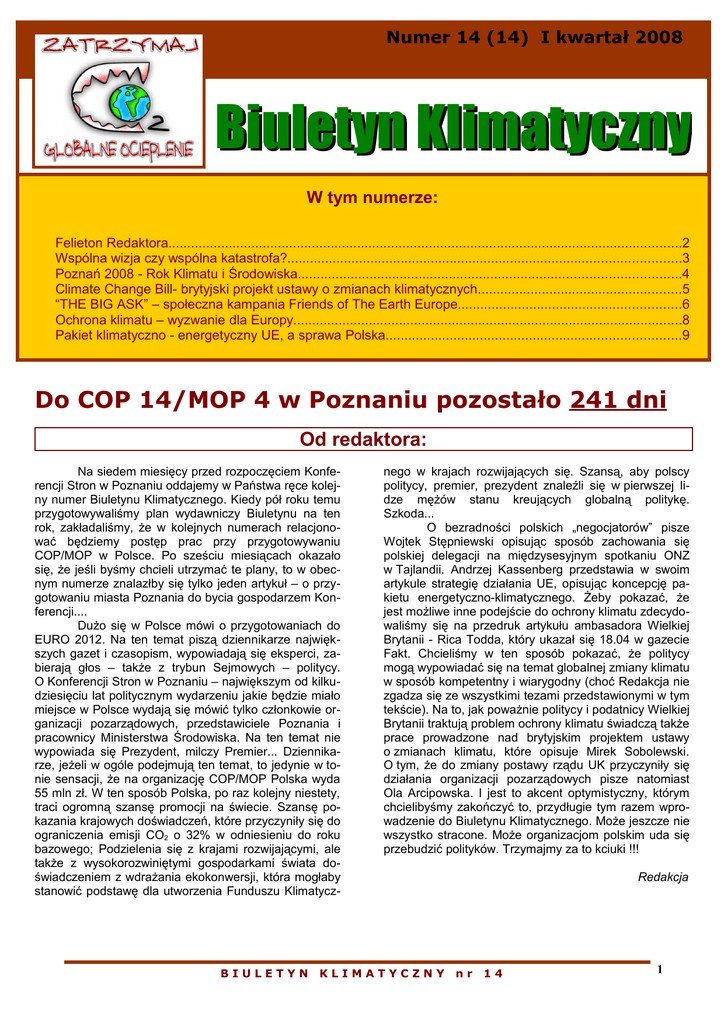 Numer 14 (14) I kwartał 2008 Biuletyn Klimatyczny W tym numerze: Felieton Redaktora........................................................................................................................................2 Wspólna wizja czy wspólna katastrofa?........................................................................................................3 Poznań 2008 - Rok Klimatu i Środowiska.....................................................................................................4 Climate Change Bill- brytyjski projekt ustawy o zmianach klimatycznych......................................................5 “THE BIG ASK” – społeczna kampania Friends of The Earth Europe...........................................................6 Ochrona klimatu – wyzwanie dla Europy.......................................................................................................8 Pakiet klimatyczno - energetyczny UE, a sprawa Polska..............................................................................9 Do COP 14/MOP 4 w Poznaniu pozostało 241 dni Od redaktora: Na siedem miesięcy przed rozpoczęciem Konferencji Stron w Poznaniu oddajemy w Państwa ręce kolejny numer Biuletynu Klimatycznego. Kiedy pół roku temu przygotowywaliśmy plan wydawniczy Biuletynu na ten rok, zakładaliśmy, że w kolejnych numerach relacjonować będziemy postęp prac przy przygotowywaniu COP/MOP w Polsce. Po sześciu miesiącach okazało się, że jeśli byśmy chcieli utrzymać te plany, to w obecnym numerze znalazłby się tylko jeden artykuł – o przygotowaniu miasta Poznania do bycia gospodarzem Konferencji.... Dużo się w Polsce mówi o przygotowaniach do EURO 2012. Na ten temat piszą dziennikarze największych gazet i czasopism, wypowiadają się eksperci, zabierają głos – także z trybun Sejmowych – politycy. O Konferencji Stron w Poznaniu – największym od kilkudziesięciu lat politycznym wydarzeniu jakie będzie miało miejsce w Polsce wydają się mówić tylko członkowie organizacji pozarządowych, przedstawiciele Poznania i pracownicy Ministerstwa Środowiska. Na ten temat nie wypowiada się Prezydent, milczy Premier... Dziennikarze, jeżeli w ogóle podejmują ten temat, to jedynie w tonie sensacji, że na organizację COP/MOP Polska wyda 55 mln zł. W ten sposób Polska, po raz kolejny niestety, traci ogromną szansę promocji na świecie. Szansę pokazania krajowych doświadczeń, które przyczyniły się do ograniczenia emisji CO2 o 32% w odniesieniu do roku bazowego; Podzielenia się z krajami rozwijającymi, ale także z wysokorozwiniętymi gospodarkami świata doświadczeniem z wdrażania ekokonwersji, która mogłaby stanowić podstawę dla utworzenia Funduszu Klimatycz- BIULETYN nego w krajach rozwijających się. Szansą, aby polscy politycy, premier, prezydent znaleźli się w pierwszej lidze mężów stanu kreujących globalną politykę. Szkoda... O bezradności polskich „negocjatorów” pisze Wojtek Stępniewski opisując sposób zachowania się polskiej delegacji na międzysesyjnym spotkaniu ONZ w Tajlandii. Andrzej Kassenberg przedstawia w swoim artykule strategię działania UE, opisując koncepcję pakietu energetyczno-klimatycznego. Żeby pokazać, że jest możliwe inne podejście do ochrony klimatu zdecydowaliśmy się na przedruk artykułu ambasadora Wielkiej Brytanii - Rica Todda, który ukazał się 18.04 w gazecie Fakt. Chcieliśmy w ten sposób pokazać, że politycy mogą wypowiadać się na temat globalnej zmiany klimatu w sposób kompetentny i wiarygodny (choć Redakcja nie zgadza się ze wszystkimi tezami przedstawionymi w tym tekście). Na to, jak poważnie politycy i podatnicy Wielkiej Brytanii traktują problem ochrony klimatu świadczą także prace prowadzone nad brytyjskim projektem ustawy o zmianach klimatu, które opisuje Mirek Sobolewski. O tym, że do zmiany postawy rządu UK przyczyniły się działania organizacji pozarządowych pisze natomiast Ola Arcipowska. I jest to akcent optymistyczny, którym chcielibyśmy zakończyć to, przydługie tym razem wprowadzenie do Biuletynu Klimatycznego. Może jeszcze nie wszystko stracone. Może organizacjom polskim uda się przebudzić polityków. Trzymajmy za to kciuki !!! KLIMATYCZNY Redakcja nr 14 1 Felieton Redaktora estem zły. Nie. Nie zły. Jestem wściekły. Jestem wściekły, bo po raz kolejny Polska przegrywa swoją szansę. Chociaż tyle w ostatnich miesiącach słyszeliśmy o nowym otwarciu, o prowadzeniu odpowiedzialnej polityki międzynarodowej, o odpowiedzialności polskich polityków. I co ? I nic! chciałoby się powiedzieć. J W grudniu w Poznaniu odbędzie się COP/MOP. Nigdy dotąd Polska nie była organizatorem tak ważnego wydarzenia, na które przybędą przedstawiciele ponad 190 państw. Wśród nich premierzy, ministrowie środowiska, gospodarki, finansów, spraw zagranicznych. W sumie 10 – 12 tysięcy osób. Będą oni debatować nad potrzebą i sposobami ochrony klimatu. Czy można sobie wymarzyć lepsze forum dla promocji działań jakie Polska zrealizowała w tym zakresie w ostatnich kilkunastu latach ? Jesteśmy jednym z niewielu państw rozwiniętych, które w ciągu ostatnich 20 lat zmniejszyły emisję dwutlenku węgla. Zapłaciliśmy za to początkowo wysoką cenę – bezrobocia i zmniejszenia tempa rozwoju gospodarczego, ale zebrane doświadczenia procentowały w kolejnych latach, kiedy szybkiemu wzrostowi gospodarczemu i tworzeniu nowych miejsc pracy towarzyszył spadek emisji. Tym doświadczeniem powinniśmy dzielić się z innymi, zwłaszcza „nowymi tygrysami” globalnej gospodarki: Chinami, Brazylią, Indiami. Nasze doświadczenia z ekokonwersją długu mogą natomiast okazać się bezcenne dla zadłużonych krajów III Świata – zaproponujmy, aby mechanizm ten stał się podstawą dla stworzenia Funduszu Solidarności Klimatycznej Północ - Południe. Może to zbudować pozycję międzynarodową Polski w łatwiejszy sposób niż