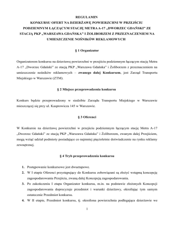 REGULAMIN KONKURSU OFERT NA DZIERŻAWĘ POWIERZCHNI W PRZEJŚCIU PODZIEMNYM ŁĄCZĄCYM STACJĘ METRA A-17 „DWORZEC GDAŃSKI” ZE STACJĄ PKP „WARSZAWA GDAŃSKA” I ŻOLIBORZEM Z PRZEZNACZENIEM NA UMIESZCZENIE NOŚNIKÓW REKLAMOWYCH § 1 Organizator Organizatorem konkursu na dzierżawę powierzchni w przejściu podziemnym łączącym stację Metra A-17 „Dworzec Gdański” ze stacją PKP „Warszawa Gdańska” i Żoliborzem z przeznaczeniem na umieszczenie nośników reklamowych – zwanego dalej Konkursem, jest Zarząd Transportu Miejskiego w Warszawie (ZTM). § 2 Miejsce przeprowadzenia konkursu Konkurs będzie przeprowadzony w siedzibie Zarządu Transportu Miejskiego w Warszawie mieszczącej się przy ul. Kasprowicza 145 w Warszawie. § 3 Oferenci W Konkursie na dzierżawę powierzchni w przejściu podziemnym łączącym stację Metra A-17 „Dworzec Gdański” ze stacją PKP „Warszawa Gdańska” i Żoliborzem, zwanym dalej Przejściem, mogą wziąć udział podmioty posiadające co najmniej pięcioletnie doświadczenie na rynku reklamy zewnętrznej. § 4 Tryb przeprowadzenia konkursu 1. Postępowanie konkursowe jest dwuetapowe. 2. W I etapie Oferenci przystępujący do Konkursu zobowiązani są złożyć wstępną koncepcję zagospodarowania Przejścia, zwaną dalej Koncepcją zagospodarowania. 3. Po zakończeniu I etapu Organizator konkursu, m.in. na podstawie złożonych Koncepcji zagospodarowania doprecyzuje przedmiot i warunki dzierżawy, określając tym samym ostatecznie Przedmiot konkursu. 4. W II etapie, Przedmiot konkursu, tj. określona powierzchnia podlegająca dzierżawie we 1 wskazanych miejscach, z podaniem dopuszczalnej wielkości i typu poszczególnych nośników do zamontowania w danych lokalizacjach wraz z projektem umowy dzierżawy zostanie przedstawiony Oferentom w celu złożenia Ofert. 5. Przed otwarciem ofert Organizator konkursu poda cenę minimalną miesięcznego czynszu, za dzierżawę Przedmiotu konkursu. 6. W II etapie Konkursu mogą wziąć udział jedynie podmioty, które przystąpiły do I etapu i złożyły Koncepcję zagospodarowania, nie podlegającą odrzuceniu. § 5 Koncepcja zagospodarowania 1. Koncepcja zagospodarowania musi zawierać: a) dane podmiotu składającego Koncepcję zagospodarowania, w szczególności nazwę, siedzibę, adres do korespondencji podmiotu, telefon kontaktowy oraz imię i nazwisko osoby upoważnionej do kontaktów w sprawie Koncepcji zagospodarowania; b) część graficzną z naniesionymi na Plan sytuacyjny Przejścia nośnikami. Plan sytuacyjny Przejścia stanowi załącznik nr 1 do niniejszego Regulaminu; c) część opisową stanowiącą uzupełnienie części graficznej z informacją na temat: • ilości zaproponowanych nośników, • umiejscowienia poszczególnych nośników, • wielkości poszczególnych nośników, • rodzaju zaproponowanych nośników wraz z parametrami technicznymi, • sposobu zasilania w przypadku nośników wymagających zasilania elektrycznego, • sposobu montażu nośników. d) Oświadczenie Oferenta składającego Koncepcję zagospodarowania, iż wyraża on zgodę na wykorzystanie jej w całości lub części w II etapie Konkursu przez Organizatora konkursu, w szczególności do określenia Przedmiotu Konkursu; e) Oświadczenie Oferenta składającego Koncepcję zagospodarowania, iż spełnia on warunek udziału w Konkursie, o którym mowa w § 3, tj. posiada co najmniej pięcioletnie doświadczenie na rynku reklamy zewnętrznej. 2. Koncepcja zagospodarowania musi być sporządzona w wersji papierowej, podpisana przez oferenta oraz opatrzona datą sporządzenia. 3. Za prawidłowość i kompletność Koncepcji zagospodarowania odpowiada oferent. 2 § 6 Oferta 1. Oferta musi zawierać: a) dane oferenta, w szczególności nazwę, siedzibę, adres do korespondencji oraz telefon kontaktowy oraz imię i nazwisko upoważnionej do kontaktów w sprawie Oferty; b) oferowaną wysokość stawki czynszu netto za miesiąc dzierżawy, wyrażoną w PLN, do dwóch miejsc po przecinku – zapis liczbowy i słowny oferowanej stawki (jednoznacznie bez tzw. „przedziałów” i innych wariantów); c) numer konta, na który zostanie dokonany ewentualny zwrot wadium w przypadkach określonych w zasadach Konkursu; d) podpis oferenta i datę sporządzenia Oferty. 2. Za ważną uznaje się jedynie kompletnie wypełnioną Ofertę złożoną na formularzu stanowiącym załącznik nr 2 do niniejszego Regulaminu. Druk należy wypełnić czytelnie pismem odręcznym lub korzystając z komputera, maszyny do pisania. Zmiana treści wzoru Oferty lub złożenie niekompletnej Oferty może skutkować jej odrzuceniem. 3. Za prawidłowość i kompletność Oferty odpowiada Oferent. 4. Do oferty należy załączyć obowiązkowo n/w dokumenty a) niezmienione i podpisane załączniki nr 1 i 2 do Oferty; b) kopię potwierdzoną za zgodność z oryginałem dokumentu potwierdzającego prowadzenie działalności gospodarczej z datą wystawienia nieprzekraczającą 3 miesięcy przed datą złożenia oferty (zaświadczenia o wpisie do ewidencji działalności gospodarczej lub odpisu z KRS, itp.); c) kopie potwierdzone za zgodność z oryginałami Decyzji o nadaniu nr REGON i NIP; d) aktualne zaświadczenia z Urzędu Skarbowego i ZUS o niezaleganiu z płatnościami wg stanu na datę ogłoszenia konkursu lub oświadczenia o braku zaległości w ww. opłatach wraz z pisemnym zobowiązaniem się do dostarczenia zaświadczeń przed podpisaniem umowy; e) oryginał lub kopię potwierdzoną za zgodność z oryginałem pełnomocnictwa udzielonego w formie pisemnej w przypadku umocowania pełnomocnika do zawarcia umowy, wraz z kopią dowodu osobistego pełnomocnika. § 7 Warunki uczestnictwa w konkursie 1. Warunkiem uczestnictwa w Konkursie jest: 3 a) w etapie I: • złożenie Koncepcji zagospodarowania, przygotowanej zgodnie z wymogami określonymi w niniejszym Regulaminie. b) w etapie II: • wniesienie wadium; • złożenie 