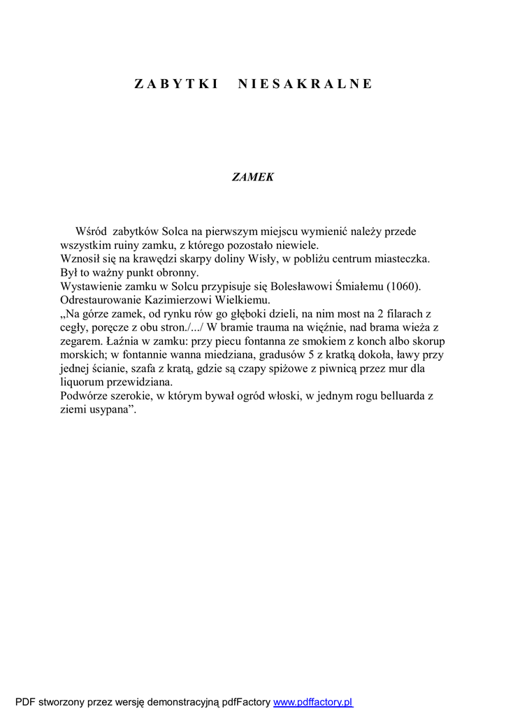 ZABYTKI NIESAKRALNE ZAMEK Wśród zabytków Solca na pierwszym miejscu wymienić należy przede wszystkim ruiny zamku, z którego pozostało niewiele. Wznosił się na krawędzi skarpy doliny Wisły, w pobliżu centrum miasteczka. Był to ważny punkt obronny. Wystawienie zamku w Solcu przypisuje się Bolesławowi Śmiałemu (1060). Odrestaurowanie Kazimierzowi Wielkiemu. „Na górze zamek, od rynku rów go głęboki dzieli, na nim most na 2 filarach z cegły, poręcze z obu stron./.../ W bramie trauma na więźnie, nad brama wieża z zegarem. Łaźnia w zamku: przy piecu fontanna ze smokiem z konch albo skorup morskich; w fontannie wanna miedziana, gradusów 5 z kratką dokoła, ławy przy jednej ścianie, szafa z kratą, gdzie są czapy spiżowe z piwnicą przez mur dla liquorum przewidziana. Podwórze szerokie, w którym bywał ogród włoski, w jednym rogu belluarda z ziemi usypana”. PDF stworzony przez wersję demonstracyjną pdfFactory www.pdffactory.pl Fot.23 Rycina zamku. Tę wspaniałą na owe czasy siedzibę magnacką spaliły wojska szwedzkie, a później nie odbudowany zamek miał zaledwie kilka pomieszczeń mieszkalnych i uległ z wolna zniszczeniu. Ogrody zniszczone, drzewa powycinane. Mury i szańce wokół zamku także uległy zniszczeniu. Zostało tylko w prawej części zamku 3 pokoje z garderobą i przedpokojem W lewej części 1 apartament, pokój jadalny i galeria. Na górze kuchnia z piekarnią i 2 spiżarki. Na dole magazyn, sień, stajnia, wozownia. Pozostała część zamku uległa spustoszeniu. W ciągu XIX wieku zamek stał się kompletną ruiną. Dzisiaj sterczące kawałki murów z kamienia łamanego i cegły z zachowanymi fragmentami tynków nakazują wysilić wyobraźnię by przywrócić świetność tej budowli. PDF stworzony przez wersję demonstracyjną pdfFactory www.pdffactory.pl Fot. 24 Ruiny zamku soleckiego. Do zamku należały: 1. Dom pod zamkiem o jednej izbie. 2. Dom w rynku miasta (szynk). 3. Browar pod zamkiem i chałupa. 4. Pisaria o dwóch izbach i dwóch alkierzach ze spiżarką z drewna łupanego. 5. Stajnie ze stancją dla pachołka a obok dwie wozówki dla pisarza i ekonoma. 6. Raj – folwark o ćwierć mili za miastem. Lustracja z 1600 roku mówi, że były tam dwa budynki i pałac. Posiadał ogród wielki fruktozy, chmielnik, szynk i zwierzyniec. „Od południa winniczka, gdzie się i wino rodzi i drzewek brzoskwiniowych albo morelowych rodzajnych jest ponad półkowy. Pod górą jest ogród włoski wielki, figarnia porządna, w niej drzew figowych 39, wszystkie dobrze obrodziły; drzewa brzoskwiniowego, morelowego i inszego około 300 sztuk; tamże dwa ogrody warzywne. Zwierzyniec długi i szeroki, w nim gaik olszowy. Bywało tu zwierza nie mało, m.in.; bawoły, łanie. PDF stworzony przez wersję demonstracyjną pdfFactory www.pdffactory.pl Fot.25 Widok pałacu w Raju. DOM Z PODCIENIAMI TZW. KOMENDARIA Budowlę domu podcieniowego datować można niemal dokładnie na rok 1787 na podstawie inwentarza noszącego datę, gdzie obiekt ten już występuje. Pierwotnie obiekt ten należał do probostwa, był mieszkaniem duchownego (komentarza), w latach następnych znajdowała się tutaj najprawdopodobniej zajazd i karczma. W latach międzywojennych mieściła się tu szkoła podstawowa, do której ze względu na szczupłość miejsca w samym budynku komendarii, dobudowano w pierzei rynku dwukondygnacyjne, murowane skrzydło. Badania i pomiary przeprowadzone w 1962 roku wykazały, że dom znajdował się w stanie dość posuniętego zniszczenia. Dopiero połączone z wyburzeniem przybudówek, gruntowne prace restauracyjne i konserwatorskie, PDF stworzony przez wersję demonstracyjną pdfFactory www.pdffactory.pl ukończone w 1978 roku przywróciły domowi z podcieniami pierwotny stan i świetność. Obecnie mieści się tutaj Gminny Ośrodek Kultury. Jest to budowla parterowa, na planie wydłużonego prostokąta, ustawiona szczytem do placu Bolesława Śmiałego. Do szczytu przylega, wsparty na czterech murowanych kolumnach, głęboki podcień. Budynek wykonany jest z bali modrzewiowych w konstrukcji wieńcowej, o węgłach łączonych na tzw. jaskółczy ogon i pięknie wykończonych zakończeniach belek stropowych. Dwuspadowy, kryty gontem wysoki dach kryje raczej niemieszkalne, bo nieoświetlone poddasze. Pierwotne rozplanowanie wnętrza trudne byłoby dzisiaj do odtworzenia, jednak z pewnością był to dom jednotraktowy z trzema dużymi, amidowo połączonymi częściami, zawierającymi dwie izby, sień oraz komorę i alkierz. W elewacji południowej znajdują się dwie pary drzwi, które były kiedyś jedynymi wejściami do budynku, oraz trzy duże okna. W elewacji północnej okna są znacznie mniejsze, umieszczone wysoko; w ostatniej części znajduje się brama wjazdowa, pamiętająca zapewne czasy, gdy dom był zajazdem. Dom z podcieniami jest jedną z niewielu w Solcu budowli, dającą wyobrażenie o pierwotnym usytuowaniu, skali i charakterze zabudowy miasteczka. Fot.26 Komendaria. Widok od strony plebani. PDF stworzony przez wersję demonstracyjną pdfFactory www.pdffactory.pl Fot.27 Komendaria. Widok od strony wejścia. PDF stworzony przez wersję demonstracyjną pdfFactory www.pdffactory.pl