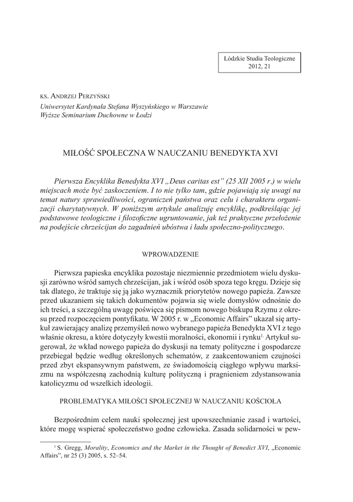 Łódzkie Studia Teologiczne 2012, 21 ks. Andrzej Perzyński Uniwersytet Kardynała Stefana Wyszyńskiego w Warszawie Wyższe Seminarium Duchowne w Łodzi Miłość społeczna w nauczaniu Benedykta XVI Pierwsza Encyklika Benedykta XVI „Deus caritas est” (25 XII 2005 r.) w wielu miejscach może być zaskoczeniem. I to nie tylko tam, gdzie pojawiają się uwagi na temat natury sprawiedliwości, ograniczeń państwa oraz celu i charakteru organizacji charytatywnych. W poniższym artykule analizuję encyklikę, podkreślając jej podstawowe teologiczne i filozoficzne ugruntowanie, jak też praktyczne przełożenie na podejście chrześcijan do zagadnień ubóstwa i ładu społeczno-politycznego. Wprowadzenie Pierwsza papieska encyklika pozostaje niezmiennie przedmiotem wielu dyskusji zarówno wśród samych chrześcijan, jak i wśród osób spoza tego kręgu. Dzieje się tak dlatego, że traktuje się ją jako wyznacznik priorytetów nowego papieża. Zawsze przed ukazaniem się takich dokumentów pojawia się wiele domysłów odnośnie do ich treści, a szczególną uwagę poświęca się pismom nowego biskupa Rzymu z okresu przed rozpoczęciem pontyfikatu. W 2005 r. w „Economic Affairs” ukazał się artykuł zawierający analizę przemyśleń nowo wybranego papieża Benedykta XVI z tego właśnie okresu, a które dotyczyły kwestii moralności, ekonomii i rynku1. Artykuł sugerował, że wkład nowego papieża do dyskusji na tematy polityczne i gospodarcze przebiegał będzie według określonych schematów, z zaakcentowaniem czujności przed zbyt ekspansywnym państwem, ze świadomością ciągłego wpływu marksizmu na współczesną zachodnią kulturę polityczną i pragnieniem zdystansowania katolicyzmu od wszelkich ideologii. Problematyka miłości społecznej w nauczaniu Kościoła Bezpośrednim celem nauki społecznej jest upowszechnianie zasad i wartości, które mogę wspierać społeczeństwo godne człowieka. Zasada solidarności w pew1 S. Gregg, Morality, Economics and the Market in the Thought of Benedict XVI, „Economic Affairs”, nr 25 (3) 2005, s. 52–54. 224 Andrzej Perzyński nej mierze zawiera w sobie wszystkie inne spośród tych zasad: jawi się ona „jako jedna z fundamentalnych zasad chrześcijańskiej koncepcji organizacji społecznej i politycznej”2. Zasadę tę rozświetla prymat miłości, która jest „znakiem rozpoznawczym uczniów Chrystusa (por. J 13, 35)”3. Jezus „poucza nas, że podstawowym prawem doskonałości ludzkiej, a co za tym idzie przemiany świata, jest nowe przykazanie miłości”4 (por. Mt 22, 40; 15, 12; Kol 3, 14; Jk 2, 8). Postępowanie osoby jest w pełni ludzkie, gdy rodzi się z miłości, ukazuje miłość i miłością się rządzi. Prawda ta odnosi się również do obszaru społecznego: trzeba, aby chrześcijanie byli jej głęboko przekonanymi świadkami i umieli swoim życiem okazywać, że miłość jest jedyną siłą (por. 1 Kor 12, 31–14,1), która może prowadzić do osobistej i społecznej doskonałości oraz kierować historię ku dobru. Miłość powinna być obecna w życiu zbiorowym i przenikać wszystkie stosunki społeczne5: zwłaszcza ci, którzy mają obowiązek troszczyć się o dobro ludzi „niech się starają posiąść, utrzymać i w drugich rozniecić zarówno w bogatych, jak ubogich, miłość, panią i królową wszystkich cnót. Upragnionego ratunku bowiem można się spodziewać tylko od szeroko rozlanej miłości, tj. chrześcijańskiej miłości, w której streszcza się cała Ewangelia, a która, zawsze gotowa do poświęceń na rzecz bliźniego, stanowi najpewniejsze lekarstwo przeciw współczesnemu duchowi buntu i przeciw egoizmowi”6. Miłość tę można nazwać „miłością społeczną”7 lub „miłością polityczną”8, a powinna ona ogarniać cały rodzaj ludzki9. „Miłość społeczna”10 znajduje się na przeciwległym biegunie w stosunku do egoizmu i indywidualizmu. Nie absolutyzując życia społecznego, jak w ograniczonych wizjach wyłącznie socjologicznych interpretacji rzeczywistości, nie można zapominać o tym, że integralny rozwój osoby i społeczny postęp warunkują się wzajemnie. Dlatego egoizm jest najbardziej zabójczym wrogiem porządku społecznego. Historia minionego wieku pokazuje do jakiego spustoszenia serc dochodzi, gdy człowiek nie potrafi uznać innej wartości i innej rzeczywistości poza dobrami materialnymi, których zdobywanie tłumi i ogranicza jego zdolność do dawania siebie. Aby społeczeństwo stało się bardziej ludzkie, bardziej godne osoby, niezbędne jest docenienie miłości w życiu społecznym – na płaszczyźnie politycznej, ekonomicznej, kulturowej – i uczynienie z niej stałej i najwyższej normy działania. Jeśli sprawiedliwość „sama z siebie zdolna jest tylko rozsądzać pomiędzy ludźmi, rozdzielając wśród nich przedmiotowe dobra słuszną miarą, to natomiast miłość, i tylko miłość (także owa łaskawa miłość, którą nazywamy «miłosierdziem») zdolna jest Jan Paweł II, Encyklika Centesimus annus, 10. Jan Paweł II, Encyklika Sollicitudo rei socialis, 40. 4 Konstytucja duszpasterska Gaudium et spes, 38; Katechizm Kościoła Katolickiego (=KKK), 826. 5 Por KKK 1889. 6 Leon XIII, Encyklika Rerum novarum: Acta Leonis XIII, 11(1892), 143. 7 Por. Jan XIII, Encyklika Mater et magistra: AAS 53(1961), 410. 8 Por. Paweł VI, List apostolski Octogesima adveniens, 46: AAS 63(1971), 433–435. 9 Por. KKK 1939. 10 Jan Paweł II, Encyklika Redemptor hominis, 15. 2 3 Miłość społeczna w nauczaniu Benedykta XVI 225 przywracać człowieka samemu człowiekowi” . Nie można układać stosunków międzyludzkich, stosując jedynie miarę sprawiedliwości: „Chrześcijanin wie, że miłość jest motywem, dla którego Bóg wchodzi w relację z człowiekiem. Także miłości oczekuje On jako odpowiedzi człowieka. Miłość jest również najwyższą i najszlachetniejszą formą relacji pomiędzy istotami 