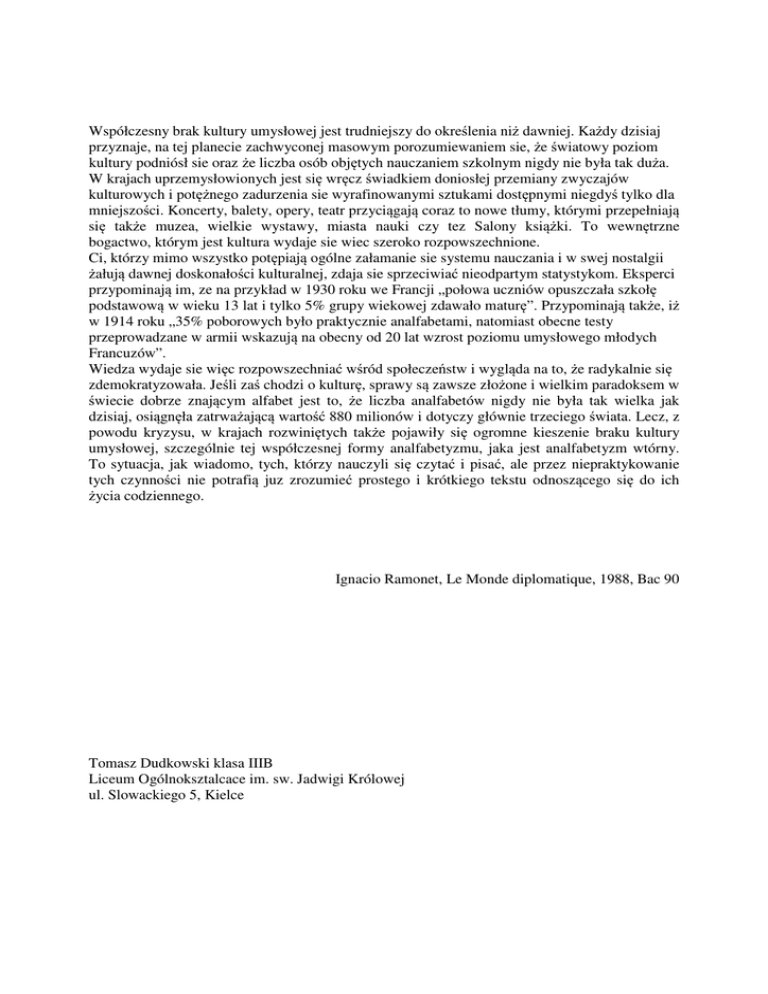 Współczesny brak kultury umysłowej jest trudniejszy do określenia niż dawniej. Każdy dzisiaj przyznaje, na tej planecie zachwyconej masowym porozumiewaniem sie, że światowy poziom kultury podniósł sie oraz że liczba osób objętych nauczaniem szkolnym nigdy nie była tak duża. W krajach uprzemysłowionych jest się wręcz świadkiem doniosłej przemiany zwyczajów kulturowych i potężnego zadurzenia sie wyrafinowanymi sztukami dostępnymi niegdyś tylko dla mniejszości. Koncerty, balety, opery, teatr przyciągają coraz to nowe tłumy, którymi przepełniają się także muzea, wielkie wystawy, miasta nauki czy tez Salony książki. To wewnętrzne bogactwo, którym jest kultura wydaje sie wiec szeroko rozpowszechnione. Ci, którzy mimo wszystko potępiają ogólne załamanie sie systemu nauczania i w swej nostalgii żałują dawnej doskonałości kulturalnej, zdaja sie sprzeciwiać nieodpartym statystykom. Eksperci przypominają im, ze na przykład w 1930 roku we Francji „połowa uczniów opuszczała szkołę podstawową w wieku 13 lat i tylko 5% grupy wiekowej zdawało maturę”. Przypominają także, iż w 1914 roku „35% poborowych było praktycznie analfabetami, natomiast obecne testy przeprowadzane w armii wskazują na obecny od 20 lat wzrost poziomu umysłowego młodych Francuzów”. Wiedza wydaje sie więc rozpowszechniać wśród społeczeństw i wygląda na to, że radykalnie się zdemokratyzowała. Jeśli zaś chodzi o kulturę, sprawy są zawsze złożone i wielkim paradoksem w świecie dobrze znającym alfabet jest to, że liczba analfabetów nigdy nie była tak wielka jak dzisiaj, osiągnęła zatrważającą wartość 880 milionów i dotyczy głównie trzeciego świata. Lecz, z powodu kryzysu, w krajach rozwiniętych także pojawiły się ogromne kieszenie braku kultury umysłowej, szczególnie tej współczesnej formy analfabetyzmu, jaka jest analfabetyzm wtórny. To sytuacja, jak wiadomo, tych, którzy nauczyli się czytać i pisać, ale przez niepraktykowanie tych czynności nie potrafią juz zrozumieć prostego i krótkiego tekstu odnoszącego się do ich życia codziennego. Ignacio Ramonet, Le Monde diplomatique, 1988, Bac 90 Tomasz Dudkowski klasa IIIB Liceum Ogólnoksztalcace im. sw. Jadwigi Królowej ul. Slowackiego 5, Kielce
