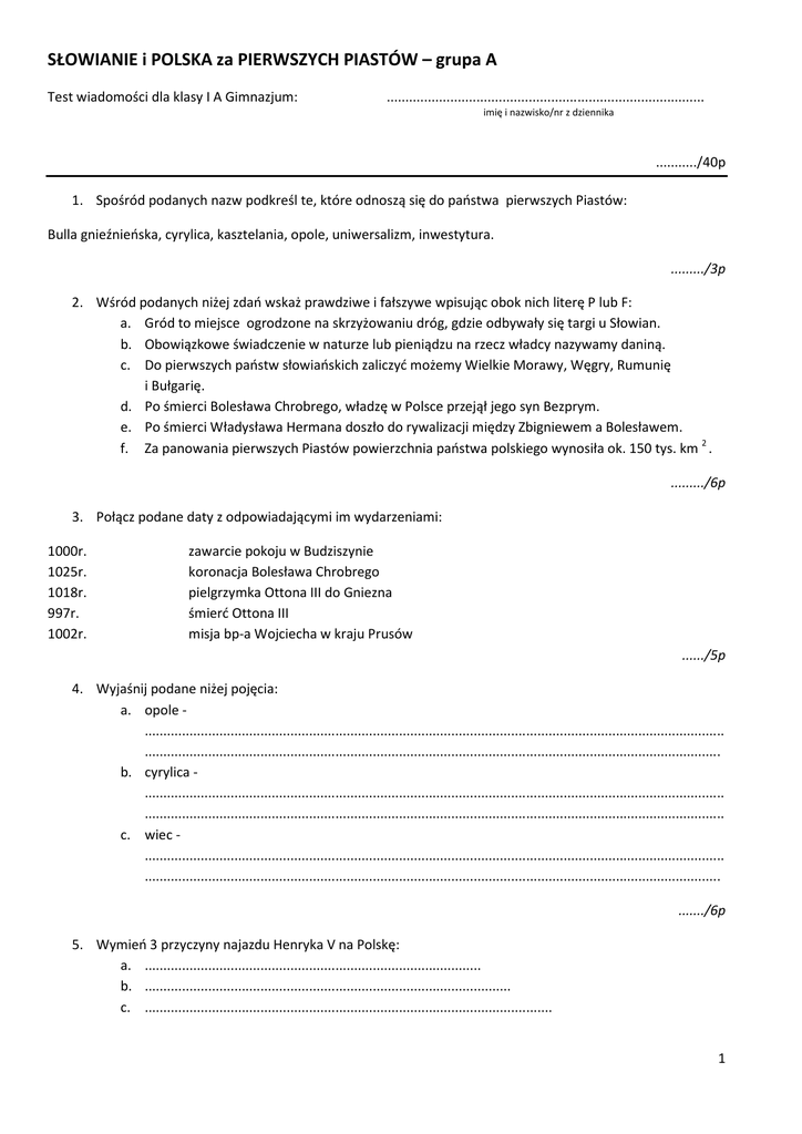 SŁOWIANIE i POLSKA za PIERWSZYCH PIASTÓW – grupa A Test wiadomości dla klasy I A Gimnazjum: ..................................................................................... imię i nazwisko/nr z dziennika .........../40p 1. Spośród podanych nazw podkreśl te, które odnoszą się do państwa pierwszych Piastów: Bulla gnieźnieńska, cyrylica, kasztelania, opole, uniwersalizm, inwestytura. ........./3p 2. Wśród podanych niżej zdań wskaż prawdziwe i fałszywe wpisując obok nich literę P lub F: a. Gród to miejsce ogrodzone na skrzyżowaniu dróg, gdzie odbywały się targi u Słowian. b. Obowiązkowe świadczenie w naturze lub pieniądzu na rzecz władcy nazywamy daniną. c. Do pierwszych państw słowiańskich zaliczyć możemy Wielkie Morawy, Węgry, Rumunię i Bułgarię. d. Po śmierci Bolesława Chrobrego, władzę w Polsce przejął jego syn Bezprym. e. Po śmierci Władysława Hermana doszło do rywalizacji między Zbigniewem a Bolesławem. f. Za panowania pierwszych Piastów powierzchnia państwa polskiego wynosiła ok. 150 tys. km 2 . ........./6p 3. Połącz podane daty z odpowiadającymi im wydarzeniami: 1000r. 1025r. 1018r. 997r. 1002r. zawarcie pokoju w Budziszynie koronacja Bolesława Chrobrego pielgrzymka Ottona III do Gniezna śmierć Ottona III misja bp-a Wojciecha w kraju Prusów ....../5p 4. Wyjaśnij podane niżej pojęcia: a. opole ........................................................................................................................................................... .......................................................................................................................................................... b. cyrylica ........................................................................................................................................................... ........................................................................................................................................................... c. wiec ........................................................................................................................................................... .......................................................................................................................................................... ......./6p 5. Wymień 3 przyczyny najazdu Henryka V na Polskę: a. .......................................................................................... b. .................................................................................................. c. ............................................................................................................. 1 ....../3p 6. Podaj 3 przejawy kryzysu państwa Piastów w latach 30-tych XI w.: a. ................................................................................................ b. ................................................................................................... c. ........................................................................................................ ....../3p 7. Wyjaśnij, w jaki sposób Bolesławowi Krzywoustemu udało się przywrócić zwierzchność Polski nad Pomorzem. ..................................................................................................................................................................................... ..................................................................................................................................................................................... ..................................................................................................................................................................................... ..................................................................................................................................................................................... ..................................................................................................................................................................................... ....../5p 8. Podkreśl odpowiedź właściwą. Dokument , w którym Mieszko I oddał pod opiekę papieża swoje państwo to: a. bulla b. relikwie c. Dagome iudex d. Pater noster ....../2p 9. Wymień 6 grodów głównych w państwie pierwszych Piastów: a. ........................... b. ....................................... c. ................................................. d. ...................................... e. .................................... f. .............................. ....../3p 10. Wyjaśnij, na czym polegał patrymonialny charakter państwa pierwszych Piastów. ..................................................................................................................................................................................... ..................................................................................................................................................................................... ..................................................................................................................................................................................... ..................................................................................................................................................................................... ....../4p RAZEM MOŻESZ ZDOBYĆ 40 PUNKTÓW POWODZENIA! ☺ 2 SŁOWIANIE i POLSKA za PIERWSZYCH PIASTÓW – grupa B Test wiadomości dla klasy I A Gimnazjum: ..................................................................................... imię i nazwisko/nr z dziennika .........../40p 1. Spośród podanych nazw podkreśl te, które odnoszą się do Słowian: Osady służebne, cyrylica, głagolica, barbakan, Gall Anonim, św. Metody ....../3p 2. Połącz podane niżej daty z odpowiadającymi im wydarzeniami: 1111r. 966r