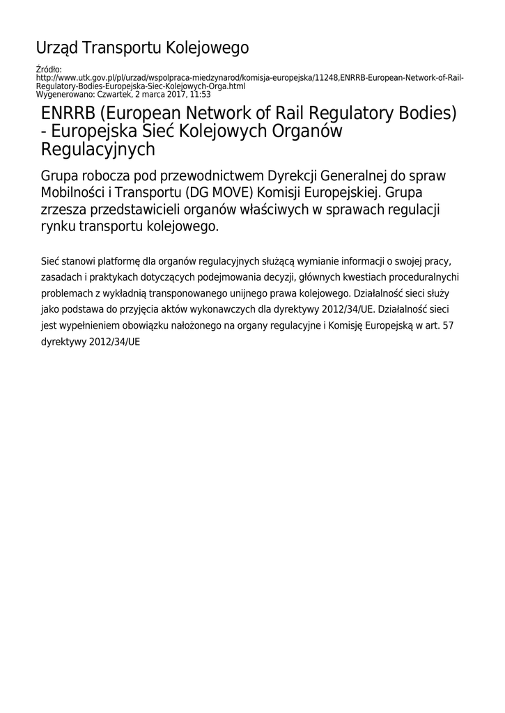 Urząd Transportu Kolejowego Źródło: http://www.utk.gov.pl/pl/urzad/wspolpraca-miedzynarod/komisja-europejska/11248,ENRRB-European-Network-of-RailRegulatory-Bodies-Europejska-Siec-Kolejowych-Orga.html Wygenerowano: Czwartek, 2 marca 2017, 11:53 ENRRB (European Network of Rail Regulatory Bodies) - Europejska Sieć Kolejowych Organów Regulacyjnych Grupa robocza pod przewodnictwem Dyrekcji Generalnej do spraw Mobilności i Transportu (DG MOVE) Komisji Europejskiej. Grupa zrzesza przedstawicieli organów właściwych w sprawach regulacji rynku transportu kolejowego. Sieć stanowi platformę dla organów regulacyjnych służącą wymianie informacji o swojej pracy, zasadach i praktykach dotyczących podejmowania decyzji, głównych kwestiach proceduralnychi problemach z wykładnią transponowanego unijnego prawa kolejowego. Działalność sieci służy jako podstawa do przyjęcia aktów wykonawczych dla dyrektywy 2012/34/UE. Działalność sieci jest wypełnieniem obowiązku nałożonego na organy regulacyjne i Komisję Europejską w art. 57 dyrektywy 2012/34/UE
