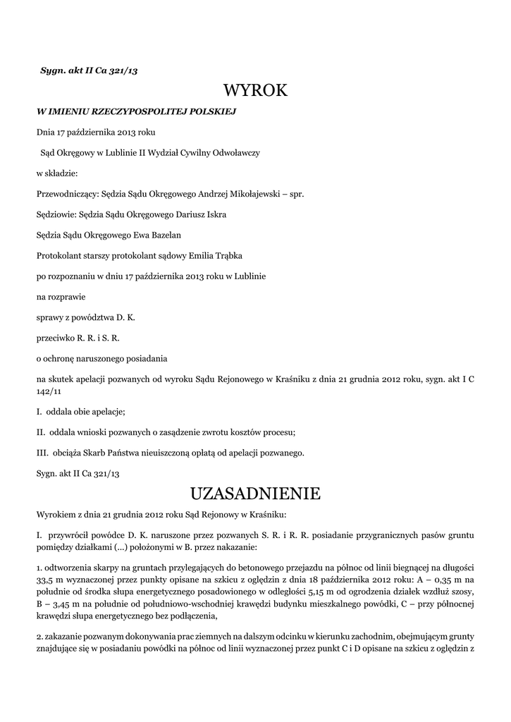 Sygn. akt II Ca 321/13 WYROK W IMIENIU RZECZYPOSPOLITEJ POLSKIEJ Dnia 17 października 2013 roku Sąd Okręgowy w Lublinie II Wydział Cywilny Odwoławczy w składzie: Przewodniczący: Sędzia Sądu Okręgowego Andrzej Mikołajewski – spr. Sędziowie: Sędzia Sądu Okręgowego Dariusz Iskra Sędzia Sądu Okręgowego Ewa Bazelan Protokolant starszy protokolant sądowy Emilia Trąbka po rozpoznaniu w dniu 17 października 2013 roku w Lublinie na rozprawie sprawy z powództwa D. K. przeciwko R. R. i S. R. o ochronę naruszonego posiadania na skutek apelacji pozwanych od wyroku Sądu Rejonowego w Kraśniku z dnia 21 grudnia 2012 roku, sygn. akt I C 142/11 I. oddala obie apelacje; II. oddala wnioski pozwanych o zasądzenie zwrotu kosztów procesu; III. obciąża Skarb Państwa nieuiszczoną opłatą od apelacji pozwanego. Sygn. akt II Ca 321/13 UZASADNIENIE Wyrokiem z dnia 21 grudnia 2012 roku Sąd Rejonowy w Kraśniku: I. przywrócił powódce D. K. naruszone przez pozwanych S. R. i R. R. posiadanie przygranicznych pasów gruntu pomiędzy działkami (...) położonymi w B. przez nakazanie: 1. odtworzenia skarpy na gruntach przylegających do betonowego przejazdu na północ od linii biegnącej na długości 33,5 m wyznaczonej przez punkty opisane na szkicu z oględzin z dnia 18 października 2012 roku: A – 0,35 m na południe od środka słupa energetycznego posadowionego w odległości 5,15 m od ogrodzenia działek wzdłuż szosy, B – 3,45 m na południe od południowo-wschodniej krawędzi budynku mieszkalnego powódki, C – przy północnej krawędzi słupa energetycznego bez podłączenia, 2. zakazanie pozwanym dokonywania prac ziemnych na dalszym odcinku w kierunku zachodnim, obejmującym grunty znajdujące się w posiadaniu powódki na północ od linii wyznaczonej przez punkt C i D opisane na szkicu z oględzin z dnia 18 października 2012 roku na długości 25 m poczynając od słupa betonowego bez podłączenia do budynku obory na działce powódki, 3. przyłączenie do gruntów powódki stanowiących przejazd do pół wzdłuż jej zabudowań obory i stodoły pasa gruntu usytuowanego na północ od linii wyznaczonej przez punkty D (oddalony na południe od południowo-wschodniej krawędzi obory na odległość 3 m), E (oddalony na południe od południowo-wschodniej krawędzi stodoły na odległość 2,45 m) i F (oddalony na południe od południowo-zachodniej krawędzi stodoły na odległość 2,55 m), opisane na szkicu z oględzin z dnia 18 października 2012 roku i usunięcie z tego pasa gruntu słupów, płyt betonowych, zgromadzonego drewna i siatki ogrodzeniowej II. oddalił powództwo w pozostałym zakresie; III. zasądził od S. R. i R. R. na rzecz D. K. kwoty po 230,10 zł tytułem zwrotu kosztów procesu. Sąd Rejonowy ustalił następujący stan faktyczny: W miejscowości B.II, przy drodze asfaltowej położone są dwie nieruchomości stanowiące działki siedliskowe oznaczone numerami (...)i (...). Działka nr (...)znajduje się w posiadaniu między innymi powódki D. K., która zamieszkuje na niej razem z synem S. K., na którego przekazała własność gospodarstwa rolnego. Na jej rzecz ustanowione został prawo użytkowania działki nr (...). Po przekazaniu zachowany został dotychczasowy stan posiadania. Powódka razem synem zajmuje się działką siedliskową. Po północnej stronie działki (...)położona jest działka nr (...), również stanowiąca siedlisko rolnicze. Zamieszkuje na niej jego właścicielka R. R.razem z bratem S. R., który bezpośrednio zajmuje się prowadzeniem gospodarstwa rolnego. Od kilkudziesięciu lat strony pozostają w głębokim konflikcie dotyczącym granicy pomiędzy wskazanymi działkami. Toczyło się między nimi szereg postępowań z tym związanych. W 2007 roku wszczęte zostało kolejne postępowanie w sprawie rozgraniczenia między innymi działek siedliskowych. W toku tego postępowania w dniu 15 maja 2008 roku przeprowadzone zostały oględziny sądowe z udziałem biegłego geodety. W toku czynności ustalono, że na odcinku poczynając od drogi asfaltowej aż do miejsca, gdzie kończą się zabudowania na działce (...) przebiegał stary płot drewniany, w złym stanie. W toku oględzin zamierzone zostały odległości od poszczególnych punktów sytuacyjnych znajdujących się na działce powódki do linii wyznaczonej przez słupki tego starego ogrodzenia. I tak stwierdzono wówczas, że od środka słupa energetycznego, usytuowanego w odległości 5,15 m od poprzecznego ogrodzenia od ulicy, odległość do linii płotu wynosi 35 cm. Od narożnika budynku mieszkalnego powódki do linii płotu odległość wynosiła 3,45 m. Betonowy słup bez podłączenia do linii energetycznej przylegał bezpośrednio do płotu od strony działki nr (...). Betonowy słupek zbrojony znajdujący się na wysokości około 42 metrów od poprzecznego ogrodzenia oddalony był na 60 cm od linii ogrodzenia. Południowo-wschodnia krawędź obory powódki oddalona była od linii płotu na odległość 3 m, południowo-wschodnia krawędź stodoły na odległość 2,45 m, a północno-wschodnia – na odległość 2,55 m. Za płotem, na wysokości stodoły rosły dwa stare drzewa: grab i lipa przylegające do ogrodzenia. Wzdłuż zabudowań obory i stodoły powódki przebiegał przejazd do pól na szerokości wyznaczonej drewnianym ogrodzeniem, które kończyło się za opisanymi budynkami gospodarczymi, w odległości około 187 m od szosy. Ogrodzenie to jako granica nie było uznawane przez żadną ze stron. Powódka twierdziła, że granica powinna przebiegać około 1 m za ogrodzeniem w działce pozwanych, z kolei pozwana R. R. uważała, że granica powinna przebiegać około 30 cm za płotem. W trakcie toczącego się postępowania rozgraniczeniowego pozwany S. R. w obrębie przygranicznego pasa gruntu zaczął wykonywać prace ziemne wkraczając na teren działki powódki wyznaczony przez istniejące stare drewniane ogrodzenie. Pod konie