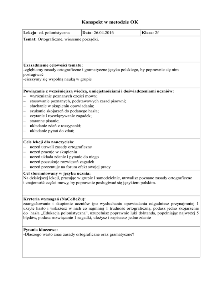 Konspekt w metodzie OK Lekcja: ed. polonistyczna Data: 26.04.2016 Klasa: 2f Temat: Ortograficzne, wiosenne porządki. Uzasadnienie celowości tematu: -zgłębiamy zasady ortograficzne i gramatyczne języka polskiego, by poprawnie się nim posługiwać -cieszymy się wspólną nauką w grupie Powiązanie z wcześniejszą wiedzą, umiejętnościami i doświadczeniami uczniów: wyróżnianie poznanych części mowy; stosowanie poznanych, podstawowych zasad pisowni; słuchanie w skupieniu opowiadania; szukanie skojarzeń do podanego hasła; czytanie i rozwiązywanie zagadek; staranne pisanie; układanie zdań z rozsypanki; układanie pytań do zdań; Cele lekcji dla nauczyciela: uczeń utrwali zasady ortograficzne uczeń pracuje w skupieniu uczeń układa zdanie i pytanie do niego uczeń poszukuje rozwiązań zagadek uczeń prezentuje na forum efekt swojej pracy Cel sformułowany w języku ucznia: Na dzisiejszej lekcji, pracując w grupie i samodzielnie, utrwalisz poznane zasady ortograficzne i znajomość części mowy, by poprawnie posługiwać się językiem polskim. Kryteria wymagań (NaCoBeZu): zaangażowanie i skupienie uczniów (po wysłuchaniu opowiadania odgadniesz przynajmniej 1 ukryte hasło i wskażesz w nich co najmniej 1 trudność ortograficzną, podasz jedno skojarzenie do hasła ,,Edukacja polonistyczna”, uzupełnisz poprawnie luki dyktanda, popełniając najwyżej 5 błędów, podasz rozwiązanie 1 zagadki, ułożysz i zapiszesz jedno zdanie Pytania kluczowe: -Dlaczego warto znać zasady ortograficzne oraz gramatyczne? Materiały i pomoce dydaktyczne: tablica interaktywna, tablica zwykła, kartoniki z hasłami, arkusz szarego papieru, kartki z zagadkami, kartki z tekstem dyktanda, lizaki ortograficzne, zeszyty, kartki z rozsypanką wyrazową, długopisy, mazaki, kredki Przebieg lekcji- zadania, metody, aktywności Zaangażowanie aranżacja otoczenia- ustawienie ławek w kształcie podkowy, uruchomienie tablicy interaktywnej, rozdanie materiałów -ułożenie przed uczniami kopert z rozsypanką wyrazową, lizaków ortograficznych, tekstu dyktanda do uzupełnienia praca uczniów nad mapą myśli z hasłem ,,Edukacja polonistyczna” podanie celu zajęć ,,Na dzisiejszej lekcji, pracując w grupie i samodzielnie, utrwalisz poznane zasady ortograficzne i znajomość części mowy, by poprawnie posługiwać się językiem polskim.” Badanie aktywne słuchanie opowiadania nauczyciela- rozkładanie haseł z trudnością ortograficzną w różnych miejscach sali lekcyjnej po uprzednim ich pokazie, a następnie ich odkrywanie po odgadnięciu przez ucznia, jakie hasło jest ukryte na odwróconej kartce i podanie zawartej w nim trudności ortograficznej Przekształcanie rozpoznawanie dotychczas poznanych części mowy stosowanie zasad ortograficznych w dyktandzie rozwiązywanie zagadek uzupełnianie dyktanda układanie zdania z rozsypanki wyrazowej oraz pytania do niego, zapisanie ich w zeszytach Prezentacja prezentowanie odgadniętych ukrytych haseł prezentowanie za pomocą lizaków ortograficznych uzupełnionych liter dyktanda udzielanie odpowiedzi- rozwiązań zagadek czytanie ułożonych zdań i pytań do nich Refleksja rozdawanie uczniom naklejek jako formy nagrody za poprawnie wykonane zadania i zaangażowanie w pracę po każdym z nich ocena ilości naklejek na koniec zajęć i wypowiedź nauczyciela na forum uczniów i rodziców o każdym zadaniu podanie pytania kluczowego ,,Dlaczego warto znać zasady ortograficzne oraz gramatyczne?” Tekst dyktanda do uzupełnienia: (luki w miejscu podkreślonych liter) Nasza rodzina uwielbia wiosenne wędrówki. Całą czwórką chętnie wyruszamy na rowerową wyprawę do lasu. Mama przygotowuje koszyk pełen smakołyków. Siadamy na kocu i ucztujemy. Wsłuchujemy się w odgłosy przyrody. Podziwiamy śpiew ptaków. Uważnie obserwujemy pracujące mrówki. Zawsze wracamy do domu z uśmiechem na ustach. ZAGADKI ORTOGRAFICZNE Krokus Młody juhas w górach chwycił się za głowę, gdy zobaczył w śniegu kwiaty fioletowe. Kukułka Słychać ją wokoło wśród sosen i buków, jak woła wesoło: kuku, kuku, kuku! Pietruszka Każdy z was odgadnie łatwo tę zagadkę, ma bielutki korzeń i zieloną natkę. Tulipan Jak ten kwiatek się nazywa, co słowo „pan” w nazwie ukrywa? Jaskółka Nie ma lepszej lotniczki, Ogon niczym nożyczki. W powietrzu toczy kółka, kto to taki? Wiewiórka Spała w dziuplę wtulona Pod kołderką z ogona. Obudziła ją wiosna, Teraz skacze po sosnach. Zdania do ułożenia z rozsypanki wyrazowej: Wiosną przyroda budzi się do życia. Jaskółka buduje gniazdo pod dachem. Tulipany to niezwykle piękne kwiaty. Hasła do opowiadania- burza, ulewa, kałuża, deszczówka, wysuszyć