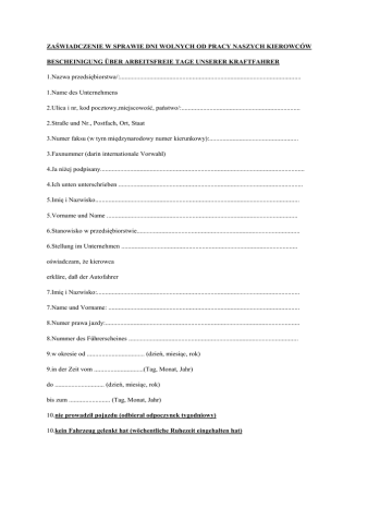 ZAŚWIADCZENIE W SPRAWIE DNI WOLNYCH OD PRACY NASZYCH KIEROWCÓW BESCHEINIGUNG ÜBER ARBEITSFREIE TAGE UNSERER KRAFTFAHRER 1.Nazwa przedsiębiorstwa/:.............................................................................................................. 1.Name des Unternehmens 2.Ulica i nr, kod pocztowy,miejscowość, państwo/:........................................................................ 2.Straße und Nr., Postfach, Ort, Staat 3.Numer faksu (w tym międzynarodowy numer kierunkowy):...................................................... 3.Faxnummer (darin internationale Vorwahl) 4.Ja niŜej podpisany............................................................................................................................ 4.Ich unten unterschrieben ................................................................................................................ 5.Imię i Nazwisko............................................................................................................................ 5.Vorname und Name .................................................................................................................... 6.Stanowisko w przedsiębiorstwie................................................................................................... 6.Stellung im Unternehmen ........................................................................................................... oświadczam, Ŝe kierowca erkläre, daß der Autofahrer 7.Imię i Nazwisko:........................................................................................................................... 7.Name und Vorname: .................................................................................................................... 8.Numer prawa jazdy:...................................................................................................................... 8.Nummer des Führerscheines ....................................................................................................... 9.w okresie od ................................... (dzień, miesiąc, rok) 9.in der Zeit vom ..............................(Tag, Monat, Jahr) do .............................. (dzień, miesiąc, rok) bis zum ......................... (Tag, Monat, Jahr) 10.nie prowadził pojazdu (odbierał odpoczynek tygodniowy) 10.kein Fahrzeug gelenkt hat (wöchentliche Ruhezeit eingehalten hat) 11.W imieniu przedsiębiorstwa, miejscowość ................................, data........................................ podpis................................................................. 11. Im Namen des Unternehmens, Ort ..........................................., Datum .................................. Unterschrift ....................................................... 12. Ja, jako kierowca, zaświadczam, Ŝe w wyŜej wymienionym okresie nie prowadziłem pojazdu (odbierałem odpoczynek tygodniowy) 12. Ich, als Autofahrer, bescheinige, daß ich in der oben genannten Zeit kein Fahrzeug gelenkt habe (daß ich wöchentliche Ruhezeit eingehalten habe) . Miejscowość..............................., data.................., podpis kierowcy.............................................. Ort .............................................., Datum ............., Unterschrift des Autofahrers ......................... ........................................................... Pieczątka firmy i podpis ........................................................... Firmenstempel und Unterschrift Za w/w okres kierowca nie moŜe okazać się wykresówkami. Für die oben genannte Zeitdauer kann der Autofahrer keine Schaublätter vorlegen.