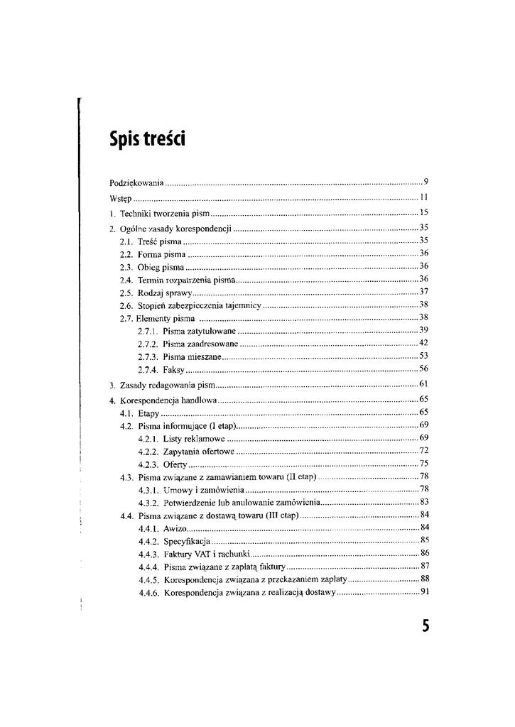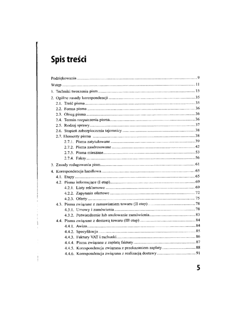 Spis treści Podziękowania Wstęp 1. Techniki tworzenia pism 1 2. Ogólne zasady korespondencji 2.1. Treść pisma 2.2. Forma pisma 2.3. Obieg pisma 2.4. Termin rozpatrzenia pisma 2.5. Rodzaj sprawy 2.6. Stopień zabezpieczenia tajemnicy 2.7. Elementy pisma 2.7.1. Pisma zatytułowane 2.7.2. Pisma zaadresowane 2.7.3. Pisma mieszane 2.7.4. Faksy 3 3 3 3 3 3 3 3 3 4 5 5 3. Zasady redagowania pism 6 4. Korespondencja handlowa 4.1. Etapy 4.2. Pisma informujące (I etap) 4.2.1. Listy reklamowe 4.2.2. Zapytania ofertowe 4.2.3. Oferty 4.3. Pisma związane z zamawianiem towaru (II etap) 4.3.1. Umowy i zamówienia 4.3.2. Potwierdzenie lub anulowanie zamówienia 4.4. Pisma związane z dostawą towaru (III etap) 4.4.1. Awizo 4.4.2. Specyfikacja 4.4.3. Faktury VAT i rachunki 4.4.4. Pisma związane z zapłatą faktury 4.4.5. Korespondencja związana z przekazaniem zapłaty 4.4.6. Korespondencja związana z realizacją dostawy 6 6 6 6 7 7 7 4.5. Pisma związane z weryfikacją dostawy (IV etap) 4.5.1. Reklamacje 4.5.2. Odpowiedzi na reklamacje 96 96 98 5. Korespondencja finansowa 5.1. Rozliczenia bankowe 5.2. Zasady obliczania wynagrodzenia 5.2.1. Przykłady wyliczenia wynagrodzenia 5.3. Obowiązki podatkowe 5.3.1. Pobór zaliczek na podatek 5.3.2. Zeznania podatkowe 101 101 103 104 107 107 113 6. Dokumentacja kasowa 6.1. Zasady ogólne gospodarki kasowej 6.2. Raport kasowy 6.3. Zawód - kasjer 6.3.1. Wymagania kwalifikacyjne 6.3.2. Etyka zawodowa 6.3.3. Odpowiedzialność materialna 115 115 116 119 119 119 119 7. Dokumentacja osobowa 7.1. Zasady prowadzenia akt osobowych 7.2. Zasady prowadzenia dokumentacji oraz ewidencji zatrudnienia i czasu pracy 7.3. Zasady prowadzenia dokumentacji i ewidencji wynagradzania oraz innych świadczeń pracowniczych 7.4. Dokumentacja i ewidencja ubezpieczeń społecznych 7.5. Korespondencja osobowa 7.5.1. Korespondencja związana z przyjmowaniem pracownika 7.5.2. Korespondencja występująca w czasie trwania stosunku pracy 7.5.3. Korespondencja dotycząca rozwiązania stosunku pracy 125 125 8. Ogólna korespondencja biurowa 8.1. Pełnomocnictwa i upoważnienia 8.2. Zaświadczenia 8.3. Zawiadomienia 8.4. Protokoły i załączniki 8.4.1. Protokół zebrania 8.4.2. Protokoły zdawczo-odbiorcze 8.4.3. Protokół uzgodnień i rozbieżności 171 171 175 176 177 178 190 192 6 128 131 133 134 134 153 162 Spis treści 8.4.4. Protokół porozumienia 8.4.5. Inne protokoły 8.5. Sprawozdania 8.6. Notatki 8.7. Raport 8.8. Listy intencyjne 8.9. Pisma przewodnie 8.10. Umowy 8.11. Decyzje 8.12. Akty prawne 8.12.1. Wewnętrzne akta normatywne 8.13. Pisma grzecznościowe 8.14. Inne pisma biurowe 193 194 195 198 199 203 206 207 211 212 216 232 238 9. Zasady korespondencji w językach obcych 9.1. Korespondencja według norm amerykańskich 9.2. Korespondencja według norm brytyjskich 9.3. Korespondencja w języku niemieckim 9.4. Korespondencja w języku francuskim 9.5. Korespondencja w języku rosyjskim 9.6. Korespondencja w języku hiszpańskim 9.7. Korespondencja w języku włoskim 9.8 Zakończenie 245 245 251 259 267 271 275 281 288 10. Standaryzacja dokumentów 289 11. Korespondencja elektroniczna 11.1. Poprawność językowa i estetyczny wygląd pisma 11.2. Właściwa forma pisma 11.3. Umiejętne nawiązywanie kontaktu z odbiorcą 11.4. Zwroty grzecznościowe w nagłówku 11.5. Kilka ważnych rad dotyczących wysyłania e-maili 291 291 292 292 292 292 Bibliografia 295 7