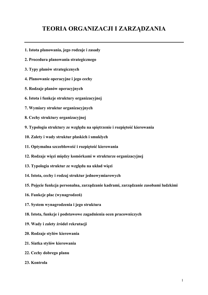 TEORIA ORGANIZACJI I ZARZĄDZANIA 1. Istota planowania, jego rodzaje i zasady 2. Procedura planowania strategicznego 3. Typy planów strategicznych 4. Planowanie operacyjne i jego cechy 5. Rodzaje planów operacyjnych 6. Istota i funkcje struktury organizacyjnej 7. Wymiary struktur organizacyjnych 8. Cechy struktury organizacyjnej 9. Typologia struktury ze względu na spiętrzenie i rozpiętość kierowania 10. Zalety i wady struktur płaskich i smukłych 11. Optymalna szczeblowość i rozpiętość kierowania 12. Rodzaje więzi między komórkami w strukturze organizacyjnej 13. Typologia struktur ze względu na układ więzi 14. Istota, cechy i rodzaj struktur jednowymiarowych 15. Pojęcie funkcja personalna, zarządzanie kadrami, zarządzanie zasobami ludzkimi 16. Funkcje płac (wynagrodzeń) 17. System wynagrodzenia i jego struktura 18. Istota, funkcje i podstawowe zagadnienia ocen pracowniczych 19. Wady i zalety źródeł rekrutacji 20. Rodzaje stylów kierowania 21. Siatka stylów kierowania 22. Cechy dobrego planu 23. Kontrola 1 1.Istota planowania, jego rodzaje i zasady Planowanie polega na ustalaniu celu działalności, zasobów niezbędnych do ich realizowania oraz metod działania, inaczej mówiąc strategii. Opartych na identyfikacji i analizie obecnych i przewidywanych przyszłych warunków. Plany dzielimy na: Całościowe – dotyczą celów i sposobów funkcjonowania całej instytucji Odcinkowe – odnoszące się do celów i sposobów prowadzenia działalności w dających się racjonalnie wyodrębnić obszarach np. funkcjonalnym. Kompleksowe – w których właściwy przedział działania obejmuje nie cała instytucję lecz kilka powiązanych obszarów działania Za względu na rygory czasu dzielimy na: -długookresowe (strategiczne są one podstawą działania firmy) -średnio okresowe (kwartał do roku) - krótko okresowe (bieŜące, miesięczne, tygodniowe, do roku). W dłuŜszym okresie czasu ich opracowanie odgrywa szczególnie waŜna rolę w sytuacji gdy w działalności firmy zaangaŜowane są znaczne środki finansowe, a wycofanie się z działalności w krótkim czasie jest niemoŜliwe.Zasady planowania: -zasada chronologicznej kolejności planowania i działania: wymaga by wszystkie lub przynajmniej istotne działania w instytucji były poprzedzone planem rozumianym jako decyzja o zamierzonych celach oraz sposobach ich osiągania zasada hierarchiczności planowania wymaga by z planów o szerokim przedziale rzeczowym (całościowych) i czasowym (długookresowych) były wprowadzane plany o węŜszym przedziale rzeczowym (plany kompleksowe i odcinkowe) oraz czasowym (plany średnio i krótkookresowe). Przeciwny sposób jest postępowania jest nieracjonalny i niesprawny -zasada adekwatności planowania do aktualnych i przewidywanych warunków oznacza , Ŝe proces sporządzania planów musi bezwzględnie opierać się na analizie i prognozowaniu obecnych i przyszłych warunków -zasada współdziałania kompetentnych podmiotów planujący nie moŜe opierać się tylko na swojej wiedzy , musi on wykorzystywać takŜe wiedzę innych podmiotów. Współdziałanie oznacza systematyczną wymianę informacji, wzajemne udostępnianie wiedzy, wzajemne opiniowanie planów i przesłanek ich sporządzania, uzgadnianie parametrów -poparcie ze strony naczelnego kierownictwa JeŜeli kierownictwo będzie dostrzegać planowanie jako działanie formalne a nie merytoryczne to planowanie nie będzie odgrywać skutecznej roli w zarządzaniu. -Zasada integracji planowania i kontroli We współczesnych realiach zarządzania planowanie jako formułowanie celów oraz sposobów ich osiągania musi być uzupełnione wdroŜeniem planów, sprawdzeniem tego czy i w jaki stopniu przynoszą one oczekiwane rezultaty, a takŜe korekta działania w razie odchyleń od planów. 2.Procedura planowania strategicznego Planowanie strategiczne jest szczególnym rodzajem planowania o określonych cechach: -określa ono globalny program działania instytucji ze względu na jej specyfikę -jest działaniem kompleksowym polegającym na 2 identyfikacji, analizowaniu i prognozowaniu bardzo wielu czynników wewnętrznych i zewnętrznych oraz formułowaniu globalnych celów instytucji i sposobów ich osiągania, ograniczonych jednak dąŜeniem do spełnienia określonych potrzeb i oczekiwań nabywców -wyznacza pozycje organizacji w otoczeniu konkurencyjnym -jest nadrzędne w stosunku do pozostałych planów instytucji i wyznacza ramy do ich sporządzania -planowanie strategiczne ma zasadniczo charakter jakościowy. Zasady planowania strategicznego: - otwartość orientacja globalna – kompleksowość – orientacja na przyszłość – kreatywność – orientacja na wyniki – współdziałanie Procedura planowania strategicznego System wartości i zapatrywania naczelnego kierownictwa, warunki otoczenia, długoterminowe zmiany przedsiębiorstw, strategiczna analiza przedsiębiorstwo i jego otoczenie, określenie strategii: poszukiwanie formułowanie i ocena strategii, wdroŜenie strategii określenie środków i celów, Strategiczna strategii: Określenie WdroŜenie strategii: Strategiczna analiza: Długoterminowe strategiczna kontrola 3. Typy planów strategicznych W ramach planowania strategicznego wyróŜnia się określone rodzaje planów róŜniące się przedziałem rzeczowym (podmiotowym): całościowe (globalne) plany strategiczne instytucji dotyczące całej instytucji w przyjętym, długim horyzoncie czasu : odpowiadają na pytanie czym chce być organizacja (produkty, rynki, odbiorcy, skala działalności) przedmiotowych obszarów działalności (branŜ), dotyczące wyodrębnionych rodzajów działalności prowadzonych przez instytucję; tak zwane strategie obszarów działalności koncentrują się na problemie jak najsprawniej działać w wyznaczonych obszarach, jak być konkurencyjnym. Nie występują one w przypadku małych organizacji jedno produktowych funkcjonalne , dotyczące sposobów wspoma